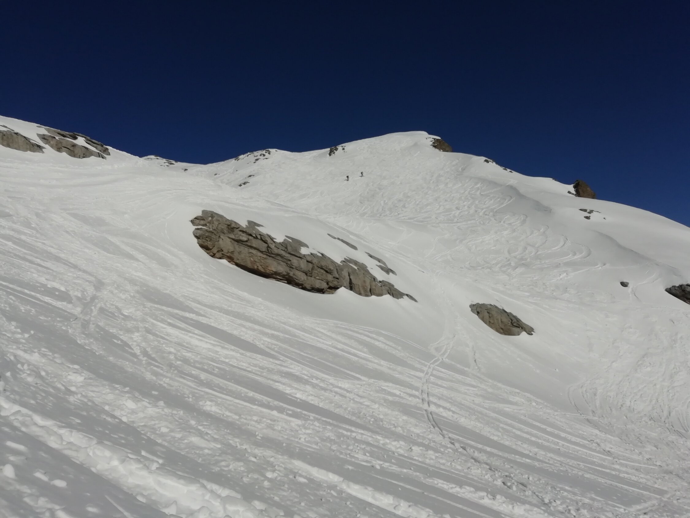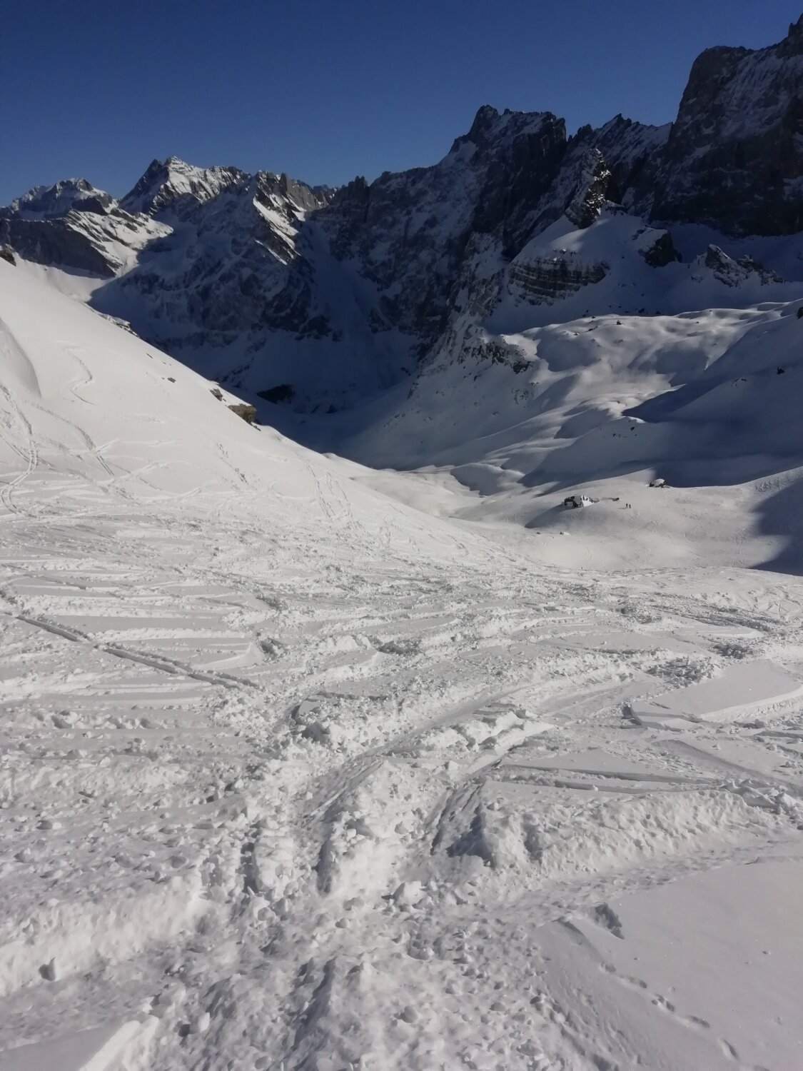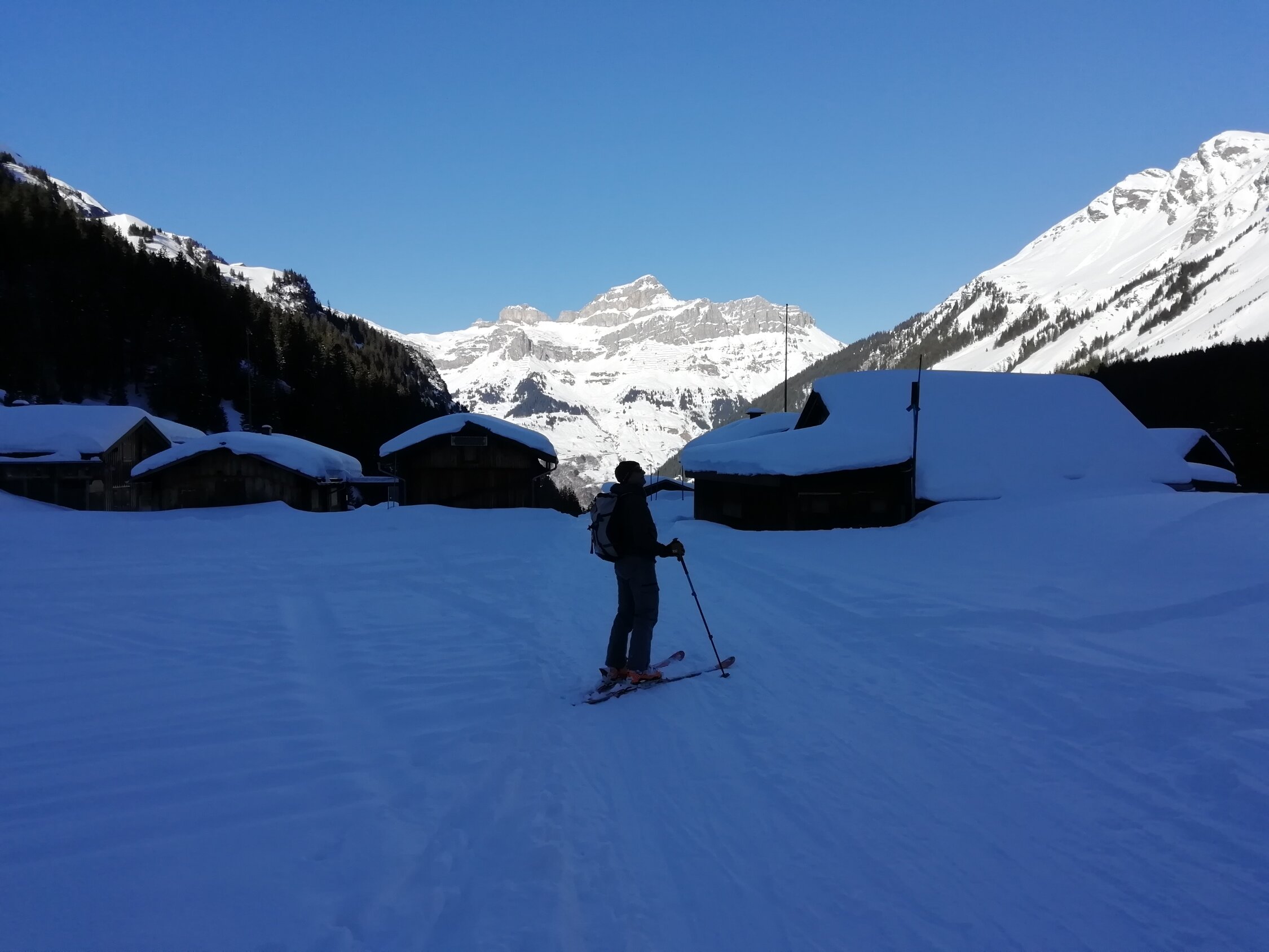 Gute Spuren (viele Varianten!) für den Aufstieg, Südhang vor Gipfel etwas glatt (Pulver rutscht auf Harsch gerne weg), aber ohne Harscheisen machbar. Abfahrt in gutem Pulver überall da, wo der Wind nicht gewirkt hat (Mulden, Rinnen). Bestes Stück war zwischen Flösch und Brunni. Im Griestal ziemlich verblasen, ganzer Tag starker Westwind.
