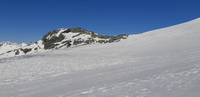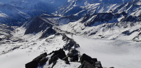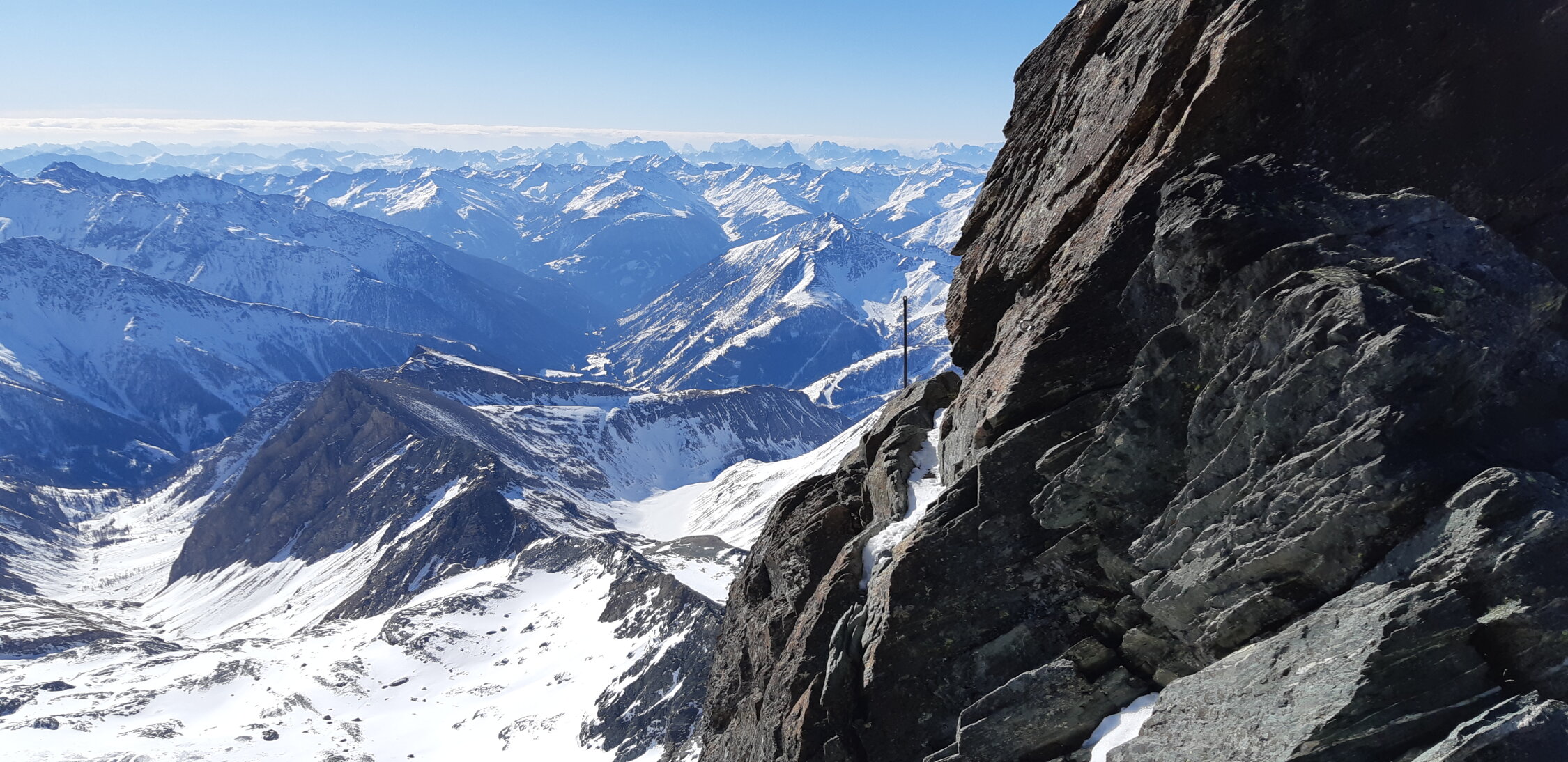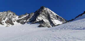 Grat bis auf blanken Stein freigeblasen, sodass der Anstieg bis knapp 3700 m ohne Eisen möglich war. Fels sonnseitig handwarm. Abstieg über Normalweg in breiter Spur mit wenig Schnee. Glocknerleitl erschreckend ausgeapert. Ebenfalls sehr wenig Schnee. Gesamter Nordwestgrat sowie Glocknerwand freigeblasen. Guter Trittschnee in Grögerrinne. Bei der Abfahrt Firntendenz unter 3000 m. Teischnitzkees Spaltenbrücken erkennbar.