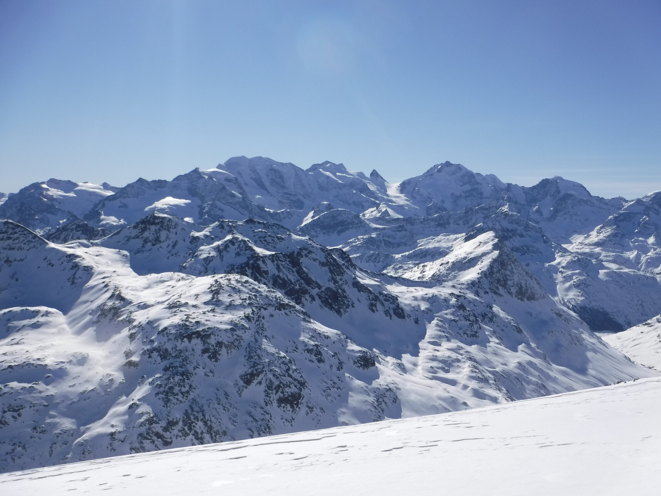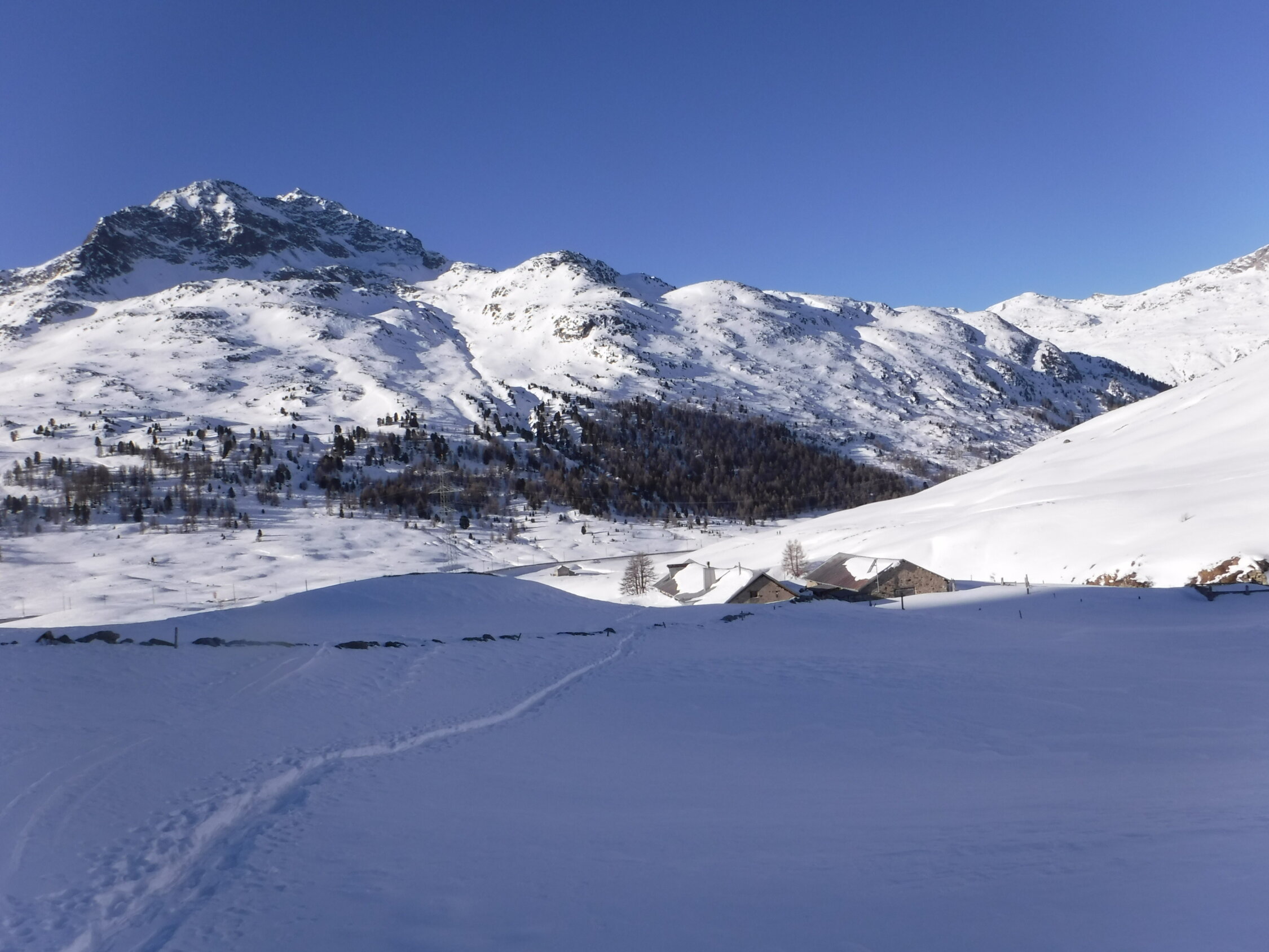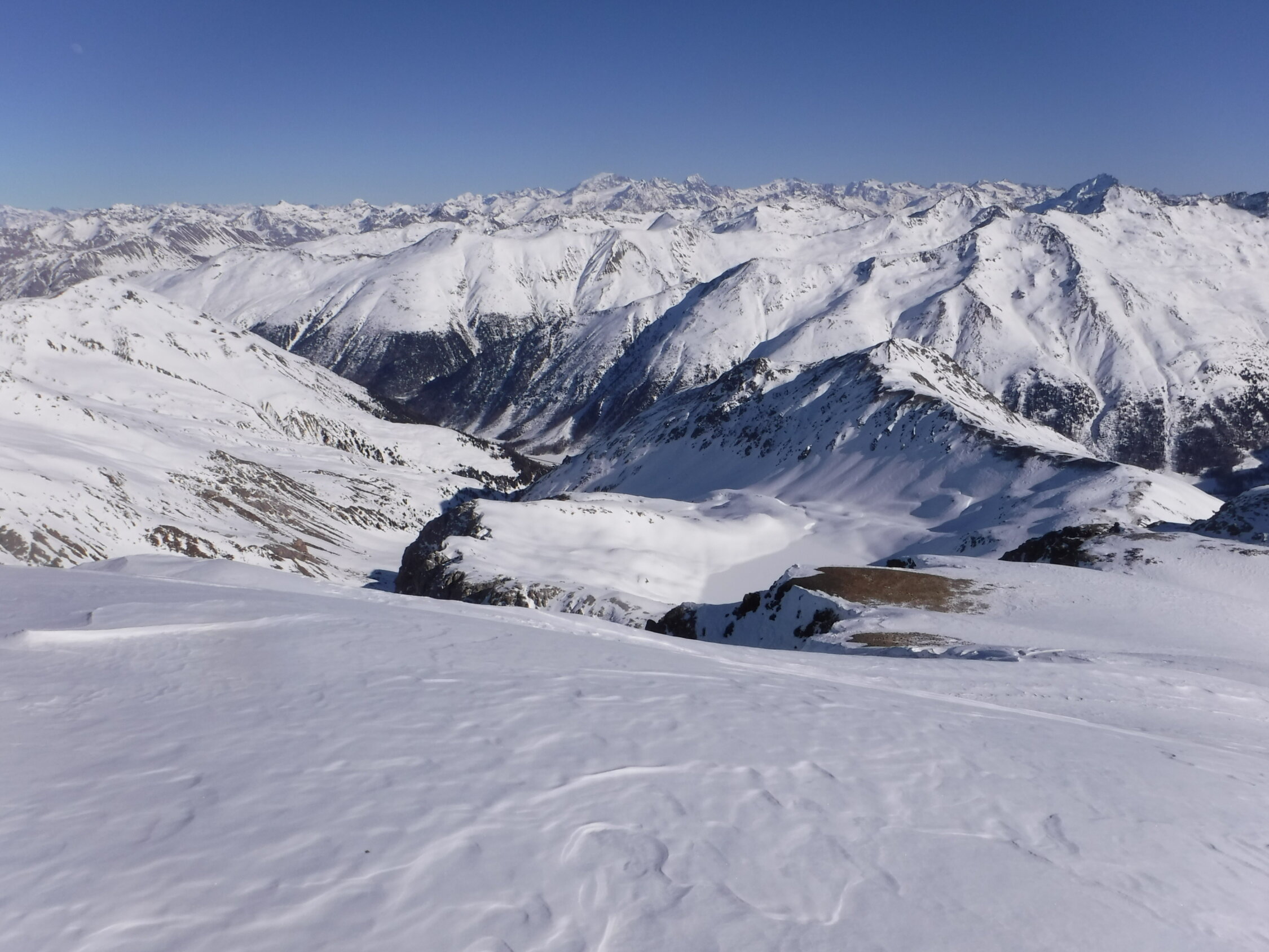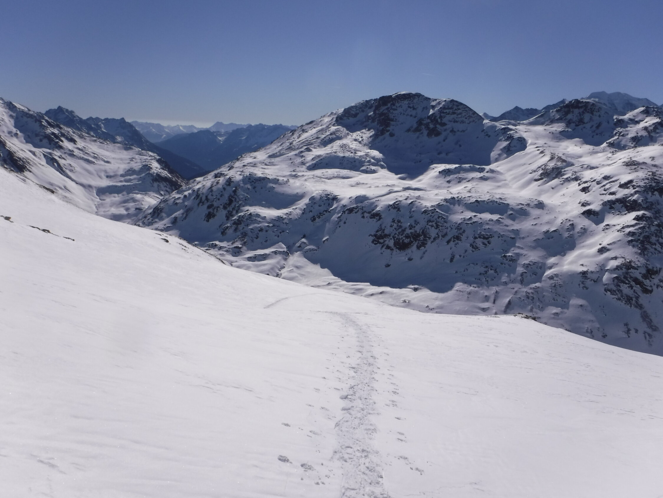 Lange Tour zum Grenzkamm zwischen dem zollfreien Gebiet von Livigno und Oberengadin. Rundumsicht: die nahe Bernina-Gruppe im Südwesten, Corno di Campo im Südosten, Piz Güglia im Norden. Im Osten (Südtirol): die Ortler-Gruppe und Weißkugel.