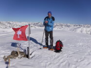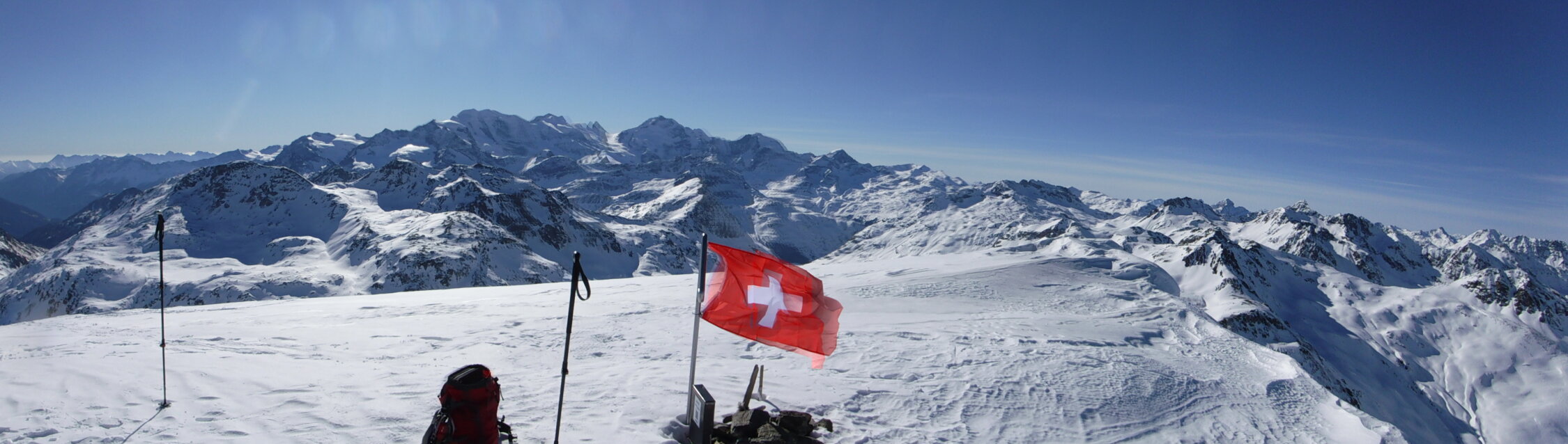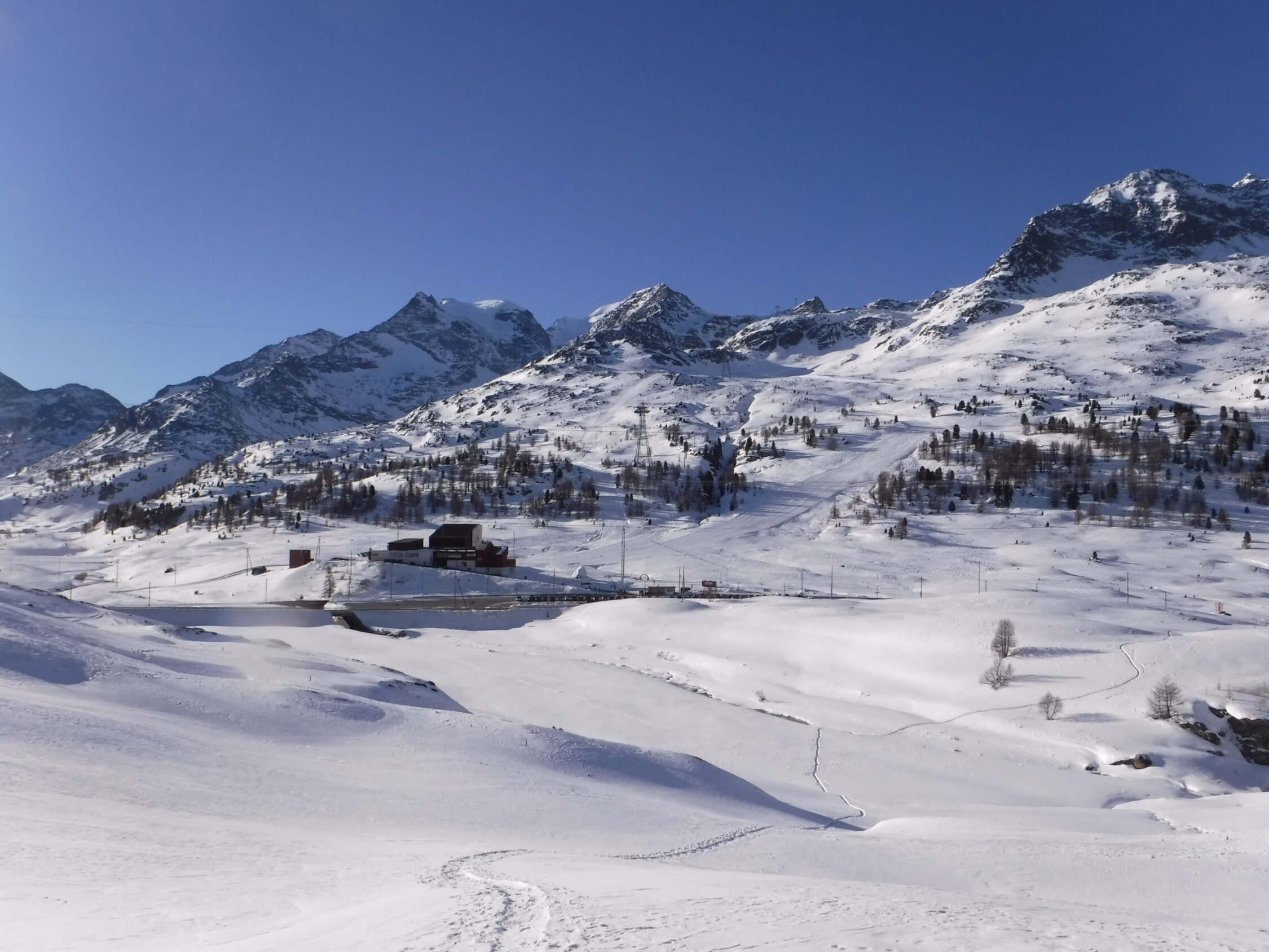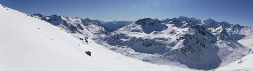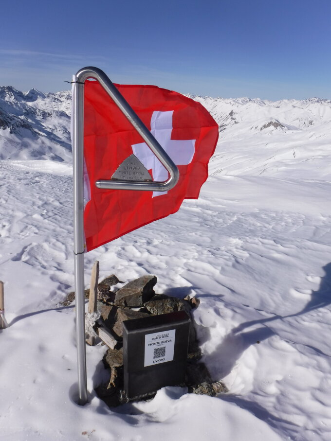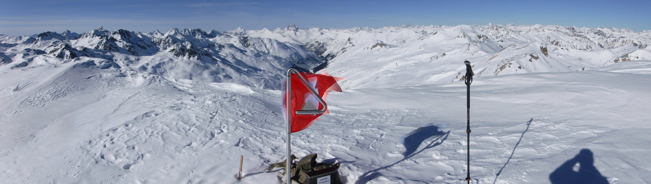 Lange Tour zum Grenzkamm zwischen dem zollfreien Gebiet von Livigno und Oberengadin. Rundumsicht: die nahe Bernina-Gruppe im Südwesten, Corno di Campo im Südosten, Piz Güglia im Norden. Im Osten (Südtirol): die Ortler-Gruppe und Weißkugel.
