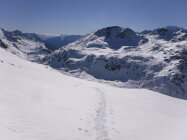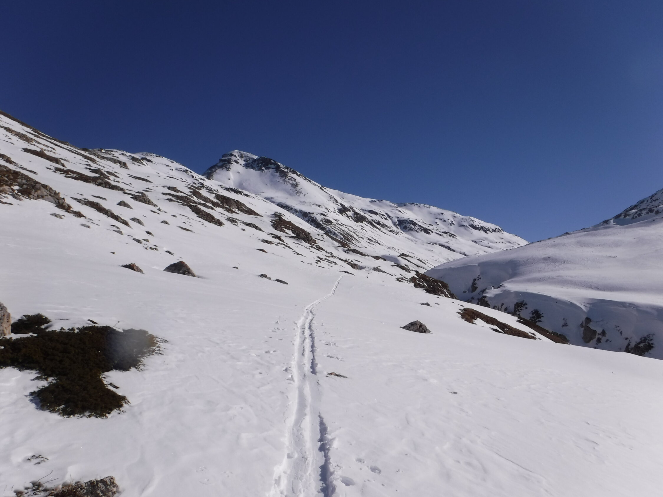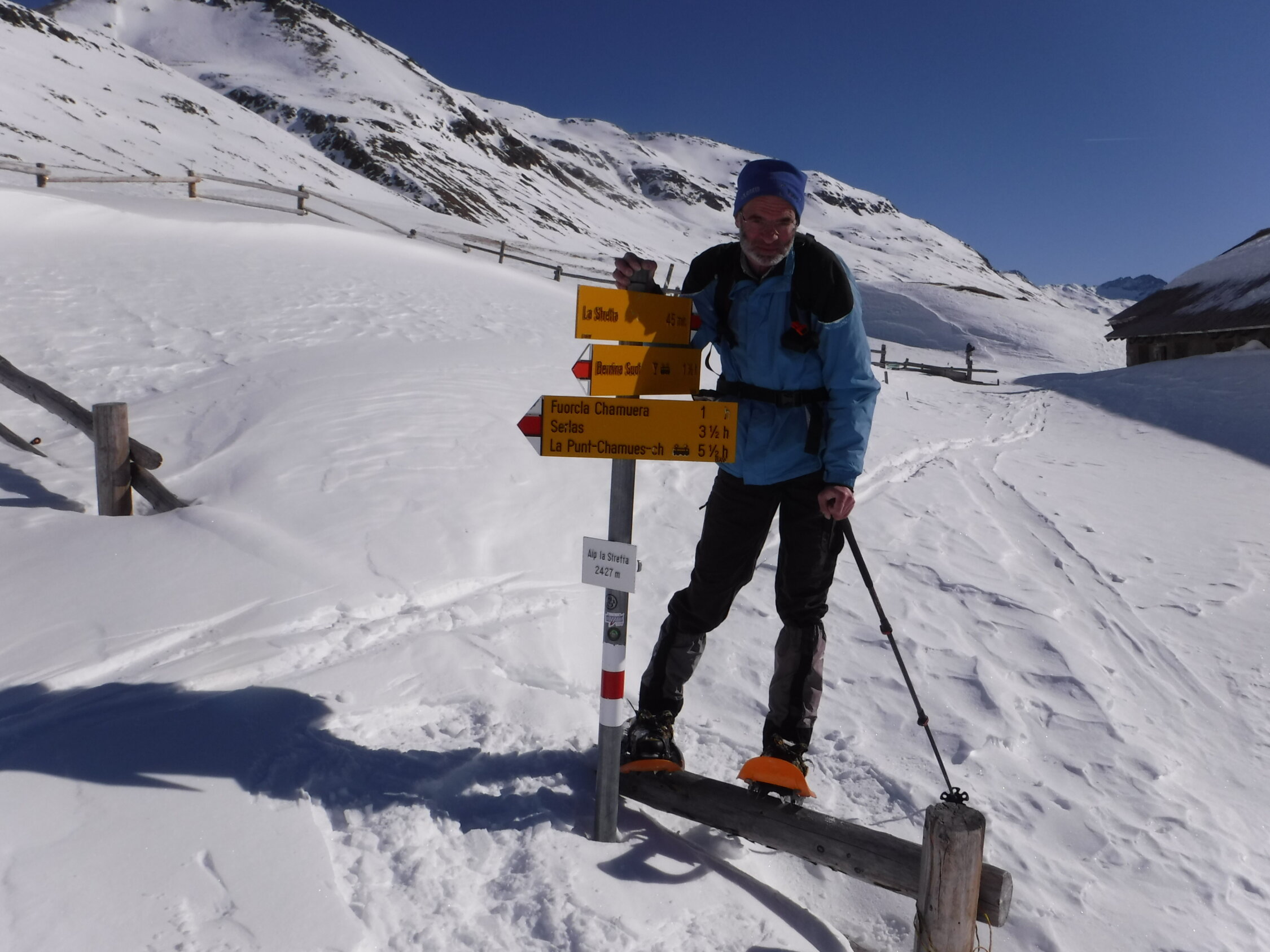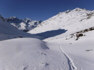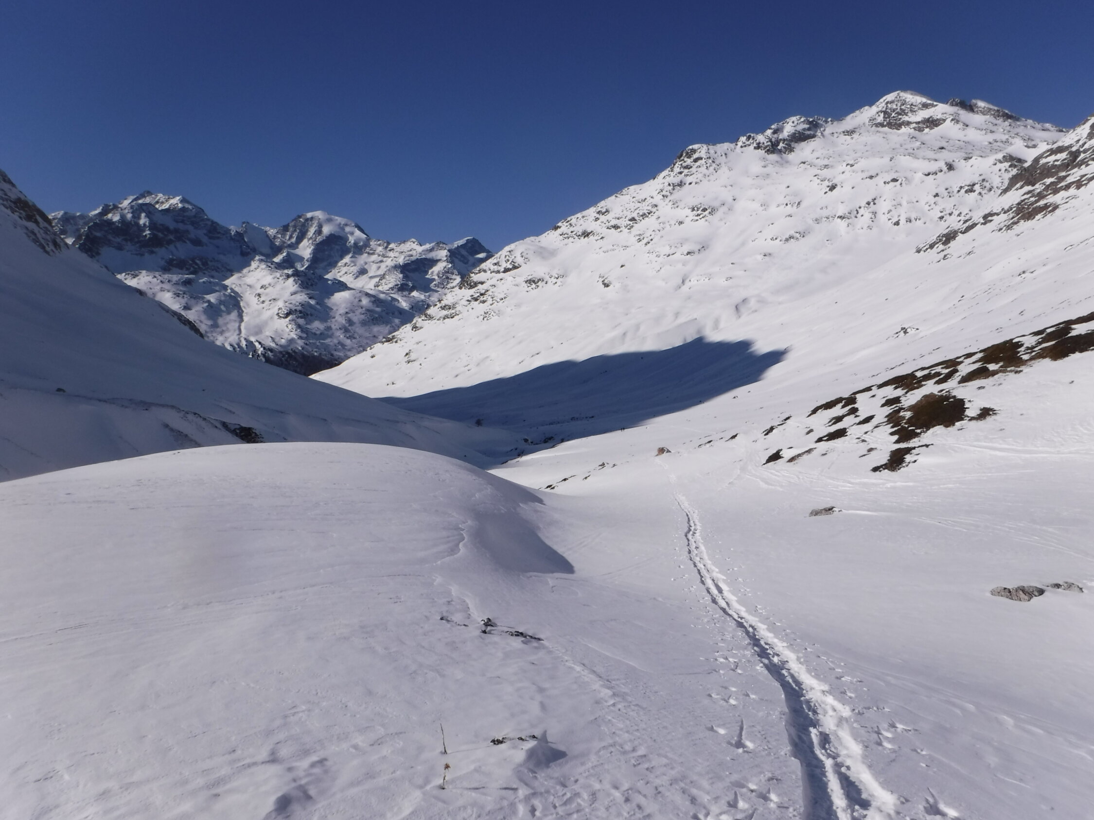 Tourenbeginn um 09:00 Uhr bei -17°C unter klarem Himmel. Vor mir spurten 5 Skitourengänger. 2 bogen rechts ab in Richtung Piz Minor, bzw. Piz Alv. Ein Pärchen bog links ab in Richtung Piz dal Fain. Ich hatte das Glück, einer frischen Skispur bis hinauf zum Gipfel folgen zu können. Bis ca. 2500 m herrschte Bruchharst, welcher stellenweise nicht hielt. Weiter höher herrschte noch Pulver vor. Sämtliche südseitigen Bergflanken waren inzwischen schneefrei, so dass die Lawinengefahr gering war. Auf den fast ebenen Passagen zwischen Alp la Stretta und Pascul da la Stretta Dadains gab immer wieder mal der Schneedeckel unter der Schneeschuhlast nach mit den typischen Setzungsgeräuschen, die einen anfangs erschrecken lassen.