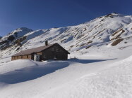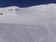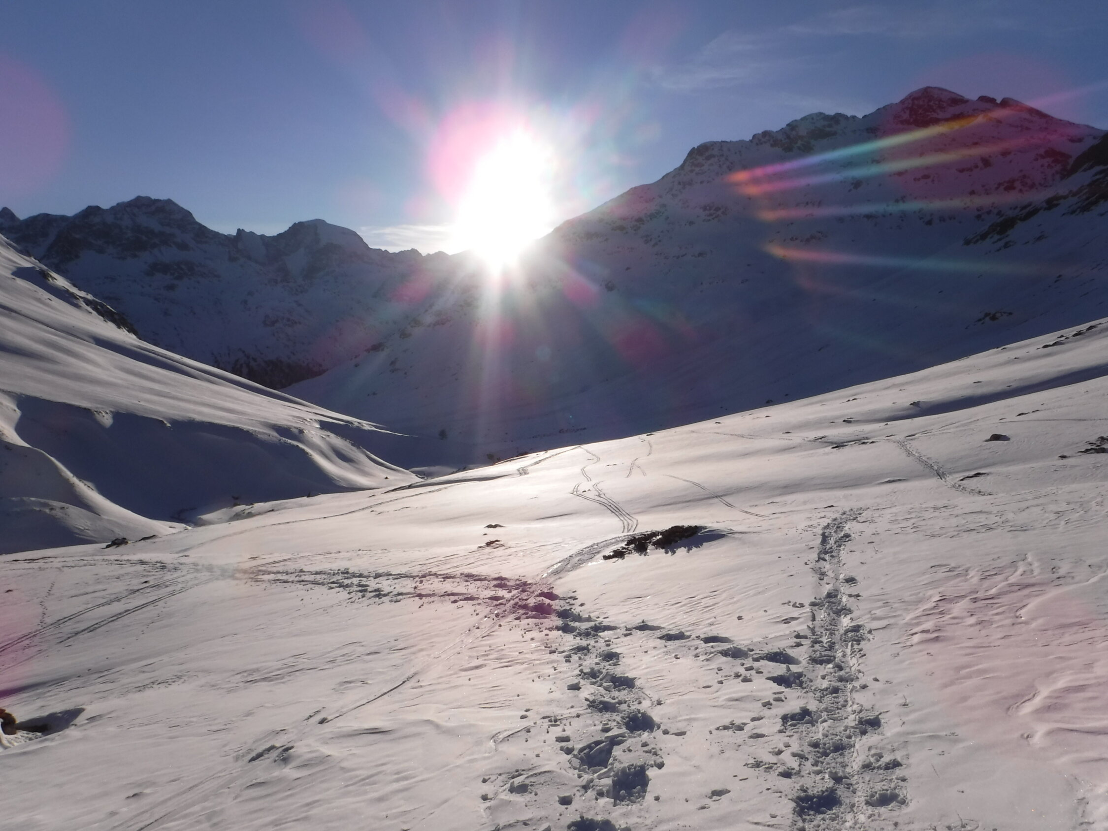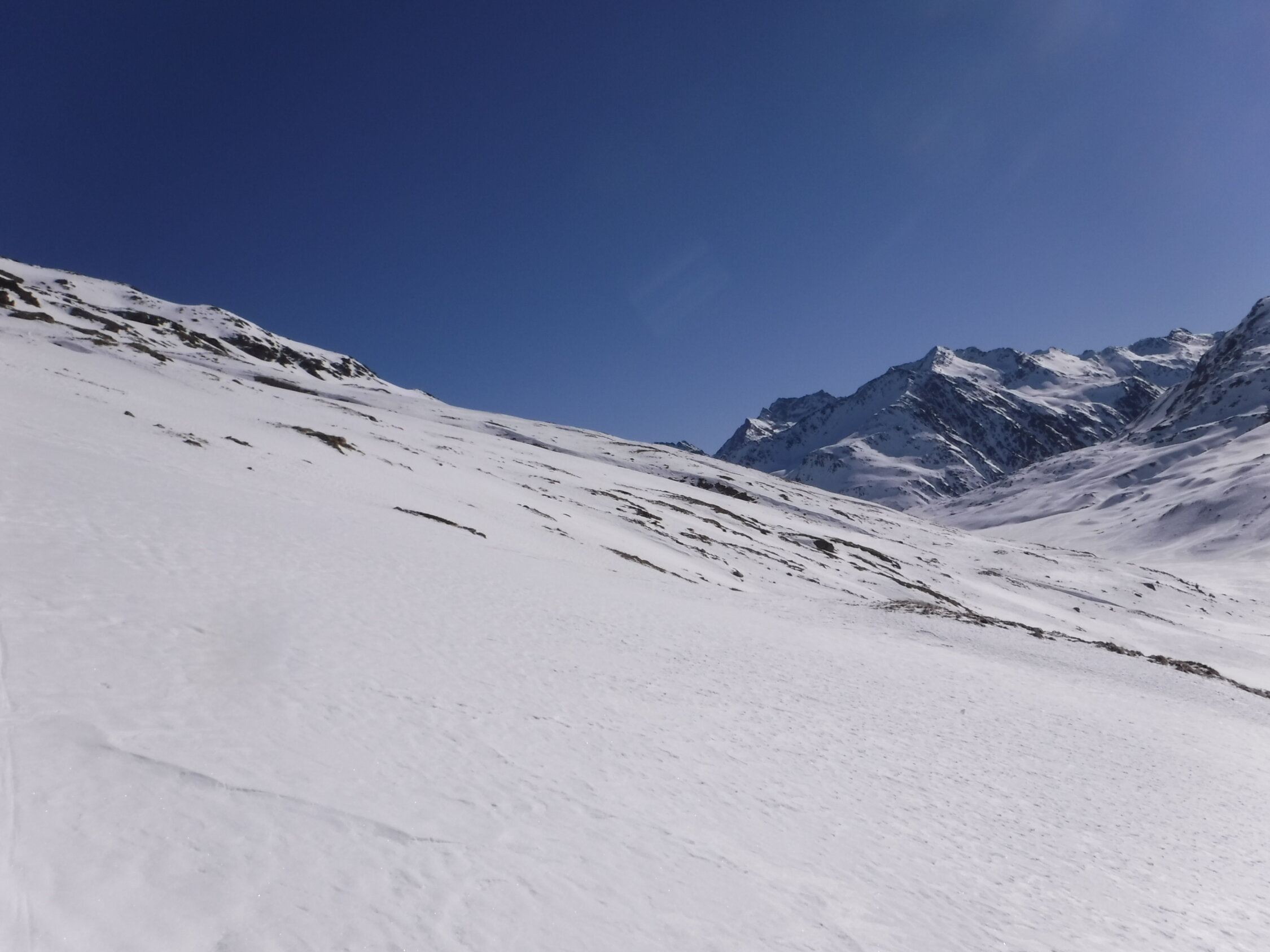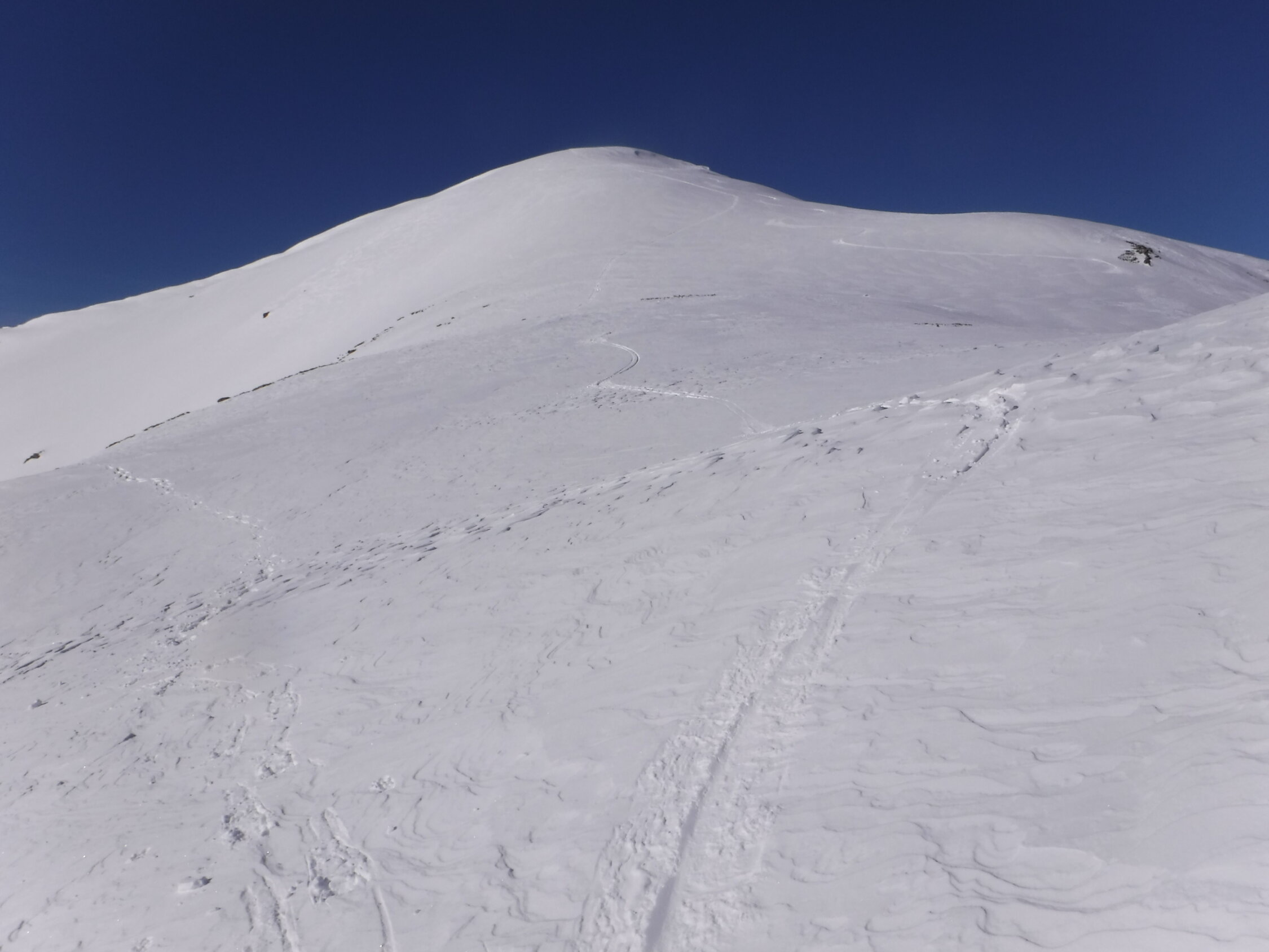 Tourenbeginn um 09:00 Uhr bei -17°C unter klarem Himmel. Vor mir spurten 5 Skitourengänger. 2 bogen rechts ab in Richtung Piz Minor, bzw. Piz Alv. Ein Pärchen bog links ab in Richtung Piz dal Fain. Ich hatte das Glück, einer frischen Skispur bis hinauf zum Gipfel folgen zu können. Bis ca. 2500 m herrschte Bruchharst, welcher stellenweise nicht hielt. Weiter höher herrschte noch Pulver vor. Sämtliche südseitigen Bergflanken waren inzwischen schneefrei, so dass die Lawinengefahr gering war. Auf den fast ebenen Passagen zwischen Alp la Stretta und Pascul da la Stretta Dadains gab immer wieder mal der Schneedeckel unter der Schneeschuhlast nach mit den typischen Setzungsgeräuschen, die einen anfangs erschrecken lassen.