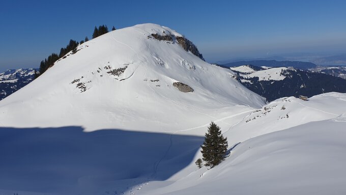 Alles Pulverschnee. Spur bis zum Gipfel und weiter zum Rütistein. Abstieg im Pulverschnee war schon fast ein Abgleiten. Ab der Druesberghütte lieh ich mir ein Gämel. Dies sparte Zeit und brachte für den Tag noch etwas Geschwindigkeitsrausch.