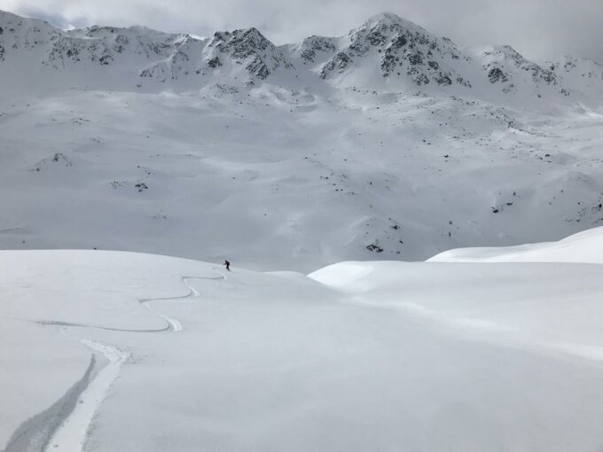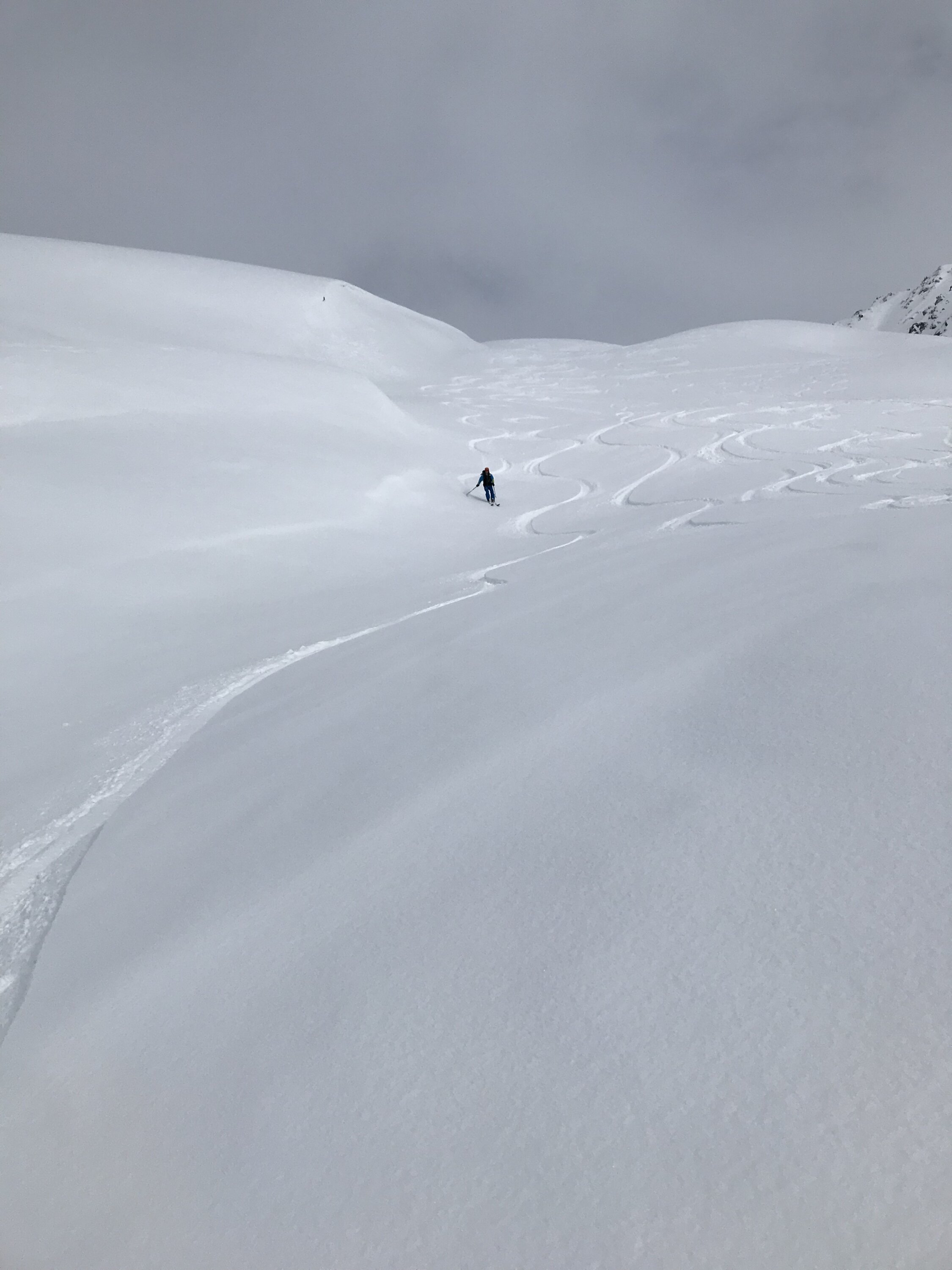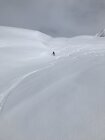 Gute Verhältnisse, oben 10-15 cm Neuschneeauflage. Unterlage wechselhaft. Im unteren Teil mit Ski z.T. ruppig. Mit Board aber recht gut zu fahren. Nicht mal 10 Personen auf der gleichen Route. Schön ruhig. Im Aufstieg teilweise diffuse Lichtverhältnisse. In der Abfahrt dann gutes Licht und schöne Stimmung.