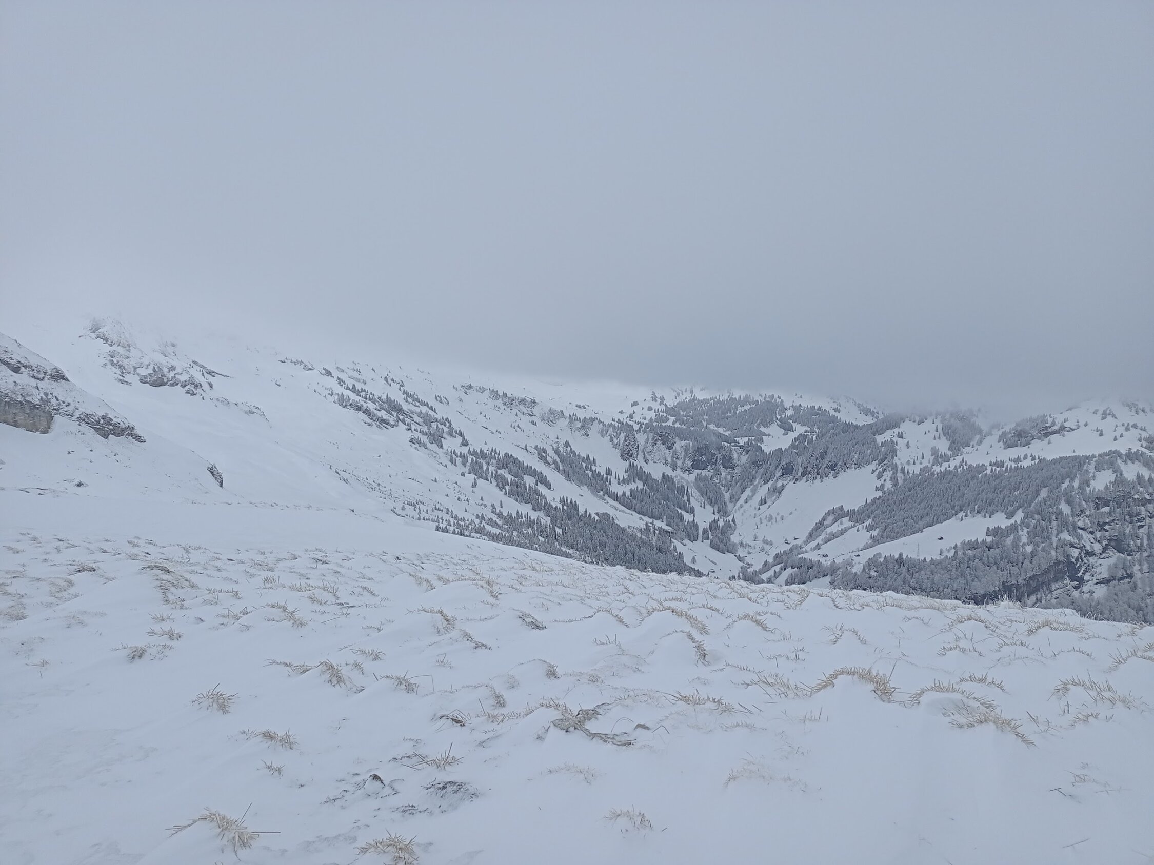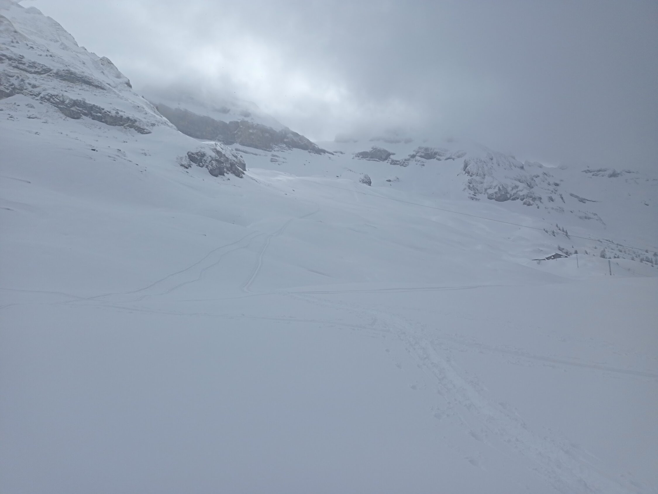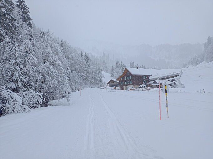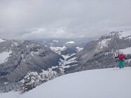 Angepeiltes Ziel war der Rütistein. Der Gipfelbereich war sehr abgeblasen und Nebel kam auf da haben wir zum Pfannenstöckli abgeschwenkt. Auch dort starker Wind und ohne Rast direkt im Pulverschnee in die Druesberghütte abgefahren. Ab ca. 1800 hat der Wind alles leergefegt, darunter schöne Pulverauflage von ca. 10-20cm. Andere Personen sind bis zum Rütistein aufgestiegen, sicher machbar.