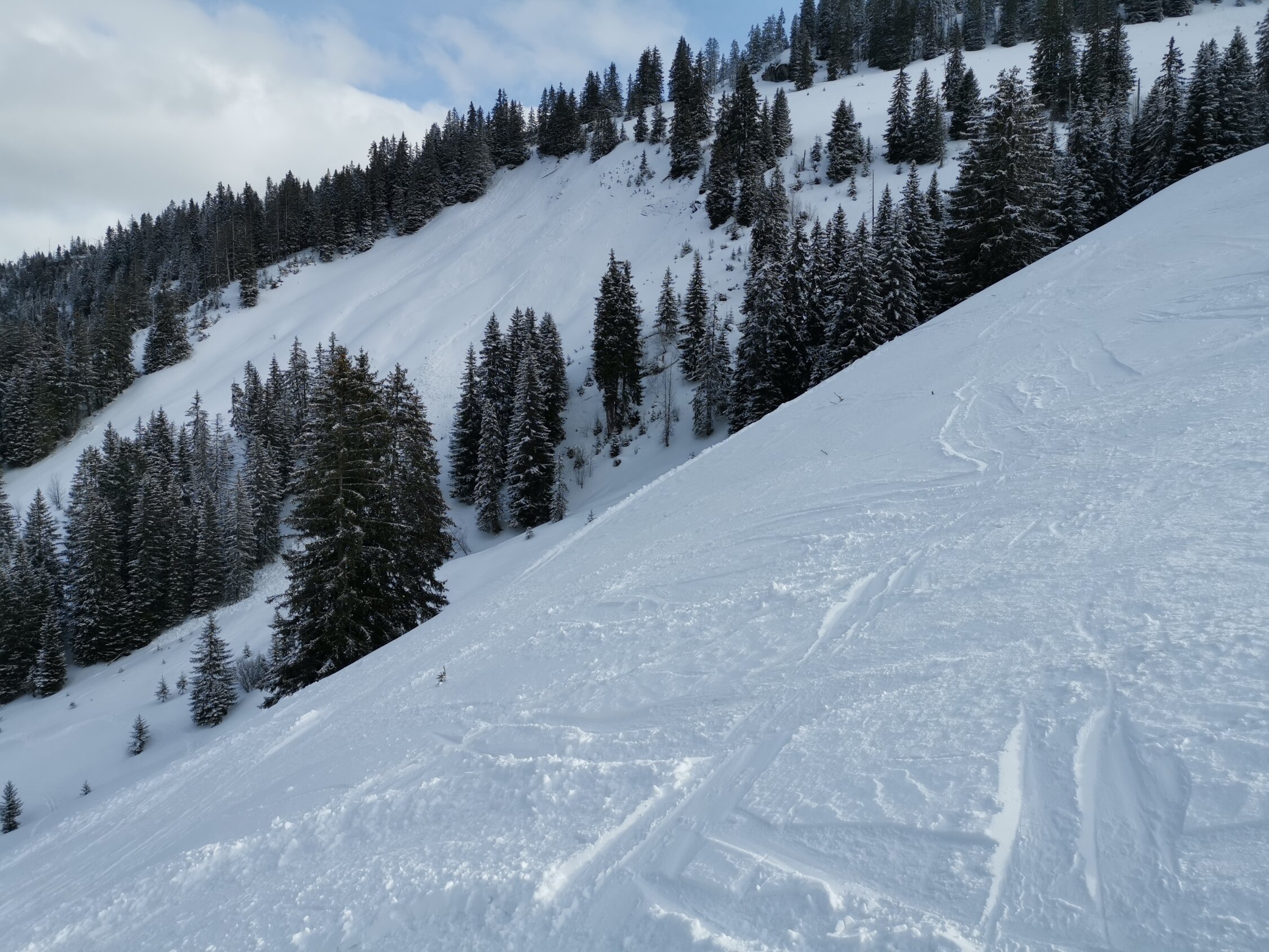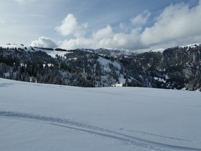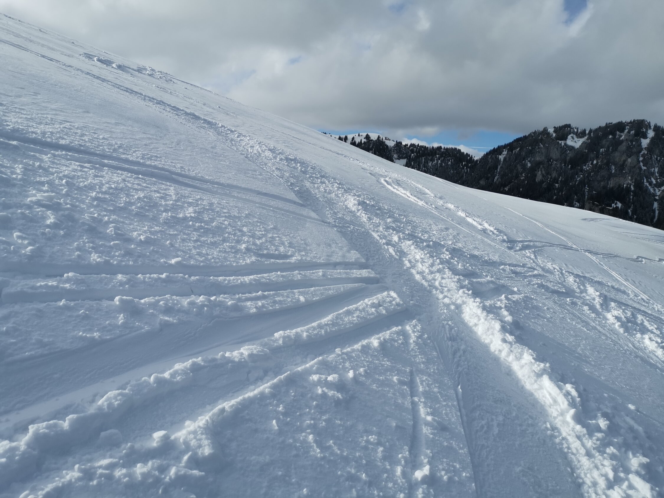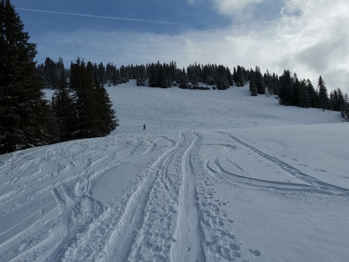 Erstaunlich wenige Autos um 13:30 beim Parkplatz Bodenallmi. Die Schneedecke durchgehend durchfeuchtet, in der oberen Hälfte mehrheitlich tragend, darunter teils weich, teils Bruchharst.