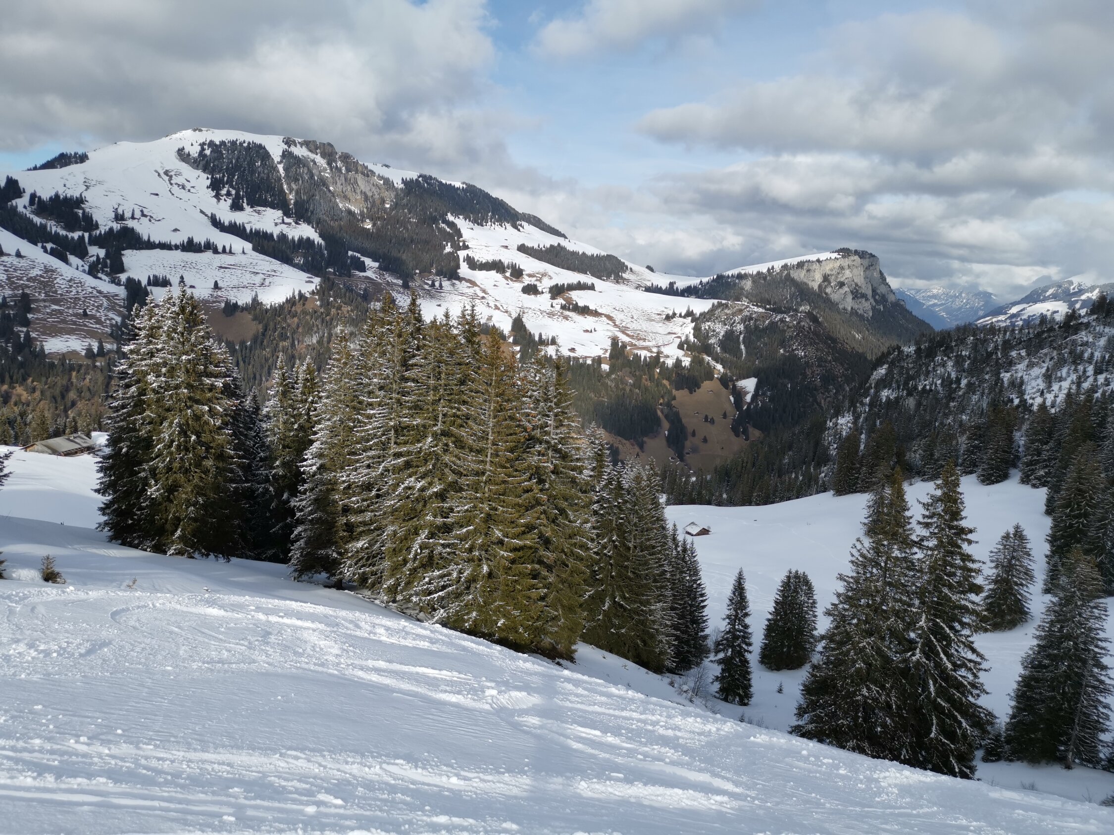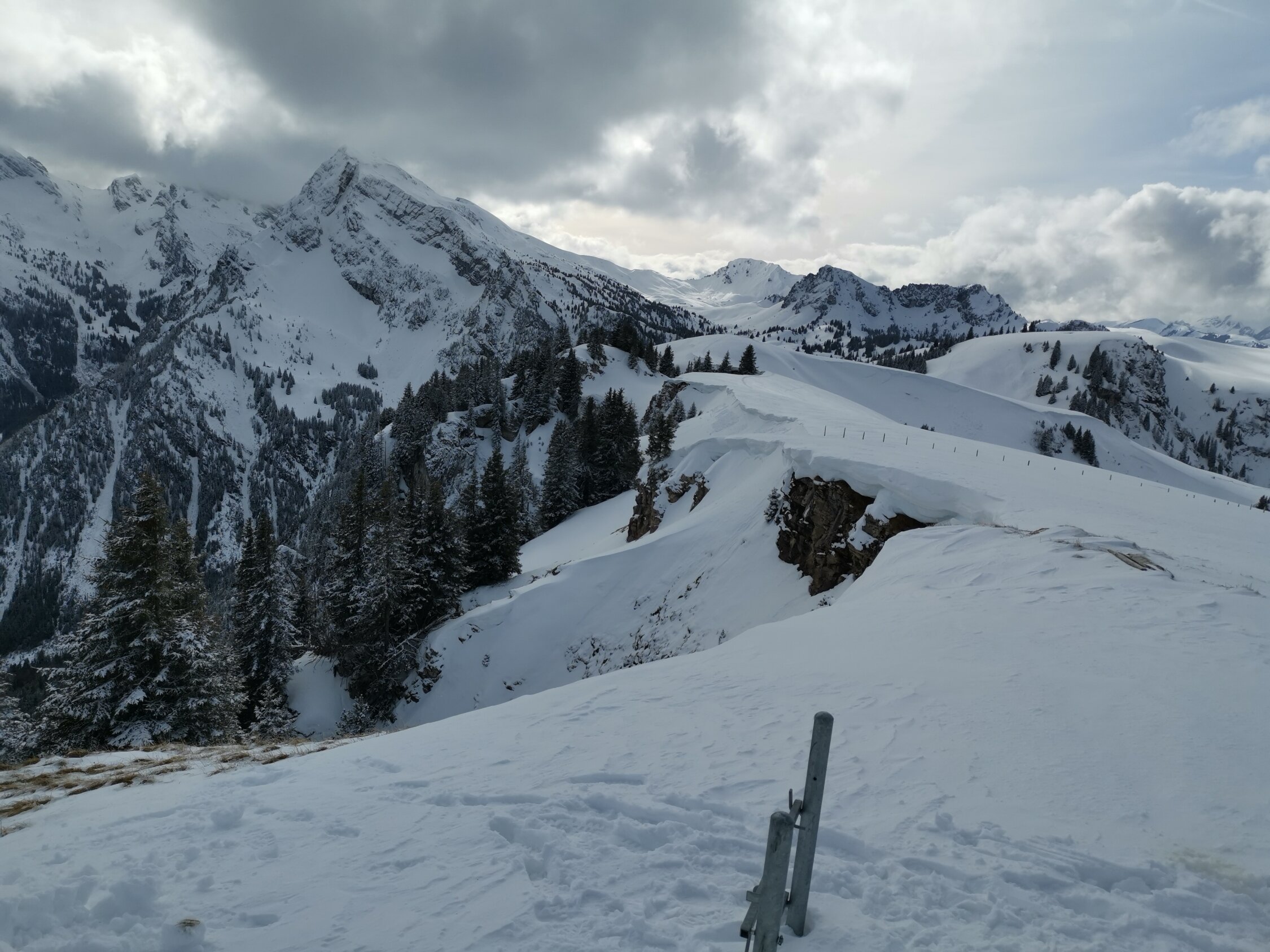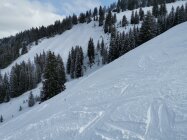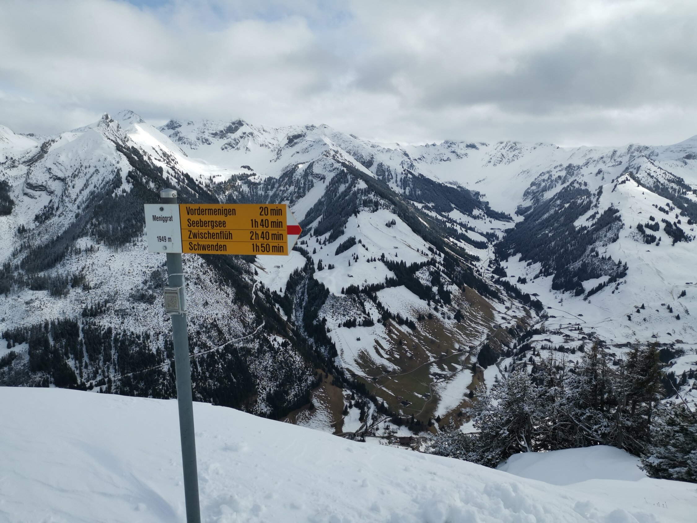 Erstaunlich wenige Autos um 13:30 beim Parkplatz Bodenallmi. Die Schneedecke durchgehend durchfeuchtet, in der oberen Hälfte mehrheitlich tragend, darunter teils weich, teils Bruchharst.