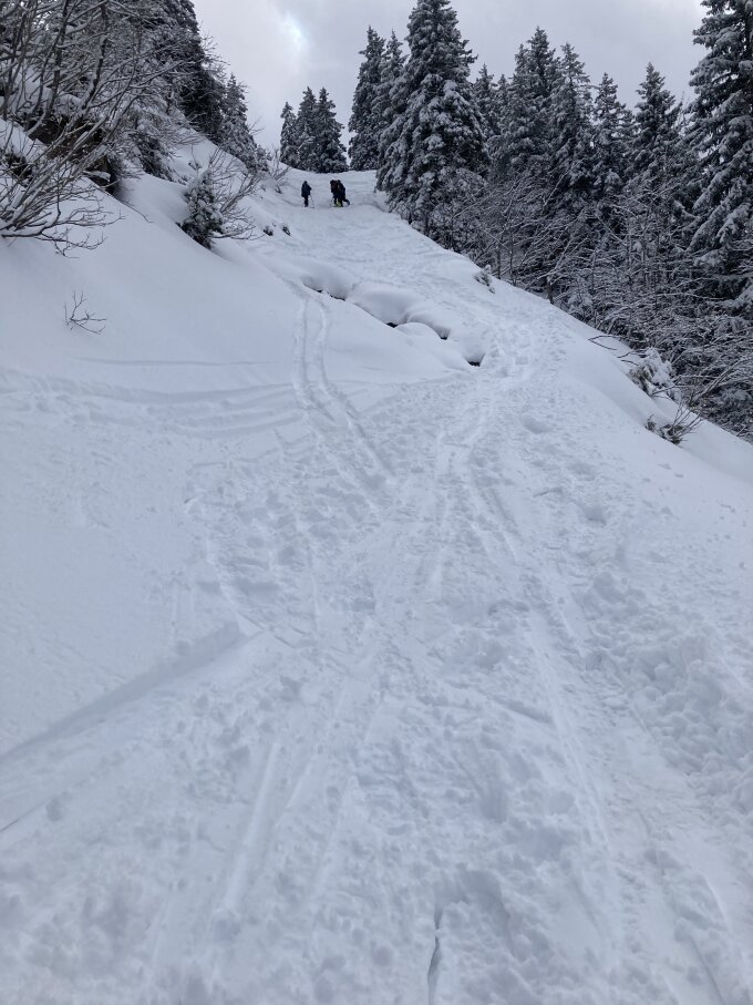 Genügend Schnee vom Start bis ans Ziel mit 10-15 cm feuchtem Pulverschnee obendrauf. Schneedecke ist durchfeuchtet geht aber gut zum fahren (Splitboard). Steilstufe gut eingeschneit und griffig.