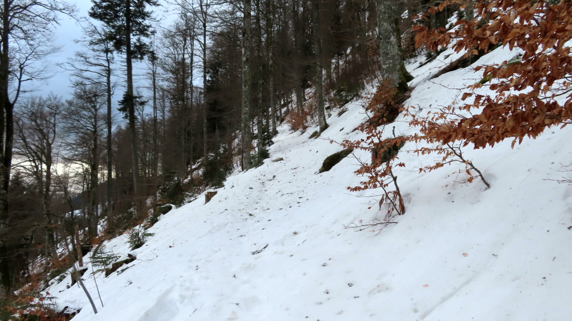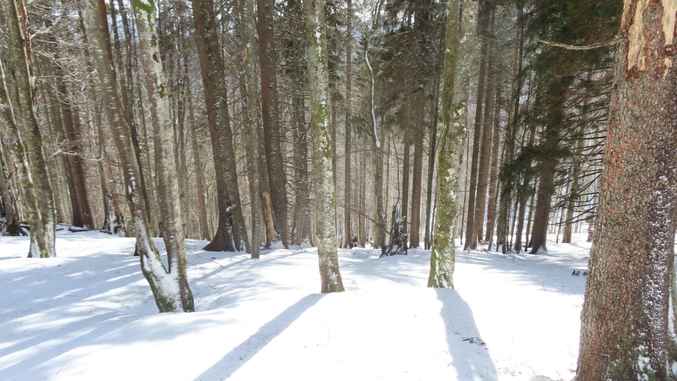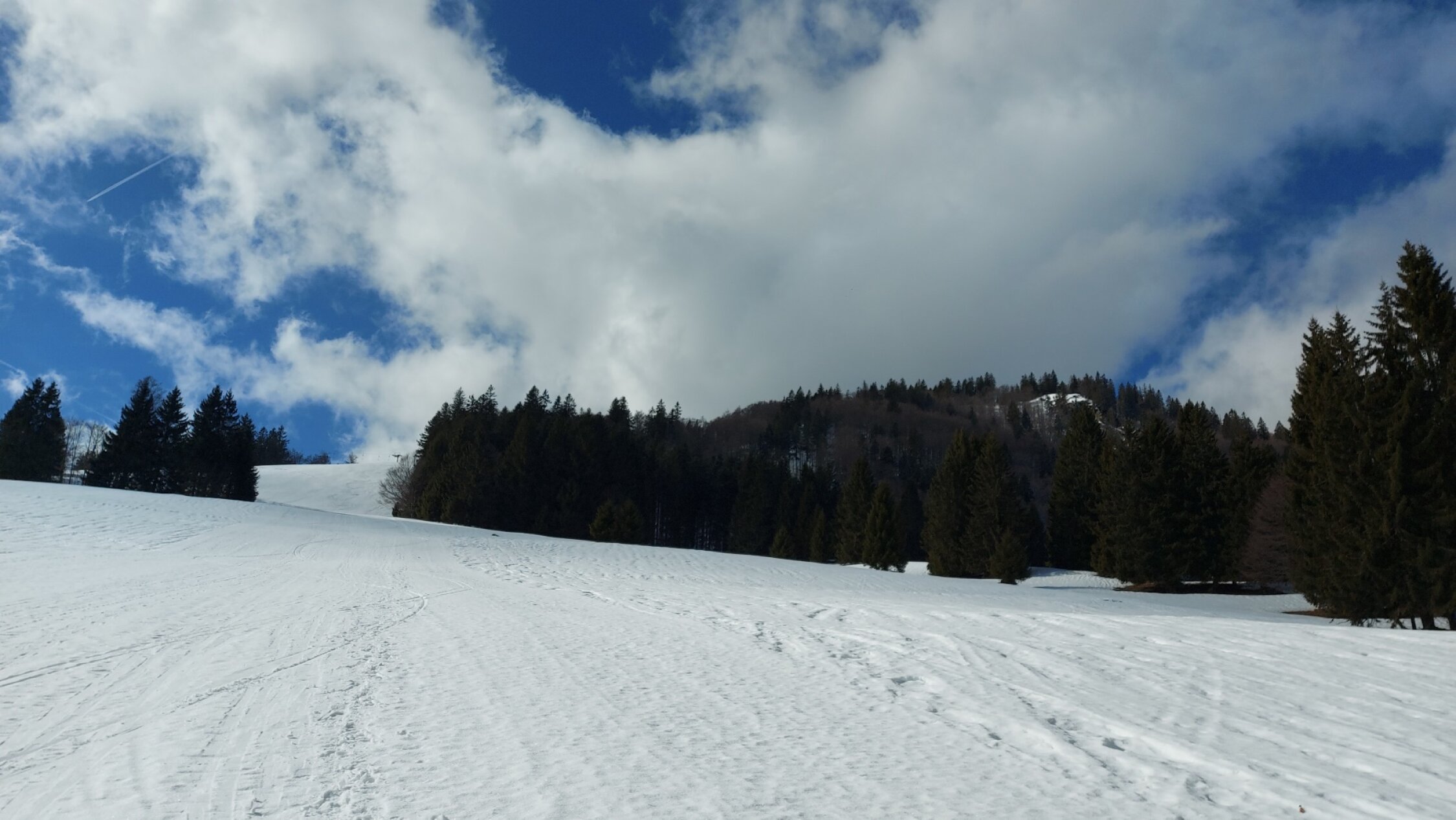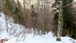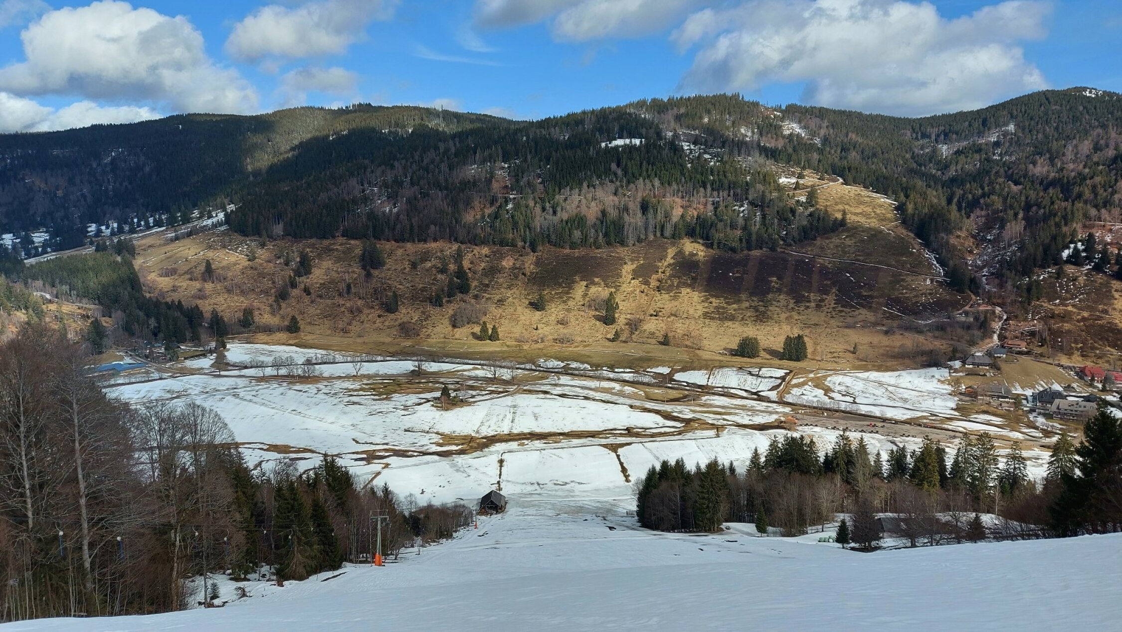In der Talsohle kaum mehr Schnee. Die ersten 15 Minuten ging ich zu Fuß. Weiter oben noch ausreichend Schnee vorhanden. Auch in der Abstiegsroute bis zur Talstation des Mösleliftes gute Schneelage und für Skitourer auf den durch den früheren Skibetrieb verfestigten Pisten gute Abfahrtsverhältnisse.