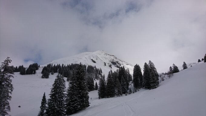 Gar nicht mal so schlecht. Nasser Neuschnee auf einer tragenden Unterlage. Mit genügend Tempo sehr gut zufahren. Haben den Gipfel ausgelassen, sind lieber von der Alp dann nochmals zum Sattel.