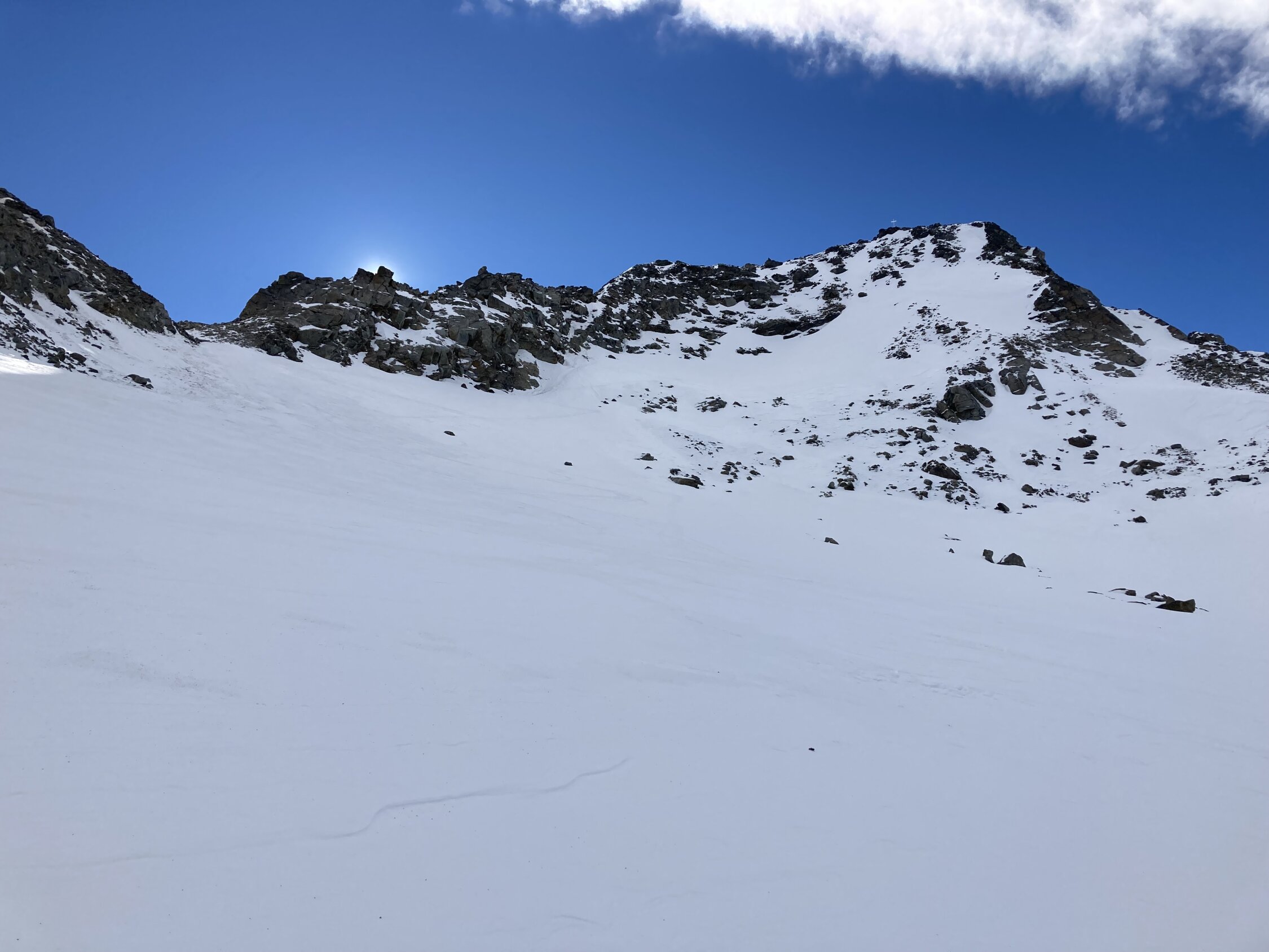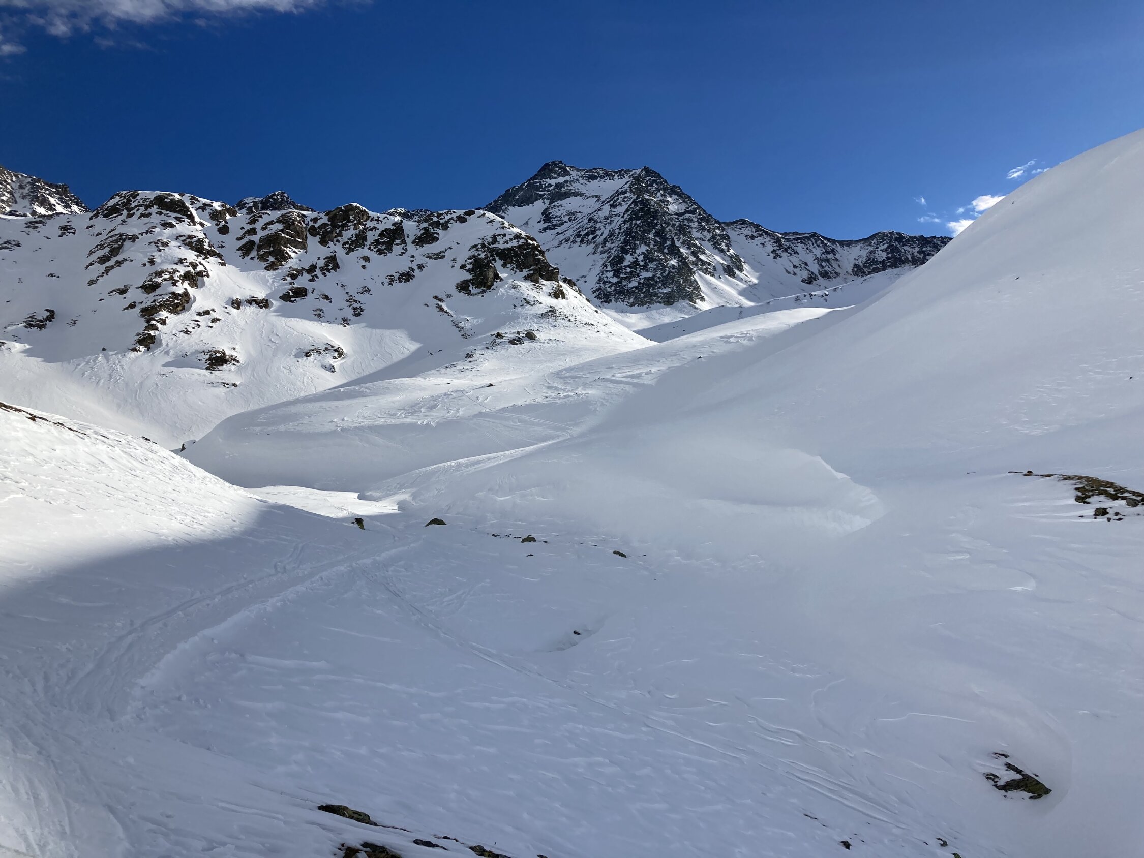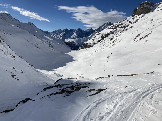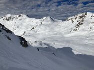 Von S-charl aus ist der Piz Sesvenna gut eingespurt. Auf der Tour ist vornehmelich Hartschnee (Wind- und Schmelzharschkruste, grösstenteils tragend) anzutreffen. Auf dem Vadrat da Sesvenna auch grösser Flächen mit Zastrugis. Am Blockgrat sind immer wieder Passagen eingeschneit, Pickel und auch Steigeisen sind da sehr hilfreich.