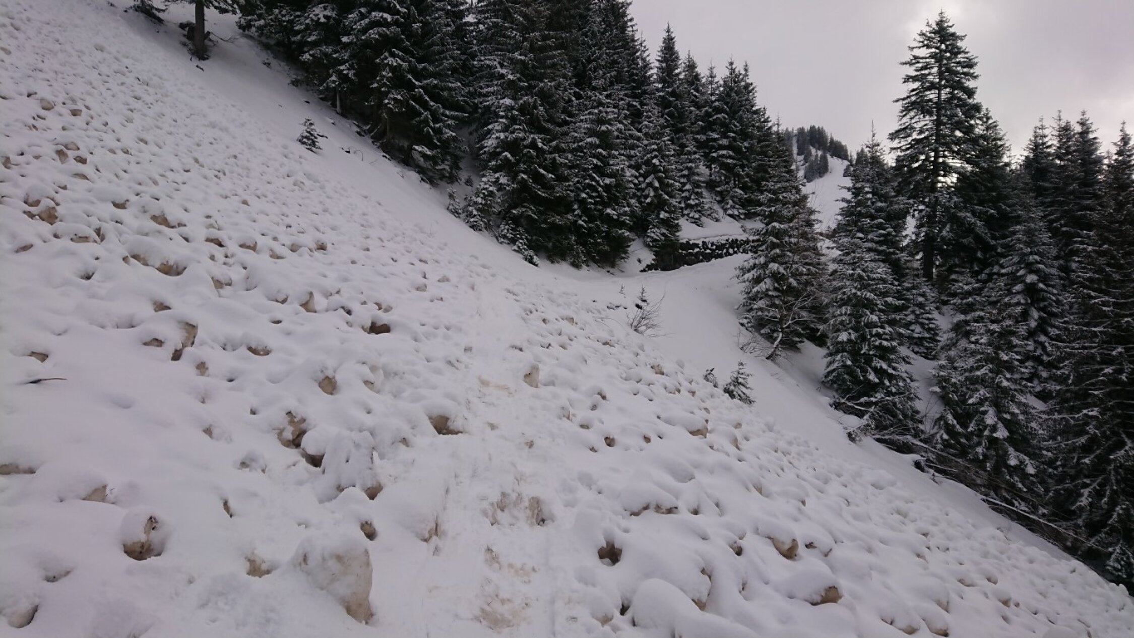 Auf 1450 (vor Lusergabe) Lawinenkegel aus altbekannter Westflanke, vermutlich 3-5 Tage alt (grosse Lawine).