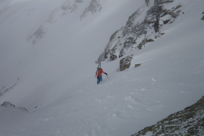 Am Übergang befindet sich derzeit eine mächtige Wechte Dank Westwind und Triebschnee in der darunterliegenden Flanke - Bitte nicht stören =). Wir sind daher etwas südlicher die Flanke abgestiegen (siehe Bild) in einem kurzen Schneefeld 40°.