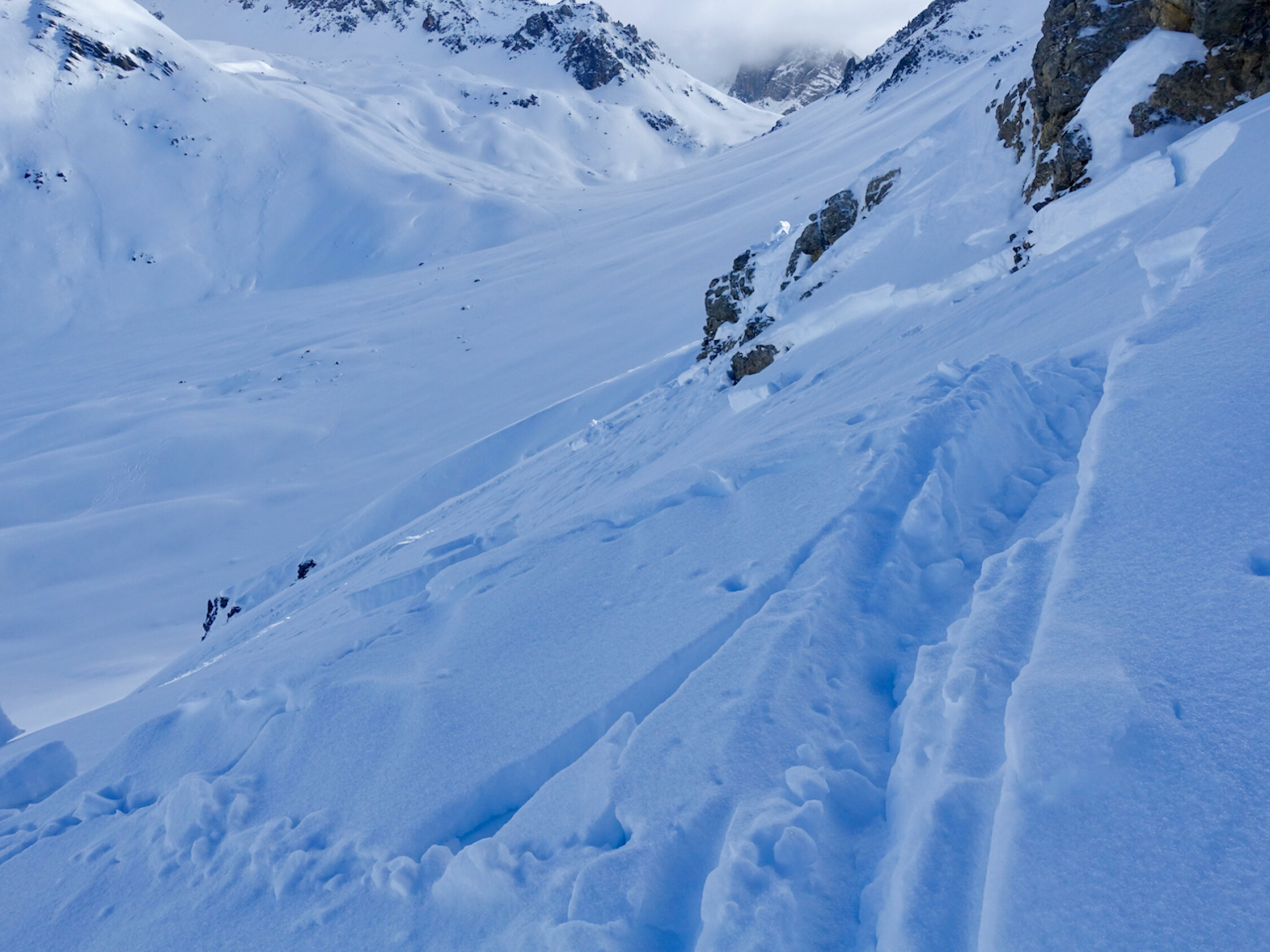 Die bodennahe Schwachschicht mit ihrem vollkommen ungebundenen Griesel, die da gelegentlich zum Vorschein kommt, ist schon beeindruckend und verdeutlicht, dass man das Thema Hangneigung, Exposition, etc. ernst nehmen sollte. Die Anrisskante vom Vortag, nahausgelöst durch eine Spitzkehre im Aufstieg im Übergang von Expo NW (30°) zu NO (und nur wenige Meter im steileren NO-Hang; 35-40°) war schon beeindruckend.