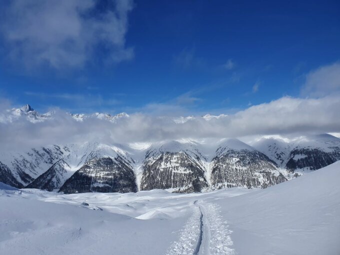 Brudelhorn habe wir bei der Abfahrt eine Aufstiegsspur entdeckt. Auf dem Gipfel haben wir niemanden gesehen.
