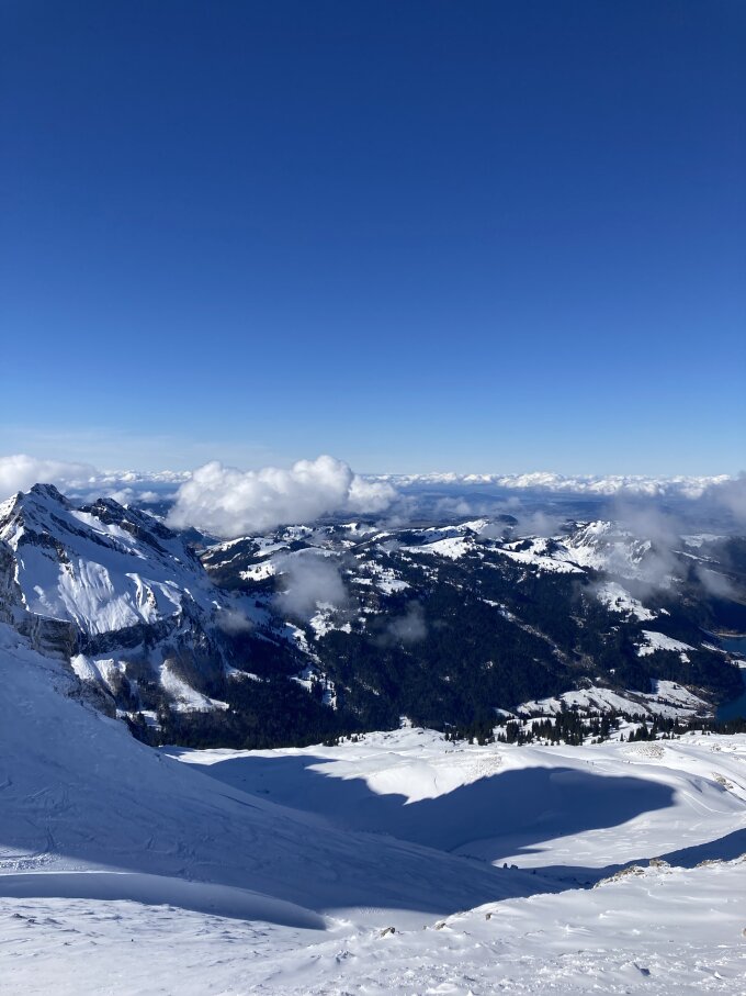 Ab Parkplatz feuchter Pulver bis ca 1400 Hm, von dort weg 5-10 cm Pulver auf harter Unterlage. Abfahrt oberer Teil war gut in den Mulden die Hügel sind abgeblasen. Unterer Teil Nassschnee war spassig zu fahren mit dem Splitboard.