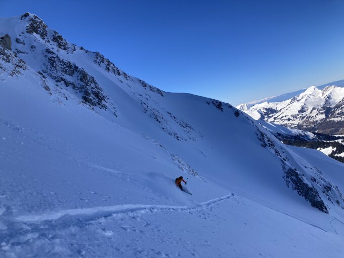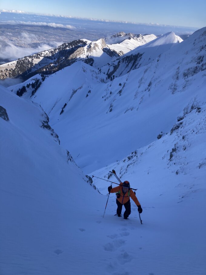 Immer besser durchs Couloir hochzusteigen - hatten so keine (schlechte) Überraschung. Müsste mit wenig Wind und nicht zu kalt oben reinschneien damit intégral vom Gipfelkreuz bis runter gefahren werden kann.