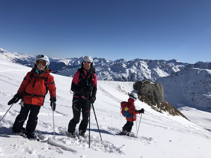 Familientour auf den Pazolastock. Guter griffiger Schnee im Aufstieg. Kalter Wind am Gipfel. Pulverschnee in der Abfahrt nach Tschamutt, noch etwas Platz für eigene Spuren.