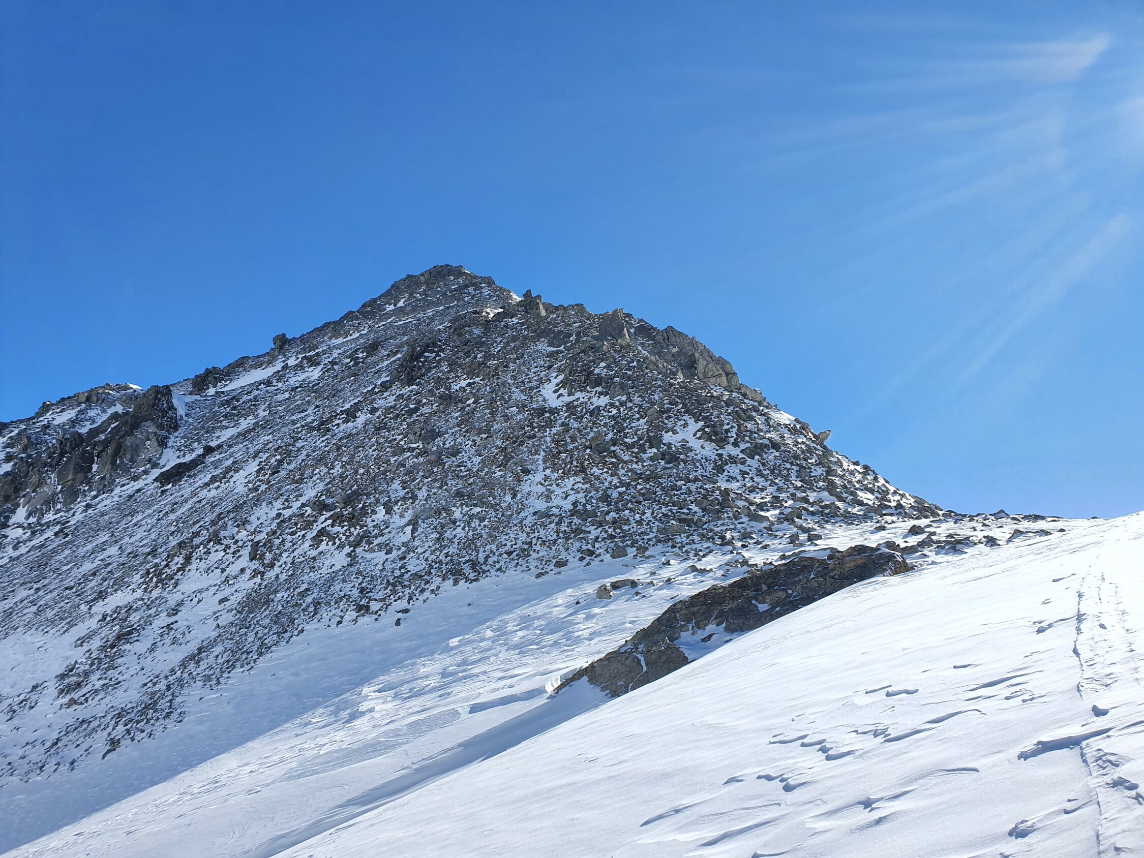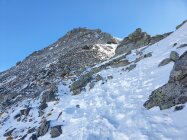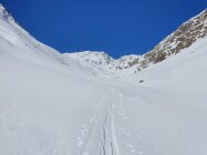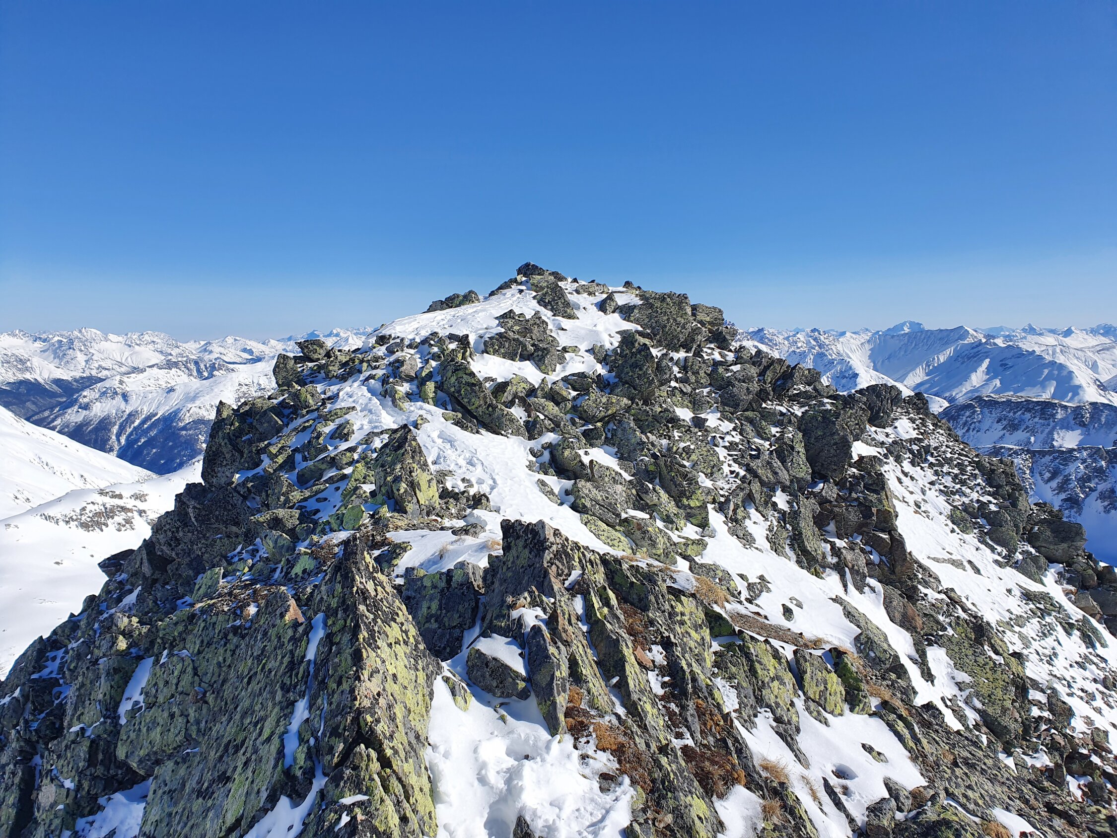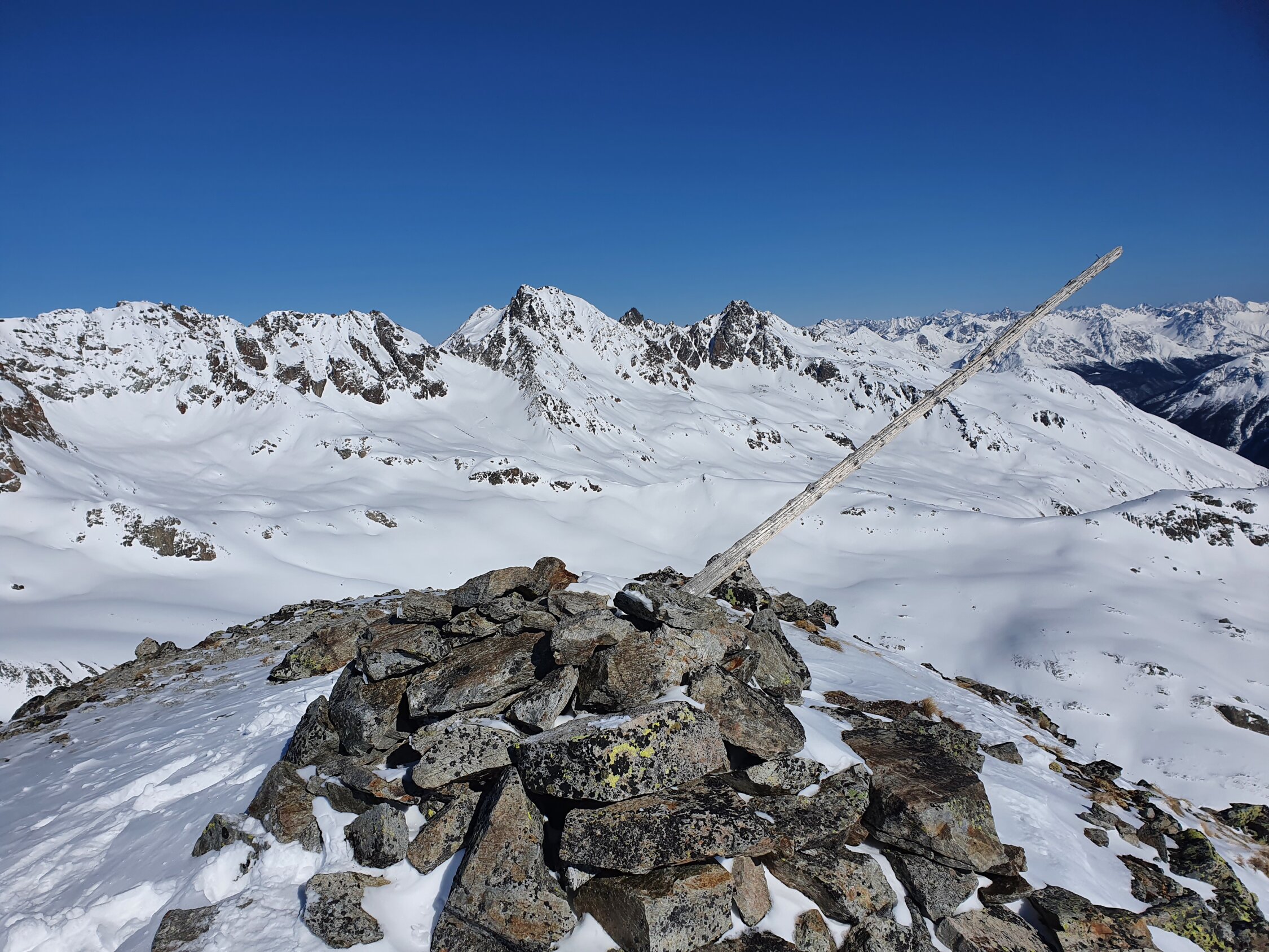 Hoch bis P2607 haben vor mir zwei Personen gespurt, die zum Piz da l'Hom gingen. Somit den Rest noch bis zum Gipfel selber gespurt. Eine alte Spur war jedoch noch sichtbar. Der Gipfelaufstieg von der Fuorcla Punt Ota geht momentan ohne Steigeisen sehr gut.