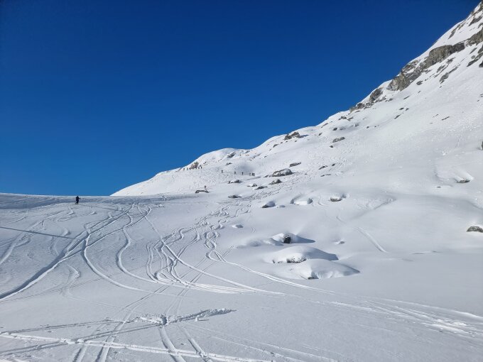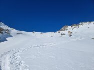 Der Nordosthang ins Val Gronda hat fast keinen Schnee und es schauen überall Steine heraus. Wurde daher auch nicht wirklich befahren. Da hat der Wind ganze Arbeit geleistet. Abfahrt dann entlang der Aufstiegsspur jedoch südlich der Felswand von P. 2586 entlang. Schnee wechselhaft (machmal fest tragend, mnchmal Bruchharsch, manchmal "pulvrig") jedoch meist sehr ordentlich.