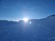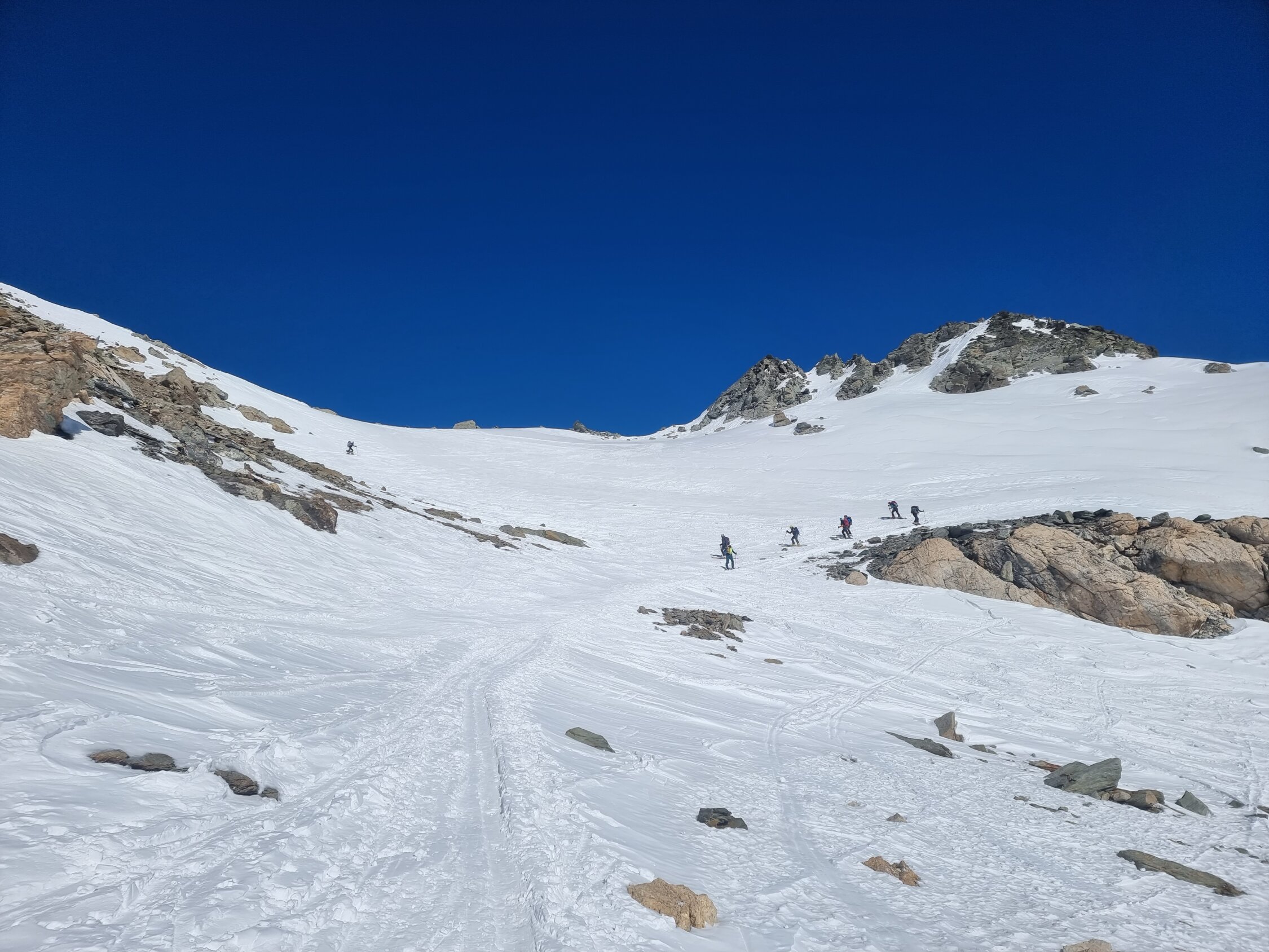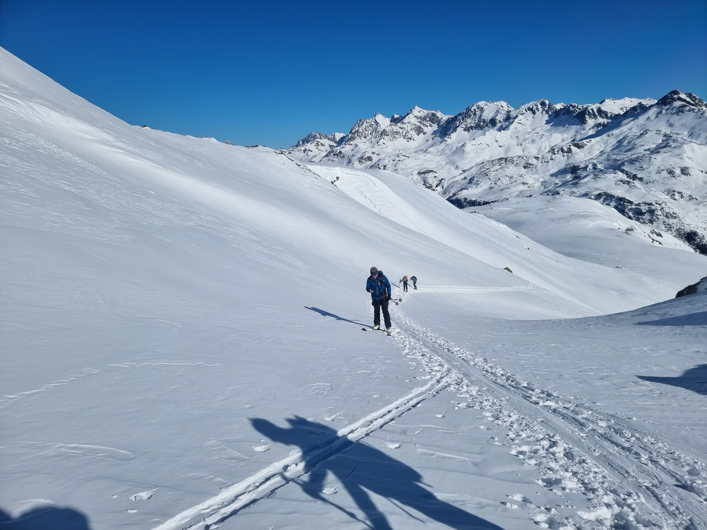 Am morgen in Bivio bei strahlendem Sonnenschein ein wahrer "Run" auf den Berg. Wie die Lemminge aufgereiht starteten die Gruppen. Wir sind etwas gemütlich hinterher marschiert. Die meisten Gruppen sind jedoch an der Abzweigung Richtung Piz Scalotta abgebogen. Wir haben im Aufstieg die Variante nördlich der Felswand von P. 2586 gewählt. Schneelage sehr ordentlich. Es lag eine sehr gute Spur. Anstieg zum Skidepot sehr hart aber gut mit Harscheisen zu begehen. Am Gipfel eine traumhafte Aussicht ohne eine einzelne Wolke.