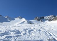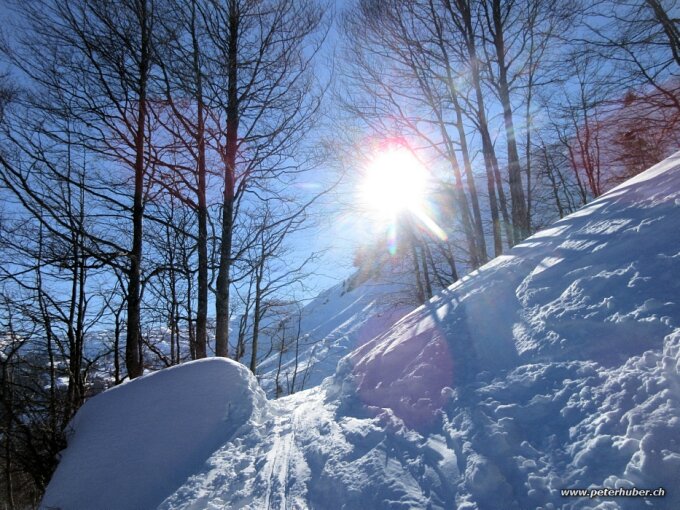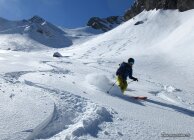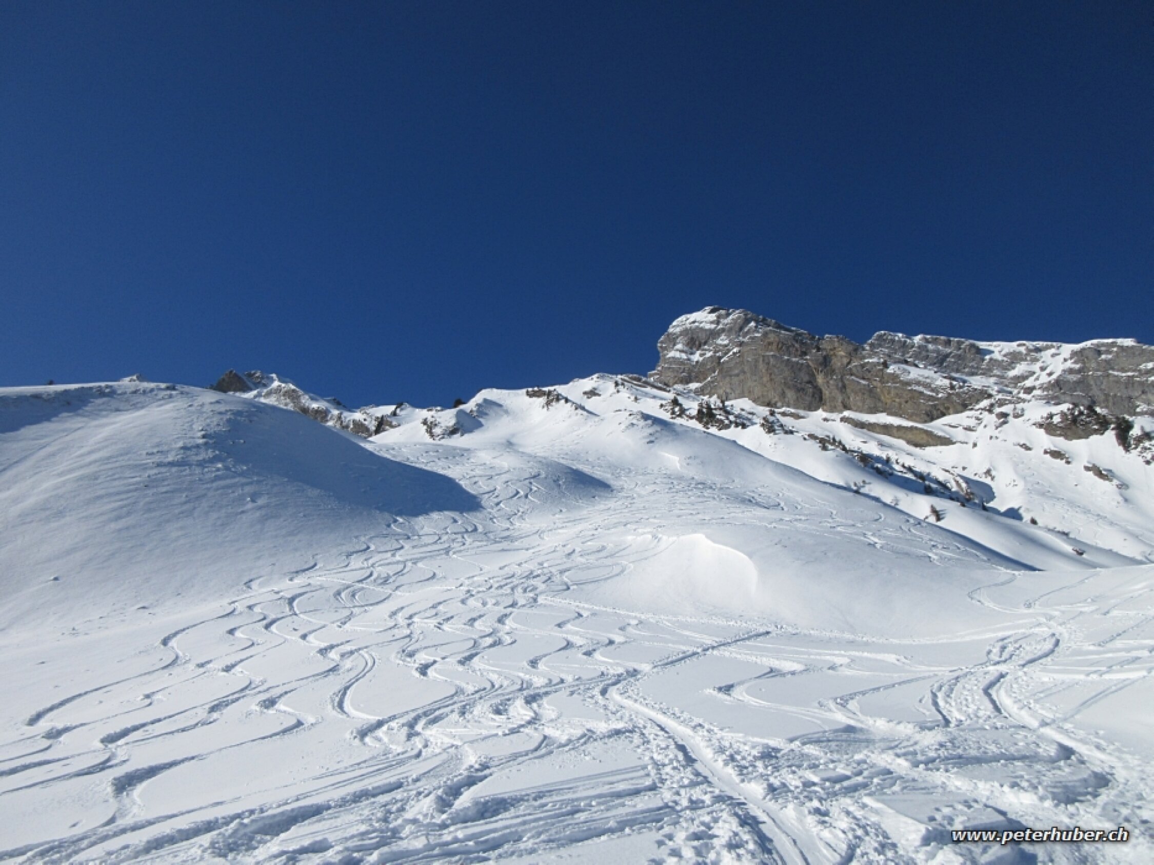 Abfahrt: Es hat etliche Spuren von den Vortagen. Doch der Schnee ist bis fast ins Tal pulverig und somit recht schön zu fahren. Nebenan fanden wir auch noch ein paar unverspurte Hänglein.