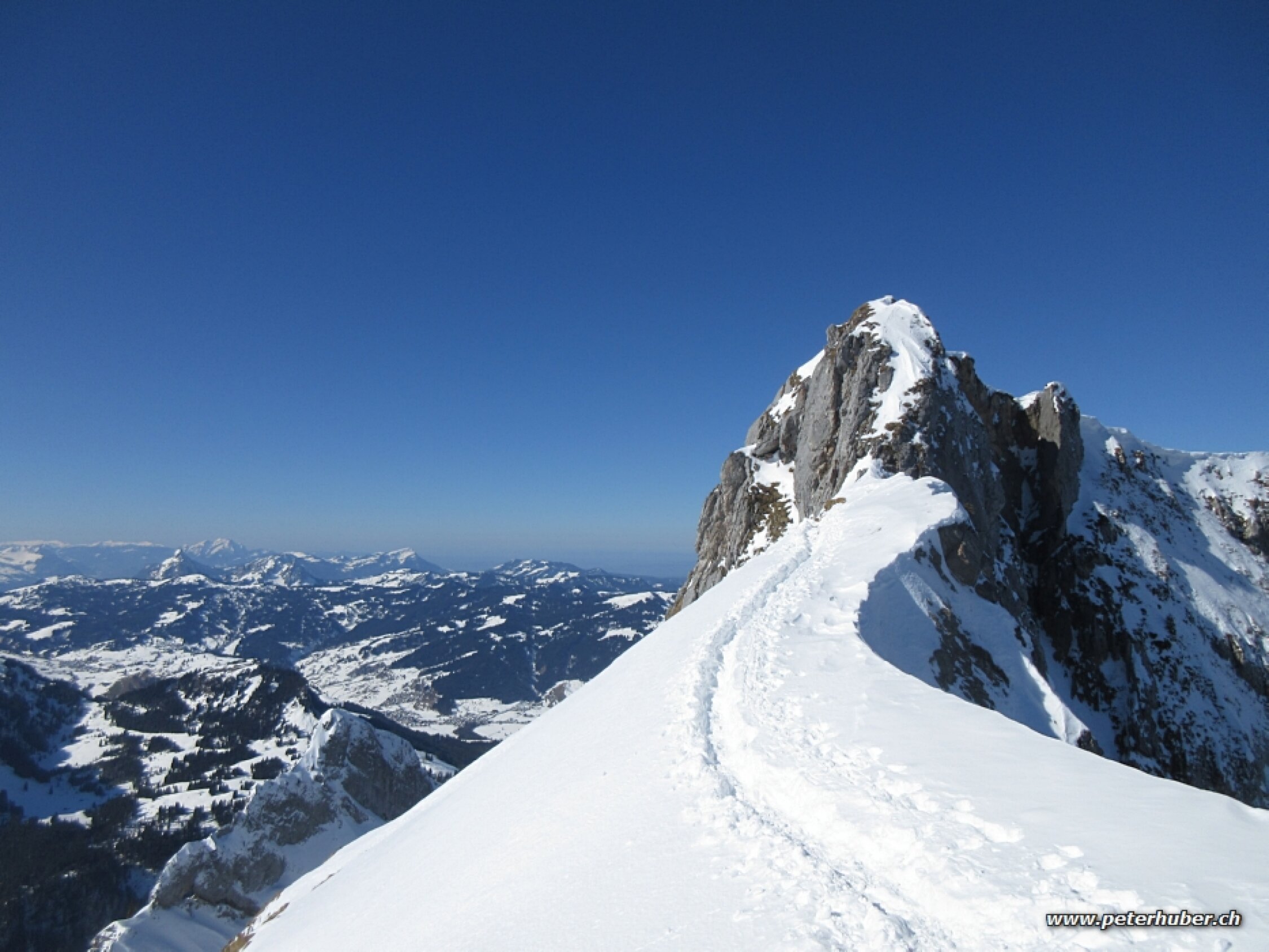 Tolles Wetter. Die Zufahrt erfolgt auf der Westseite des Wägitalersees. Heute problemlos. Doch wenn es viel Verkehr hat, dürfte das Kreuzen mühsam werden. Ab dem Start hat es zuerst gerade noch genug Schnee. Nach oben bald genug. Die Spur ist oft sehr steil gelegt, aber meist gut griffig. Ketten zum Gipfel hinauf liegen frei. Leicht aufgetauter Trittschnee ermöglicht einen machbaren Aufstieg bis ganz zum Gipfel. (Sollte der Schnee jedoch gefroren sein, sind Steigeisen ratsam).
