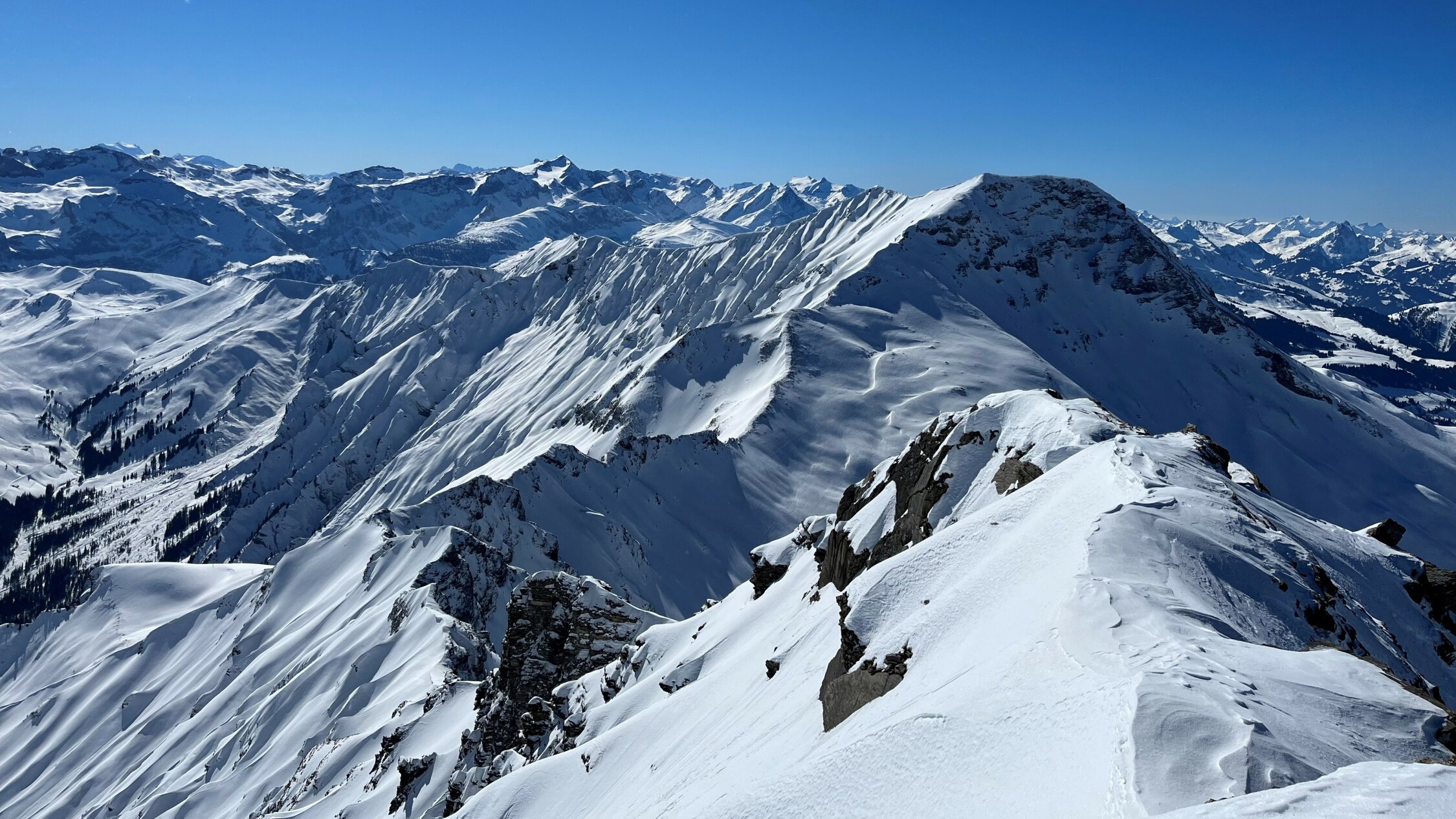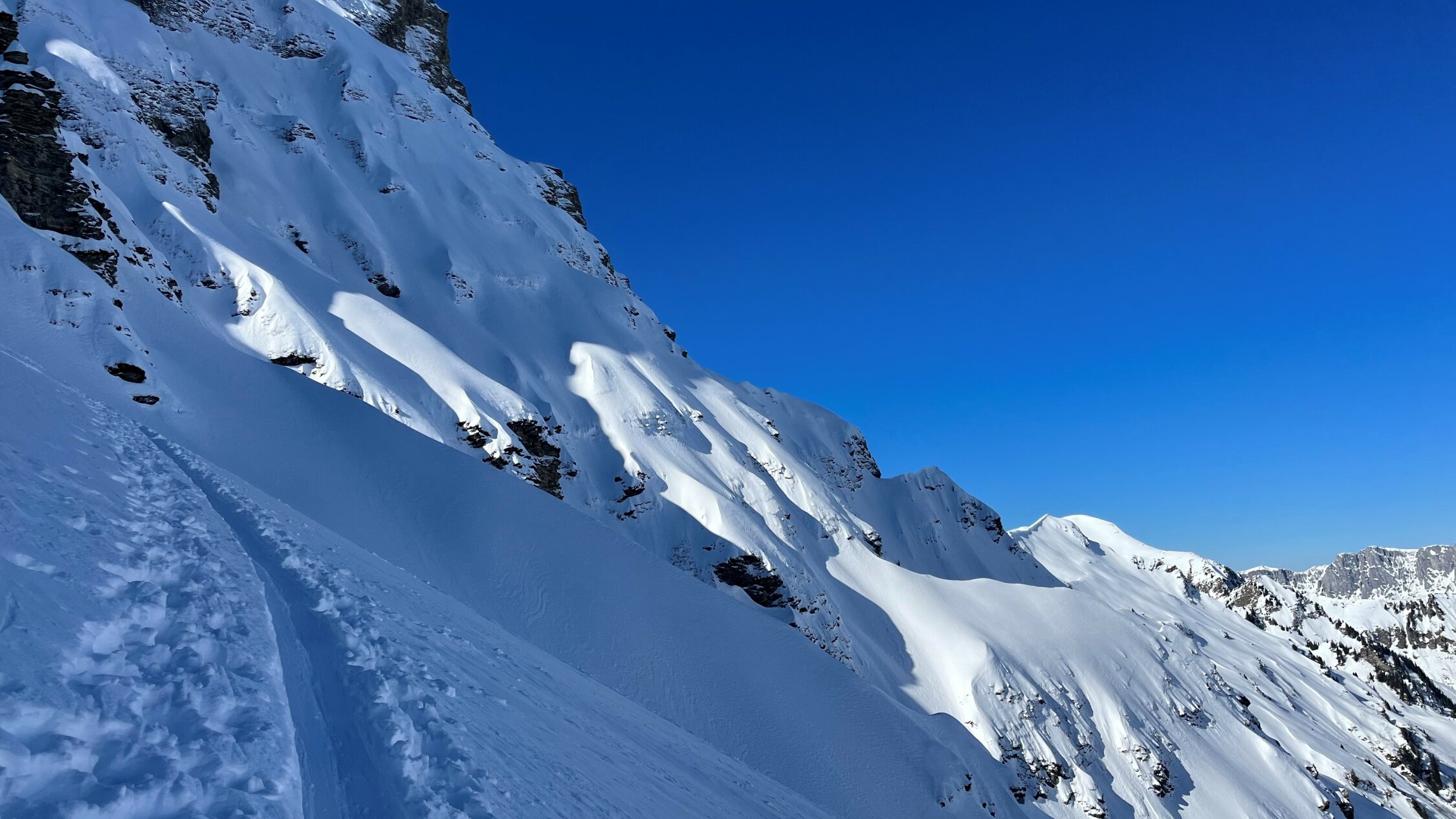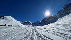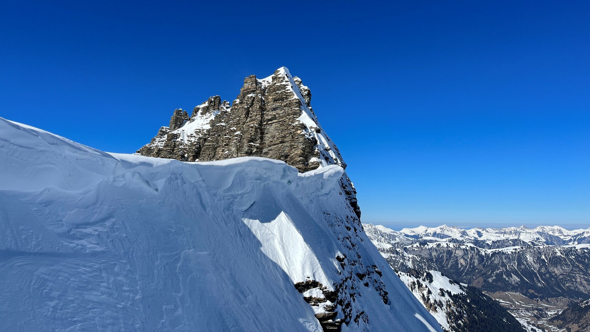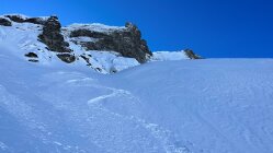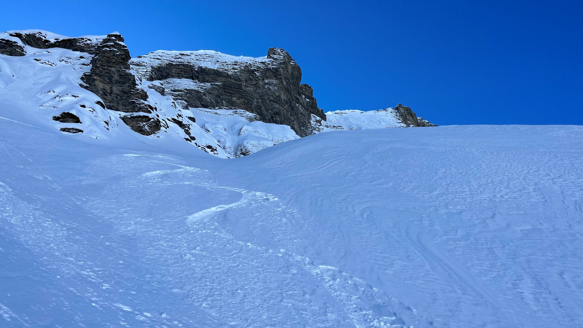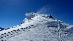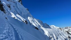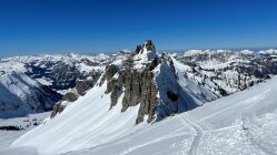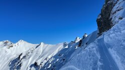 Topverhältnisse auf das Gsür. Gut angelegte Aufstiegsspur durch den Steinbodenhang. Am Schluss des Hangs muss man nicht unbedingt über die Gwächte steigen, sondern kann man mit den Skie angenehm links hochlaufen und am Ende der Gwächte in das Rügge Tälti queren. Es braucht keine Harscheisen. Über den Gsürgrat herrschen sehr gute Verhältnisse. Steigeisen und Pickel können hilfreich sein, aber ich habe keine gebraucht, da es sehr guten Trittschnee hat. Bei der Felskletterstelle hilft das neue dicke Fixseil. Auf das Landfogtehore war reger Betrieb, aber auf das Gsür war ich alleine unterwegs. Beim Abfahren hat es, dank den tiefen Temperaturen, Pulverschnee von oben bis unten. Auch wenn es schon einige Spuren hat, findet man noch genügend Platz um Firstelines zu ziehen. Es war eine traumhaft schöne Tour.