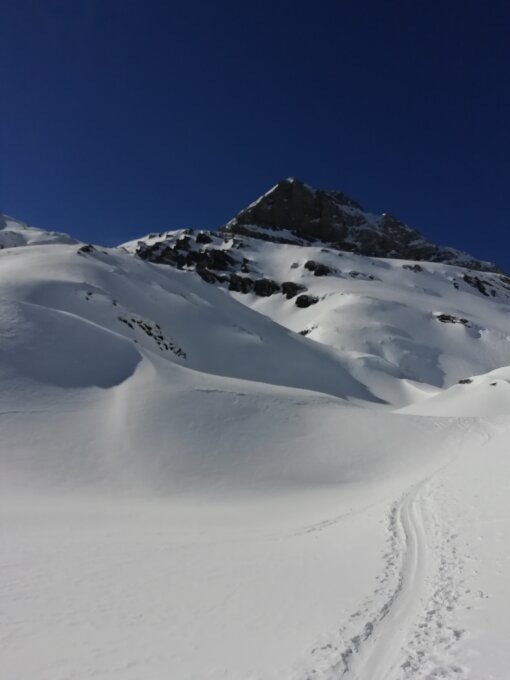 Gute Verhältnisse im Aufstieg. Die (zahlreichen!) Spuren vom Sonntag waren teilweise verblasen. Wir sind über Seestutz in die Rote Chumme gestiegen, Spuren hat es aber auch direkt ab Schwarenbach. An der Schlüsselstelle auf 2680m sind wir 20 Hm zu Fuss gegangen.
