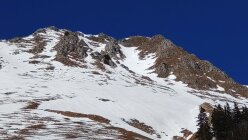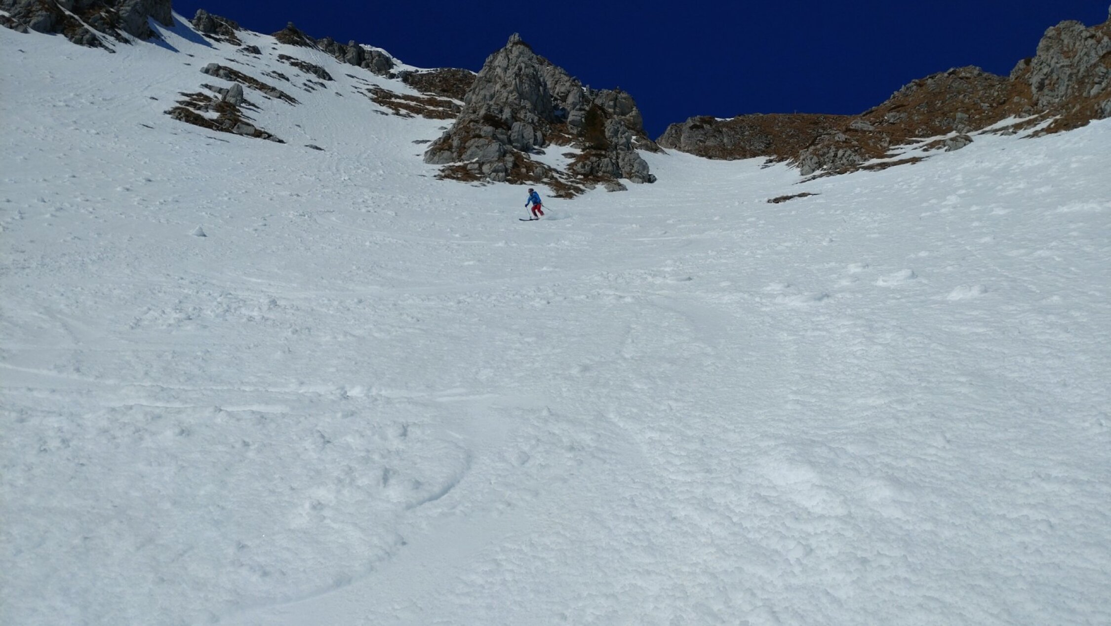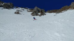 Die Skiabfahrt durchs Südwand Couloir im schönen Sulzschnee bot eine traumhafte Skiabfahrt. Es ist 400m lang, und 42 bis 35 Grad steil.