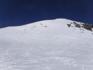 Vor mir spurten 4 Skitüerler mit Hund, der denen immer vorauslief und durchs Gelände flitzte und rutschte und seine wahre Freude dabei hatte. Danach überholten mich 2 weitere Skitourengänger. In der Hochebene unterhalb des Gipfelhangs überholten mich 5 Skitourengänger mit 2 Hunden, die friedlich hinterher trabten. Wir stiegen alle durchs Schönkar auf. Lawinengefahr bestand kaum. Die südseitigen Bergflanken waren größtenteils schon entladen. Im Abstieg durchs Mitterkar kamen mir 6 Skitourengänger entgegen.