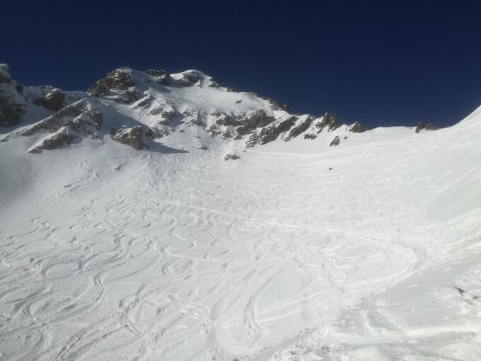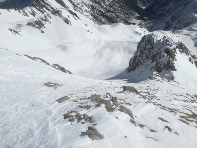 Start 6.30Uhr bei -10Grad und starkem Wind am kleinen kostenfreien Parkplatz vor Bichelbächle. Den Latschenhang in linker Rinne neu gespurt, da der Wind alle Spuren vom Vortag zugeweht hatte. Oberhalb 2000m dann nahezu windstill - gute Spur zum Skidepot + Fußaufstieg. Abfahrt Ostrinne und weiter zum N-Aufstieg Steinmanndlspitze. Hier noch Pulverschnee und beste Abfahrtsverhältnisse. Zurück zur Nordabfahrt vom Roten Stein nach Bichelbächle - Abfahrt stark windbearbeitet teils eisig, fahrbar...