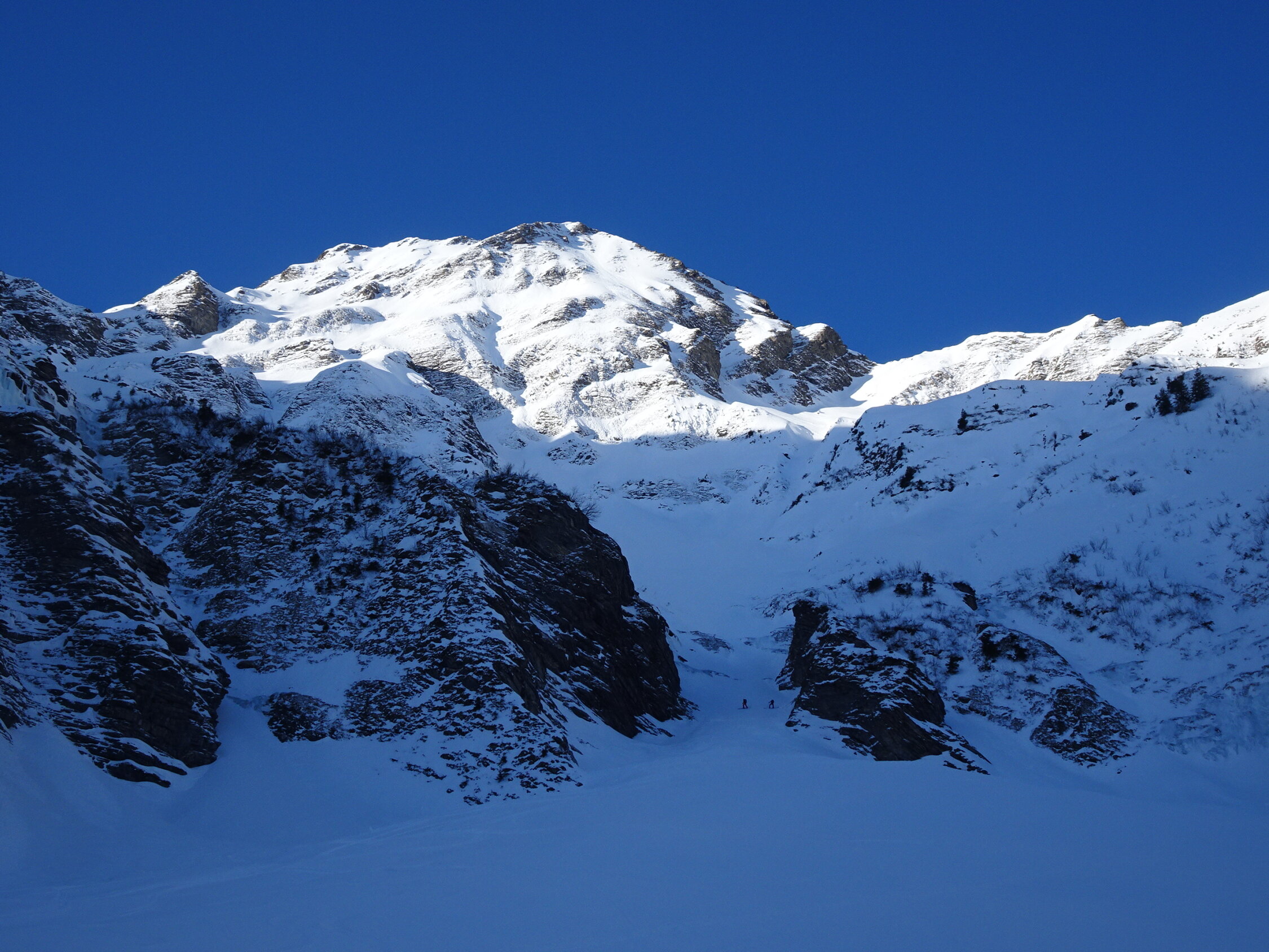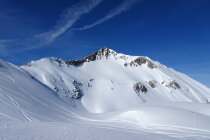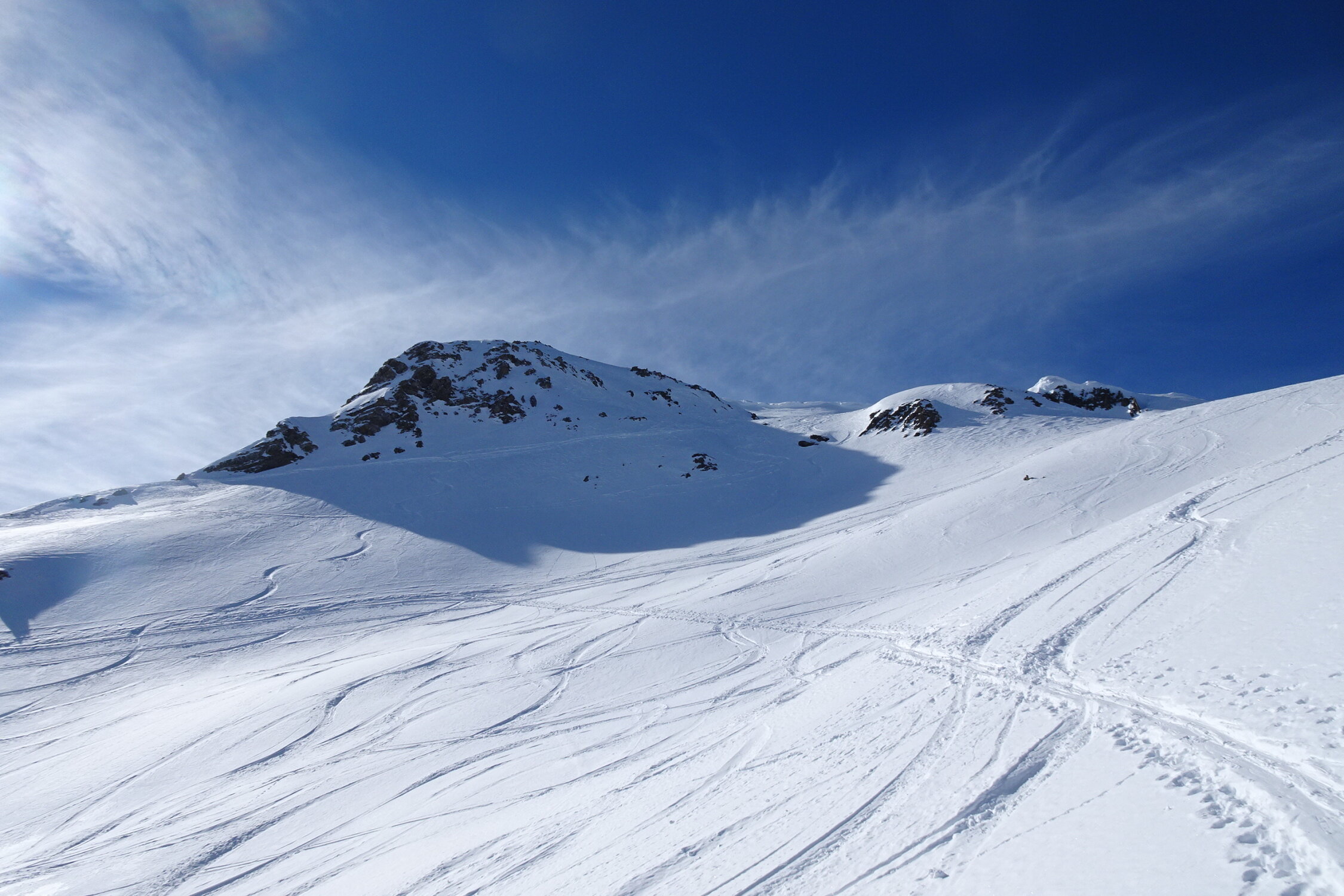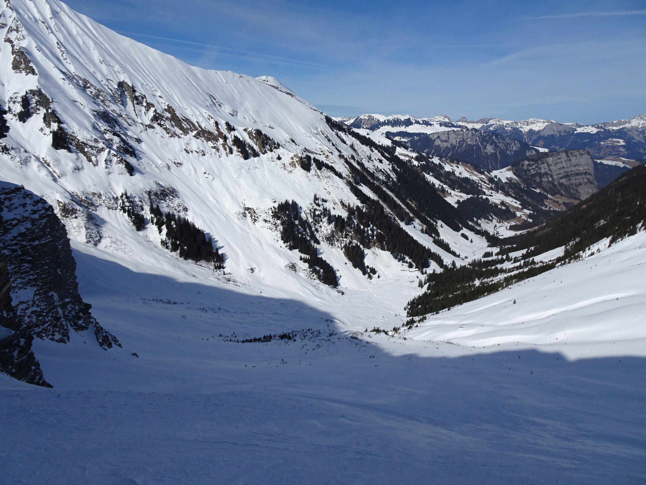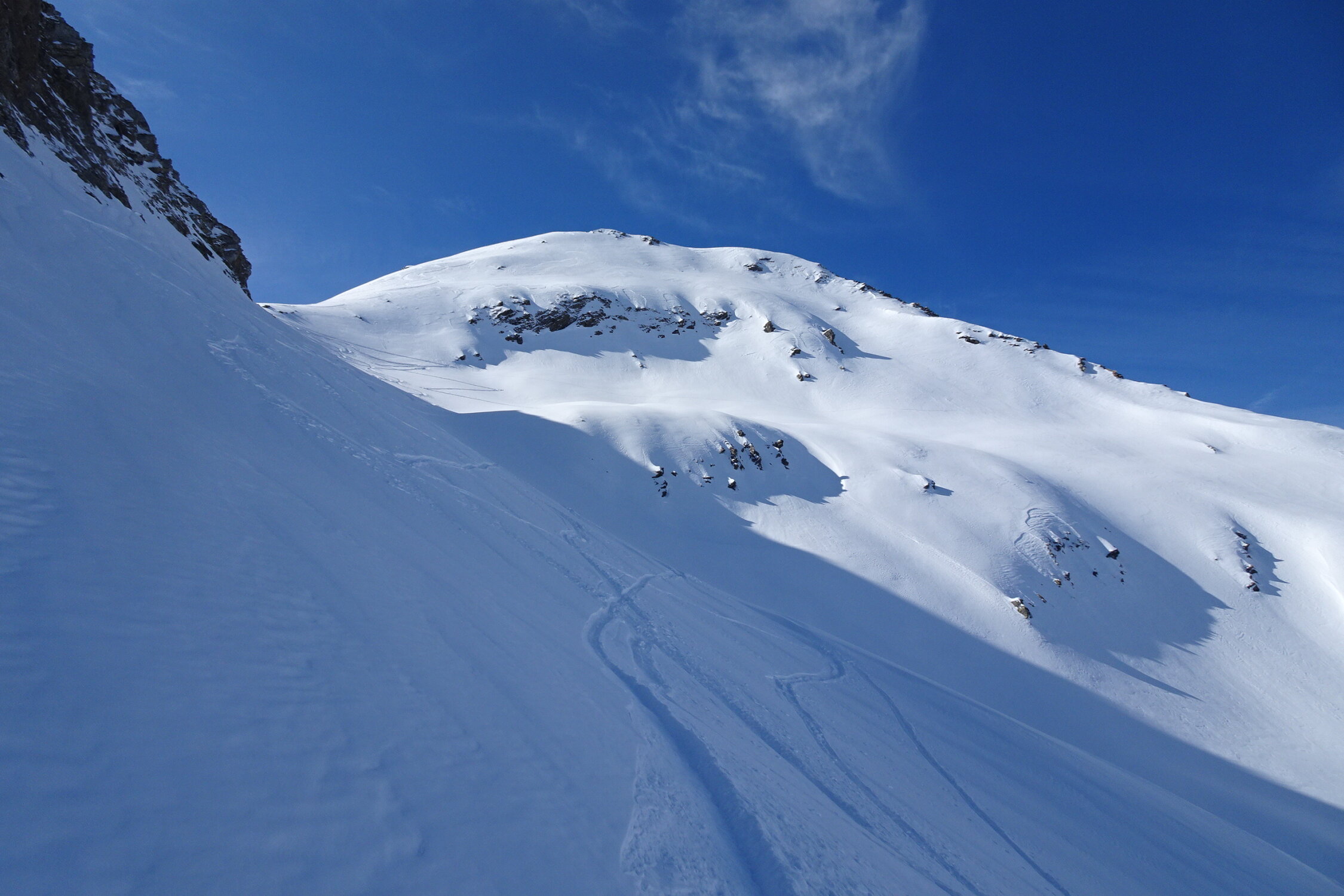 Abfahrt: Verhältnisse noch "gut", aber die schönen Pulvertage sind vorbei, vor allem oben raus stark windgeprägt. Heute fand sich vielerorts noch Presspulver, der ganz nett zu fahren war, vor allem im weiten Hang unterhalb des Ladholzcouloirs zurück in den Chirel. Die Verhältnisse im Ladholzcouloir selber nur "machbar". Vorsicht, etwas oberhalb der Mitte hat es eine Eiswarze (in Abfahrtsrichtung links). Prädikat "ausgezeichnet" für den Hang zwischen Gipfel und Einfahrt Couloir.