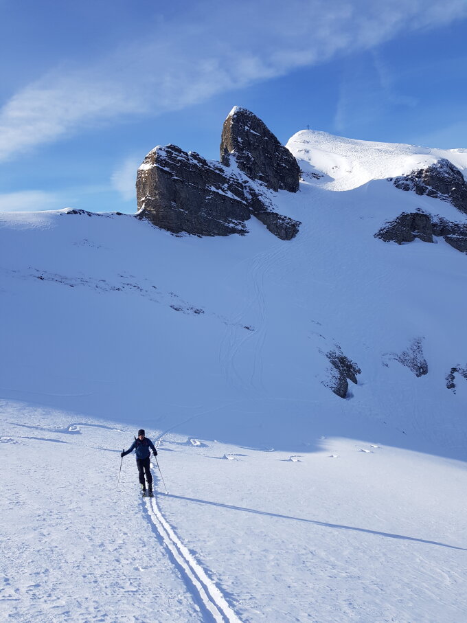 Die Schneeverhältnisse sind in der Nordflanke sehr günstig und der Schnee sehr "haftig", auch an den exponierten Stellen. Die frische Spur wird sich in den kommenden Tagen sicher noch verfestigen.