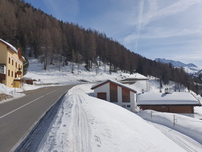Bei ca. P2700 habe ich nochmals angefellt und bin zum Isenfürggli hochgestiegen (15 Min.). Wie vermutet hatte es mit der richtigen Hangwahl Pulver ohne Ende bis zum Berghaus Vereina. Danch zuerst mit viel Stossen bis P1871 und ab da eine abenteuerliche Abfahrt bis Garfiun. Danach wieder mit viel Stossen bis Monbiel.