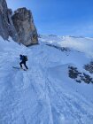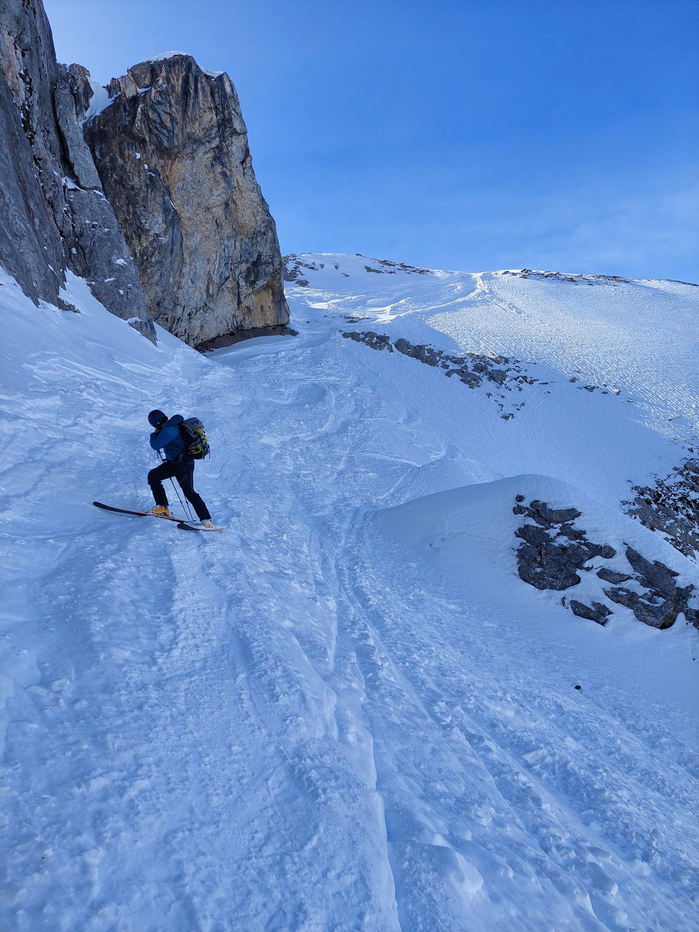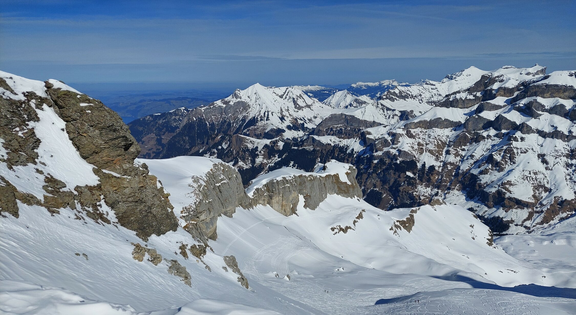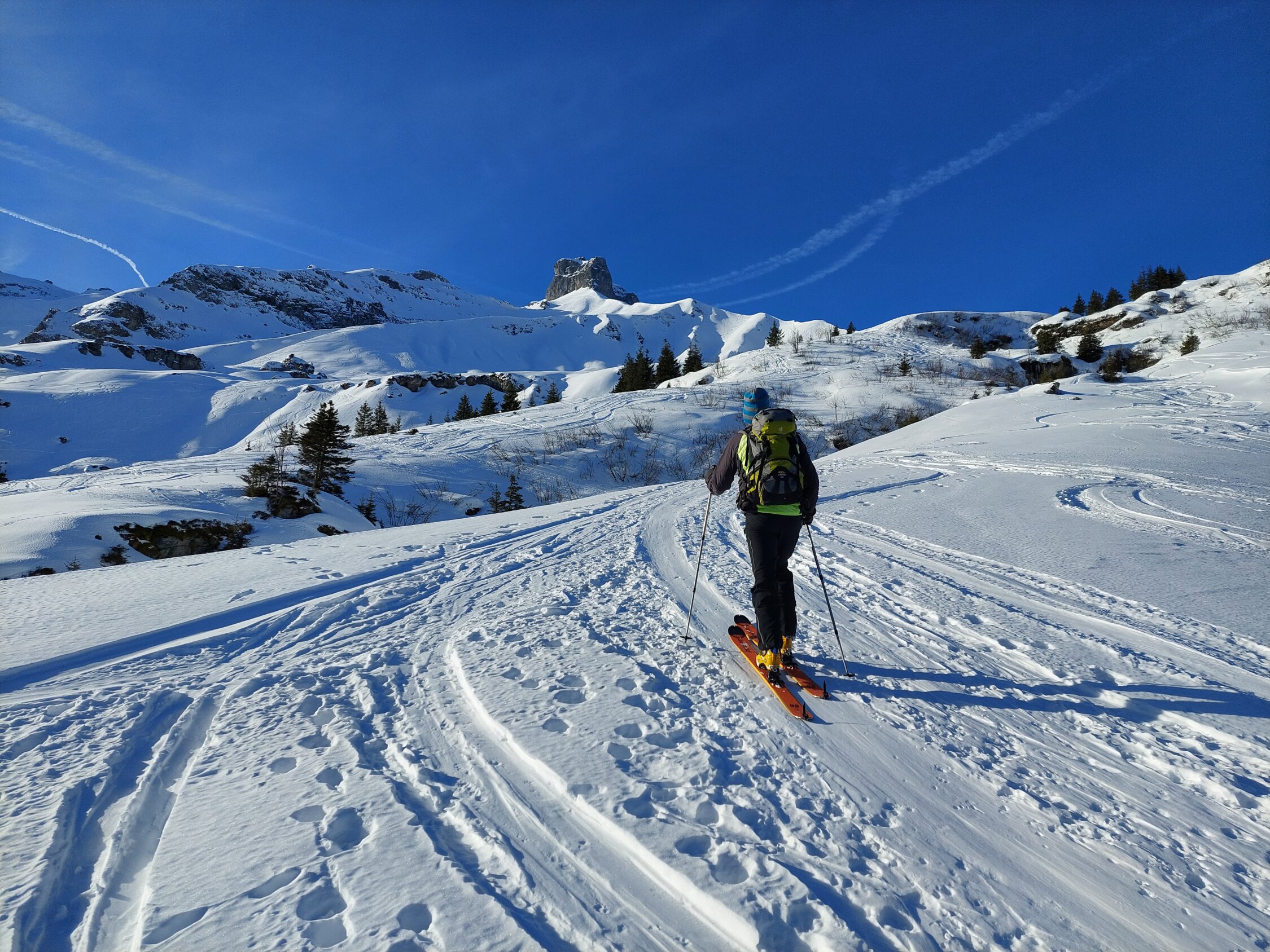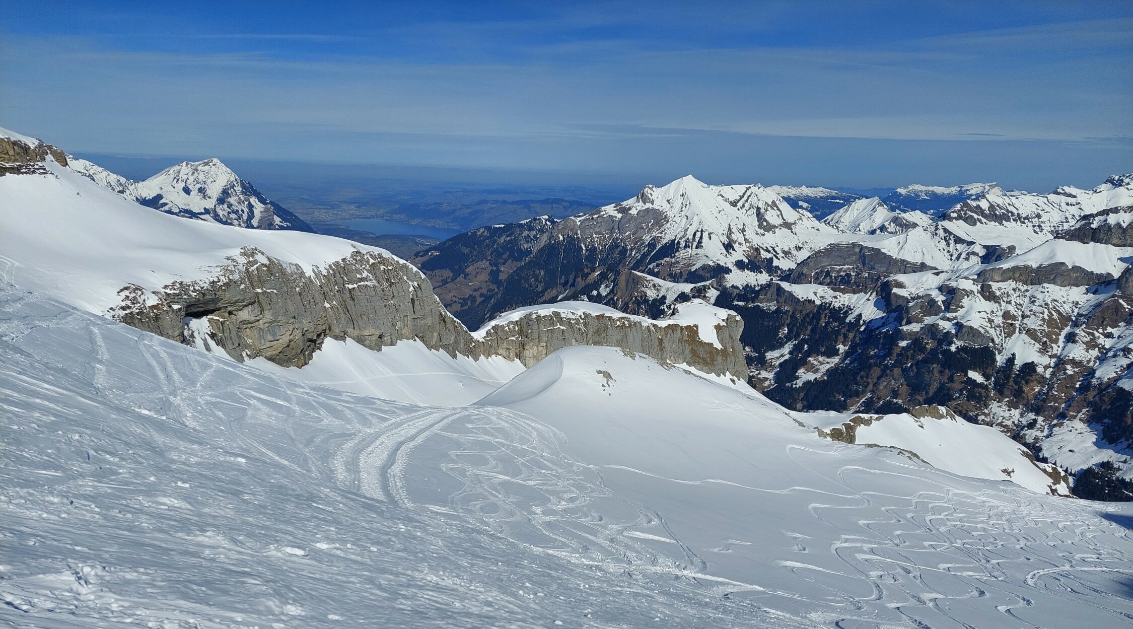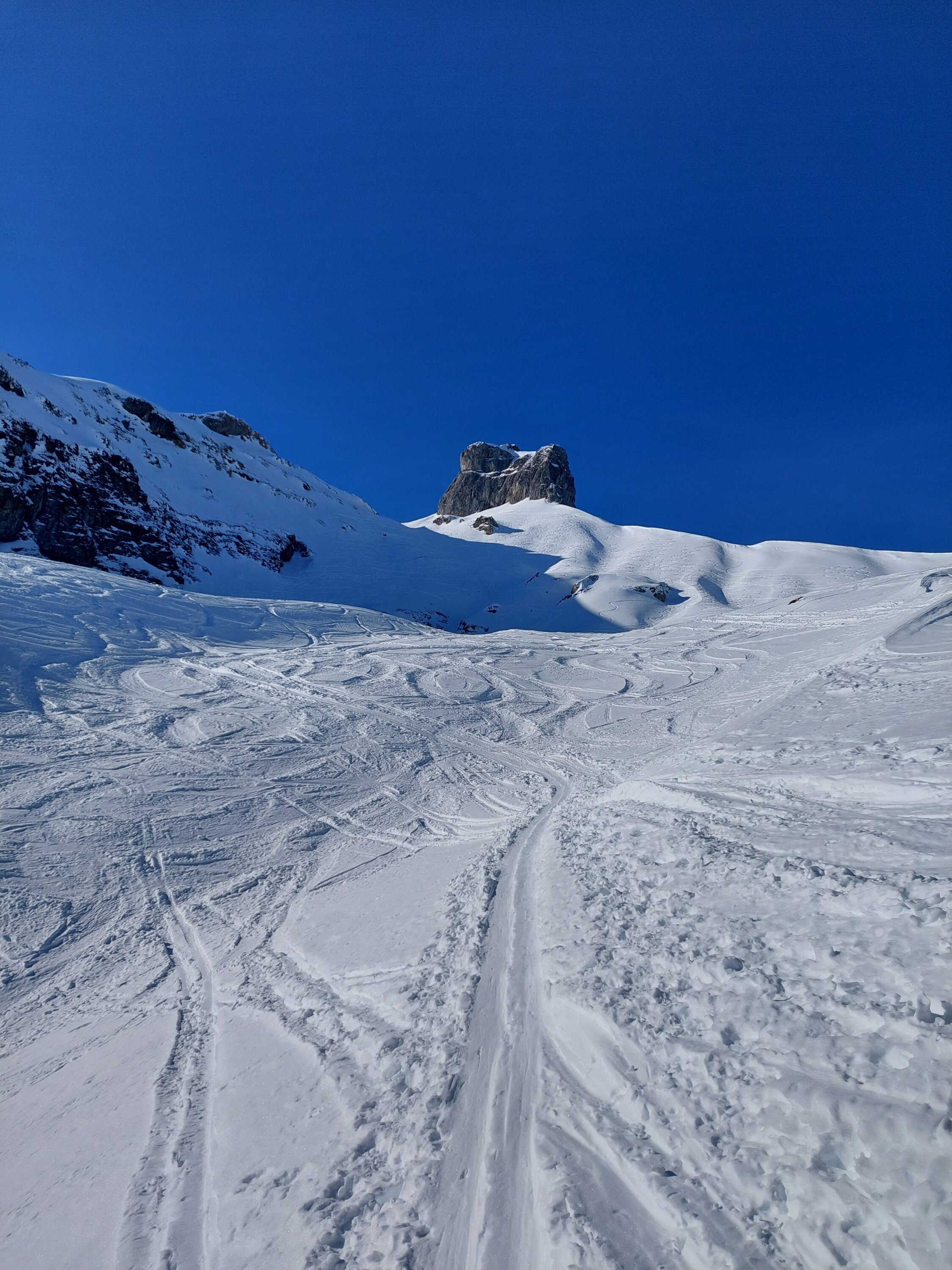 Abfahrt: Die Abfahrt über die Nordflanke via Dündenalp (Bäretritt) ist noch gut machbar. Es hat noch immer Pulverschnee.