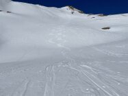 Abfahrt vom Schibespitz natürlich verfahren, aber kaum harte Spuren. Presspulver.