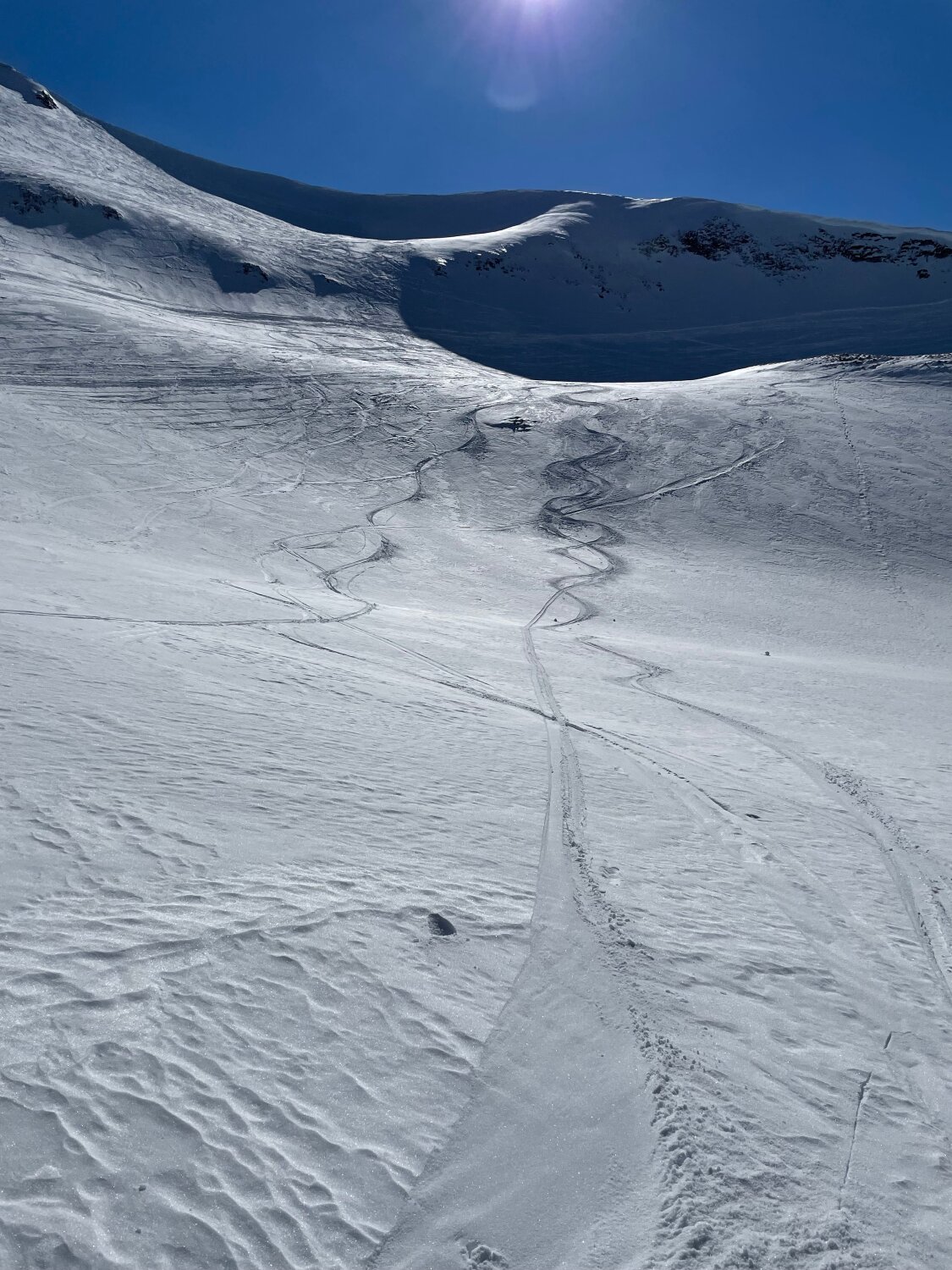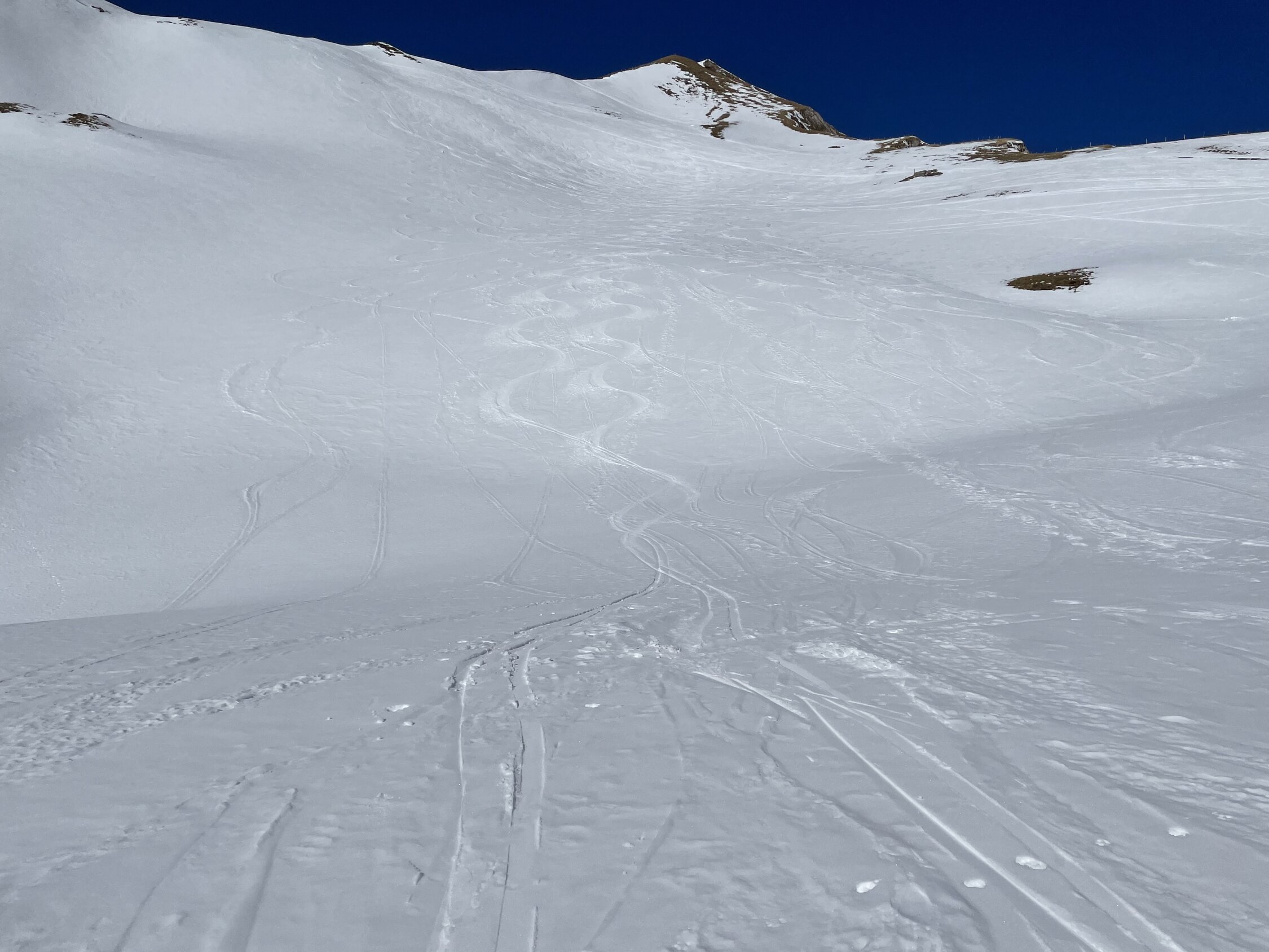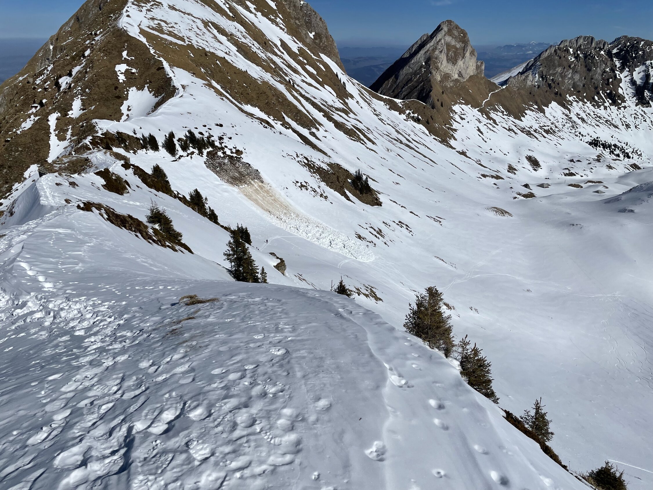 Kurz nach 12 ist ein Gleitschneerutsch aus der Ostflanke des Verbindungsgrates Schibespitz-Gantrisch auf den Weg vom Leiterlipass zum Schibespitz runtergegangen. Zum Glück war auf der Aufstiegsspur gerade niemand mehr unterwegs. Siehe Bild