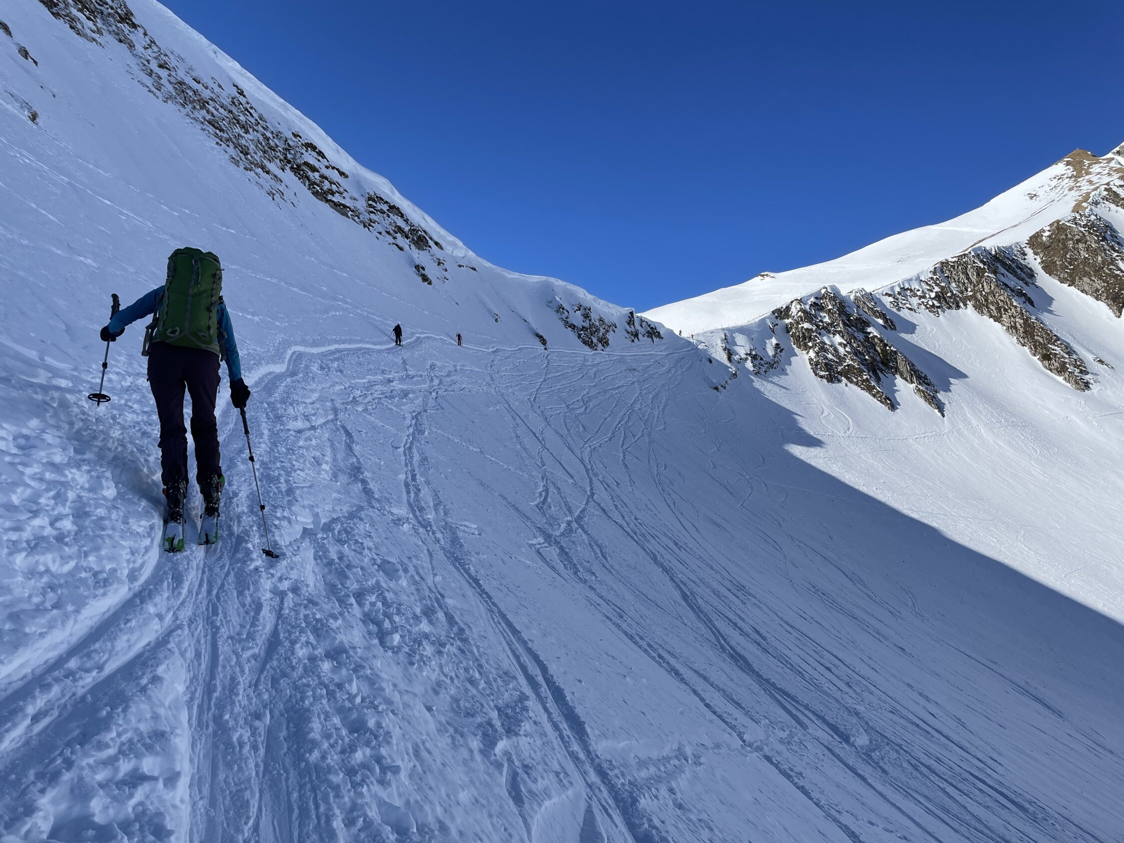 Genug Schnee von zuunterst bis fast zum Gipfel Bürgen. Morgetenpass gute Spur. Gipfelhang im Aufstieg mit Ski kein Problem. Abfahrt Richtung obriste Morgete schon fast Sulz - ein schön feiner Teppich.