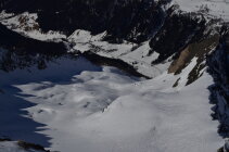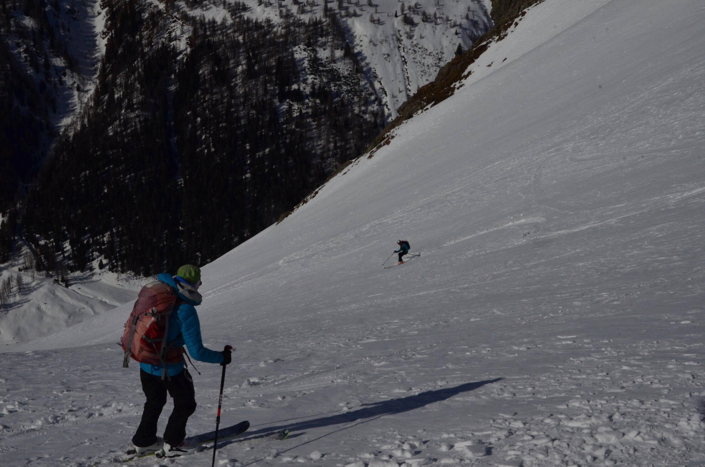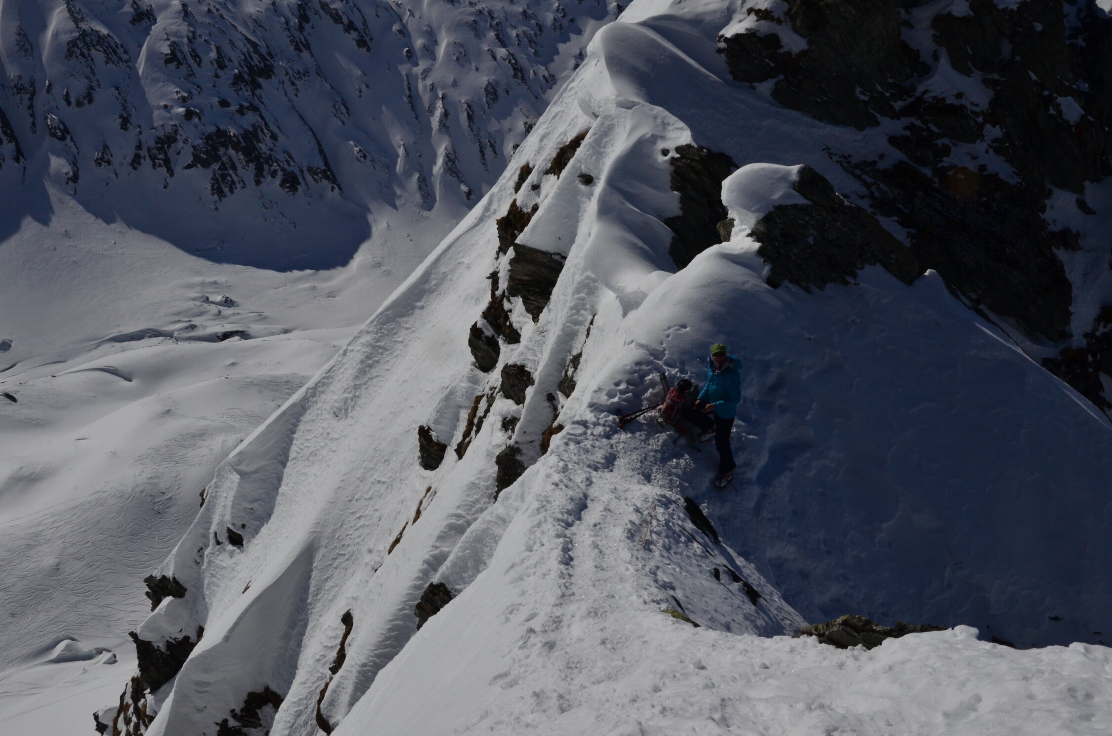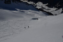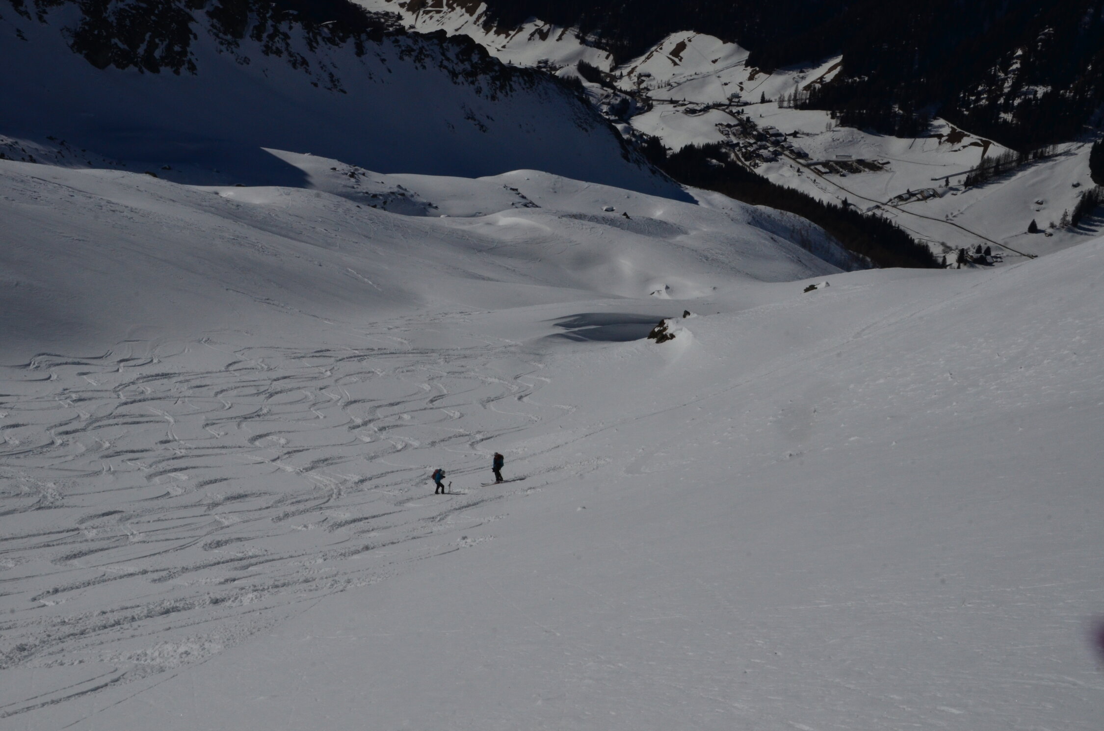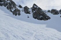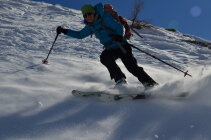 Sehr gute Bedingungen. Der Schnee allerdings ist wieder windverblasen und variiert stark von schweren Pulver, plattig, harschig, hart und wieder etwas Pulver.
