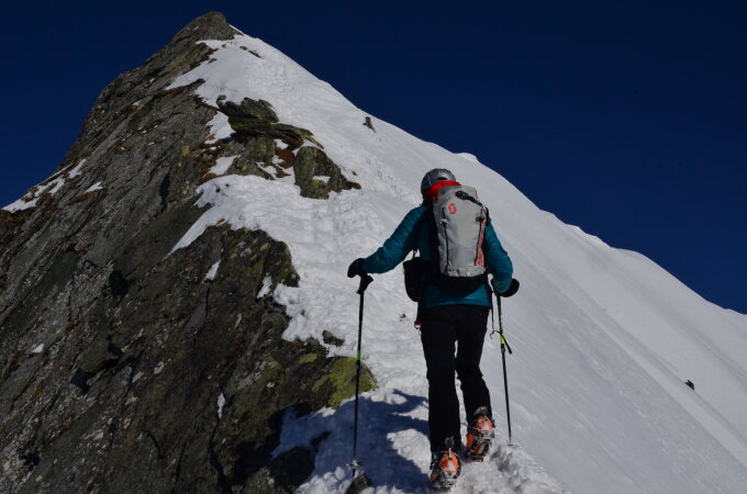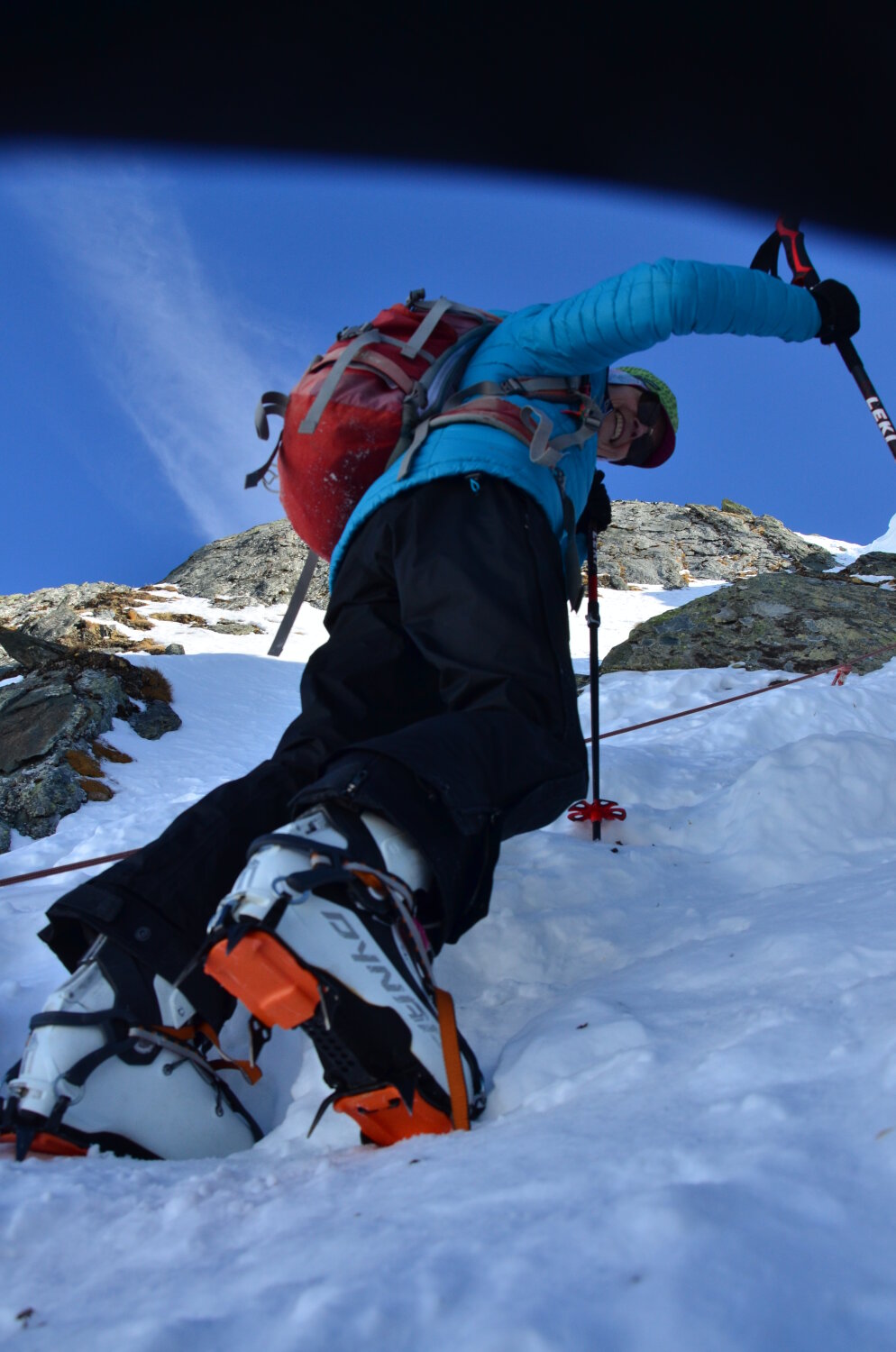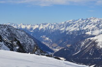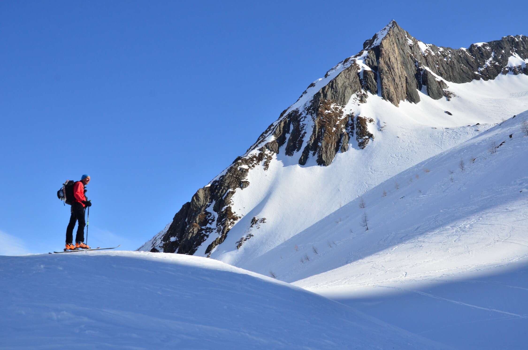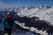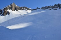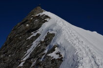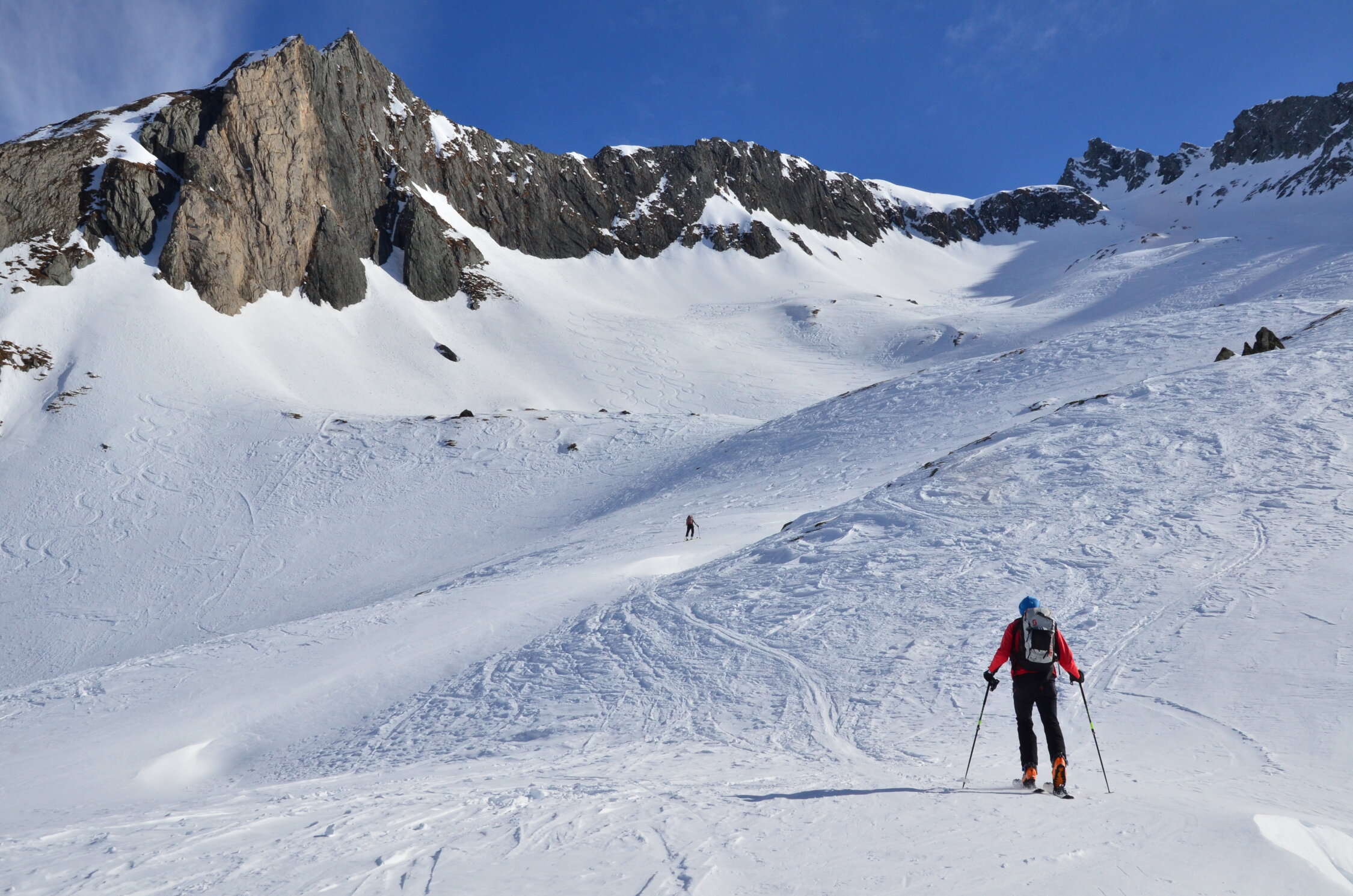 Sehr gute Bedingungen. Der Schnee allerdings ist wieder windverblasen und variiert stark von schweren Pulver, plattig, harschig, hart und wieder etwas Pulver.