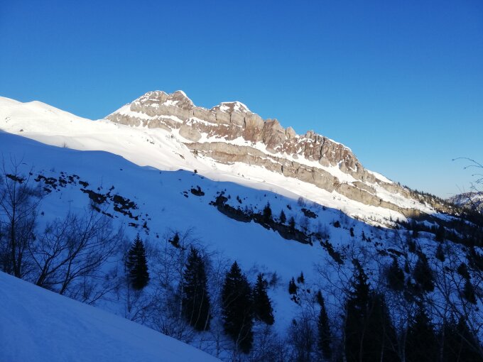 Bis Hüttenboden noch Pulverschnee, aber sehr zerfahren.Von Lang Egg ruppig. Strasse bis Schwarzenbach Piste. Bleibt bei diesem Wetter/Temperaturen gleich. Immer noch lohnendes Gipfelziel.