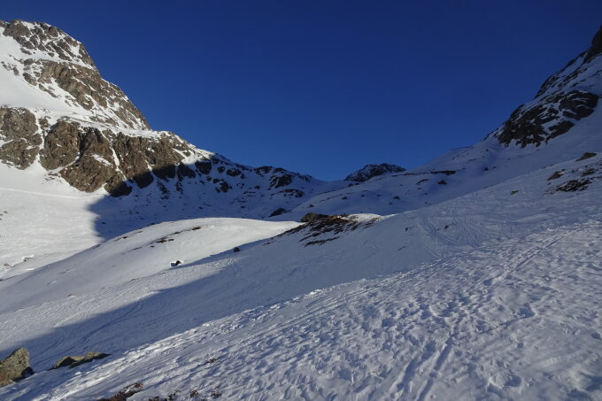 In der Abfahrt fanden wir direkt unterhalb der Fuorcla noch Pulverschnee (teilweise etwas decklig), danach Bruchharsch und unten gut fahrbaren Hartschnee. Im unteren Teil fehlt der Schnee und man muss sich den Weg etwas suchen.