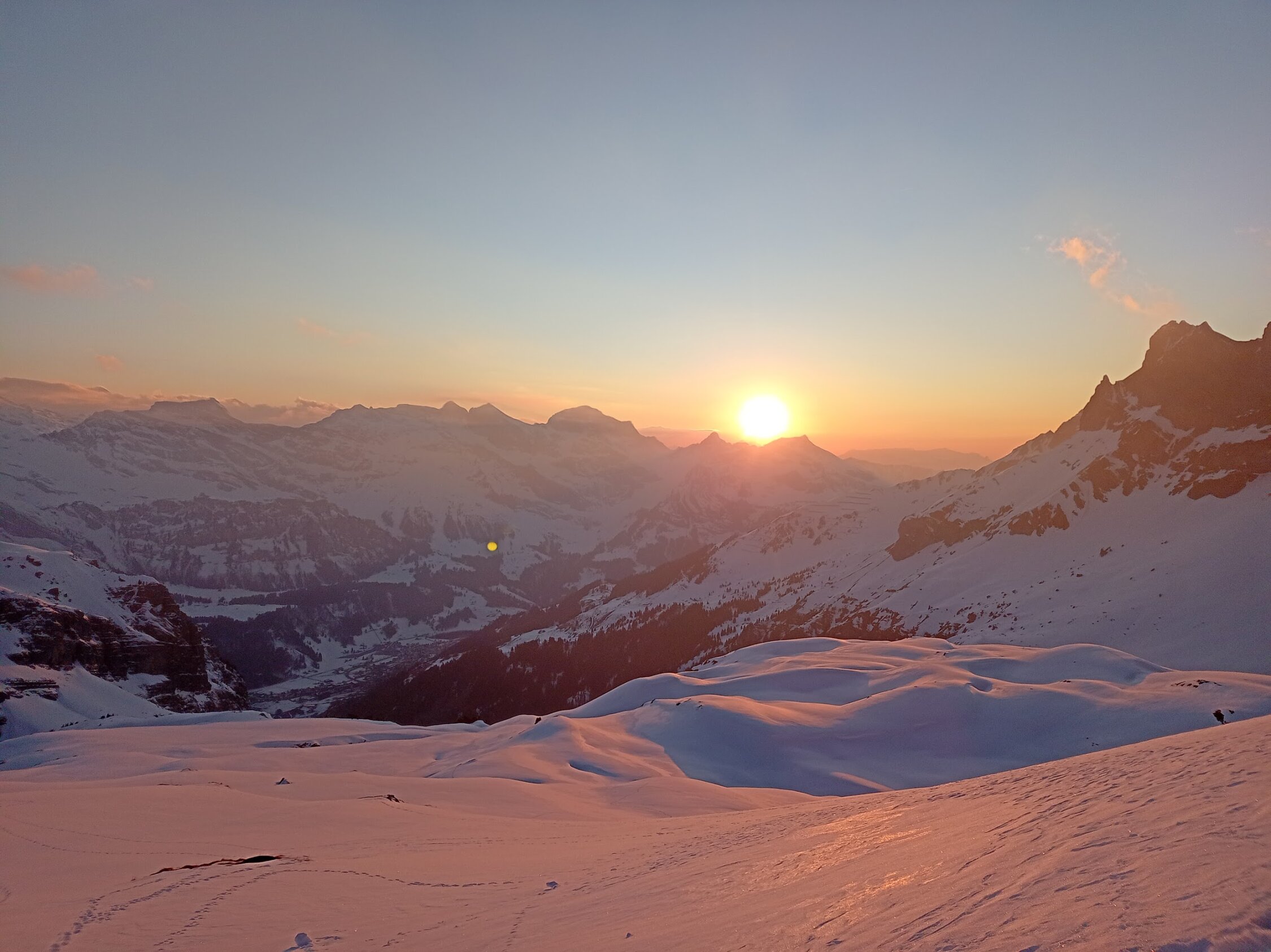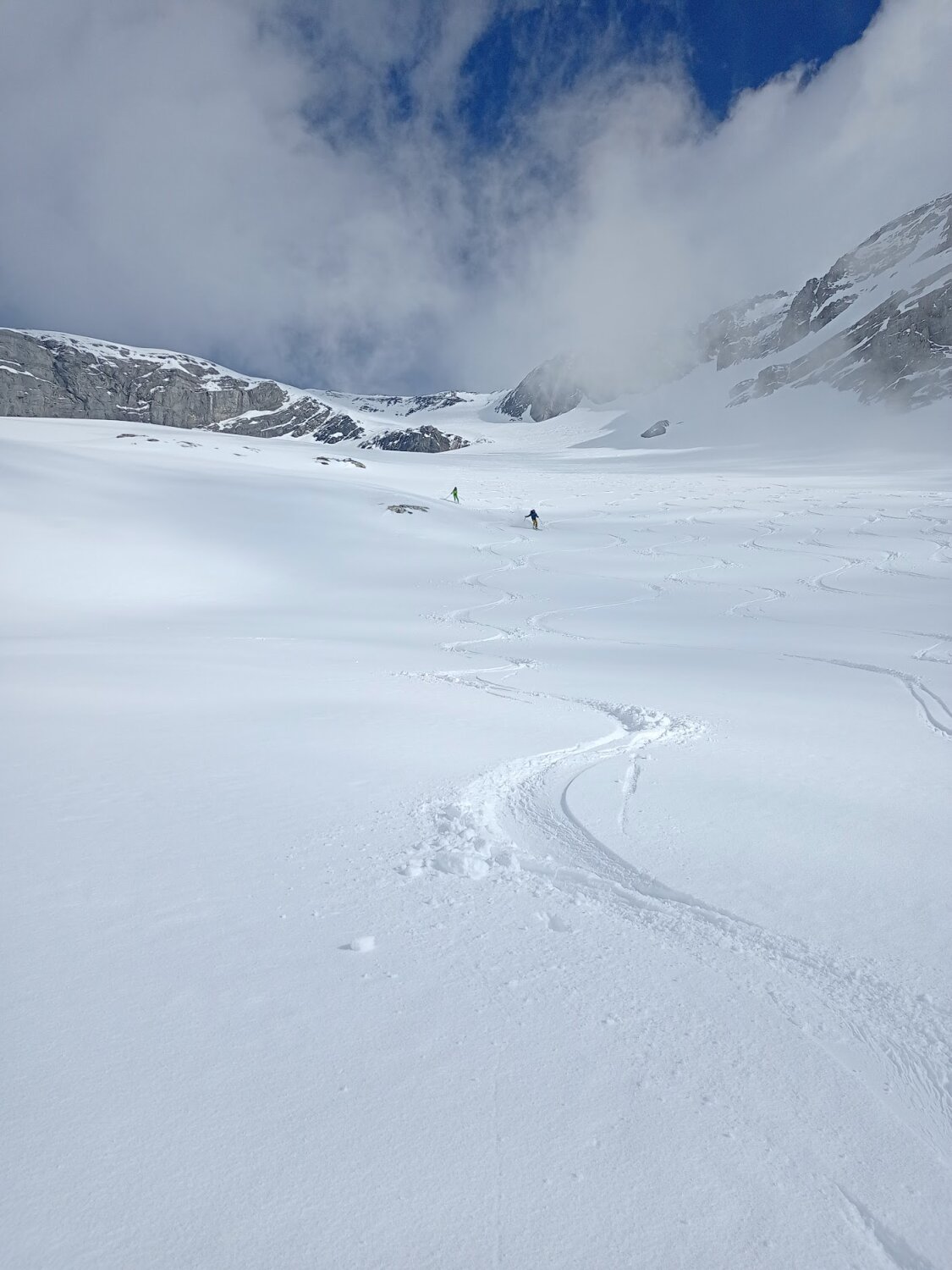 Abfahrt Richtung Rugghubelhütte im oberen Bereich noch hart.Es hatte erst wenige Spuren. Unterer Bereich bis zum Hüttenaufstieg wunderbarer Pulver. Leider war es nicht durchgehend sonnig und so mussten wir die vorüberziehenden Wolken abwarten bis die Sicht frei war.