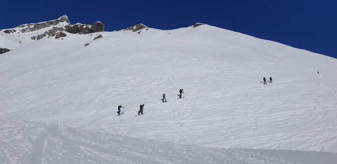 Start der Tour am 9.30 Uhr bei kalten - 8 Grad, aber schon bald hatte man genug warm, am Ende des Waldes dann viel Sonne, gute Spur bis zum Skidebot , die letzten Meter noch kurzer Fussaufstieg zum Gipfel.