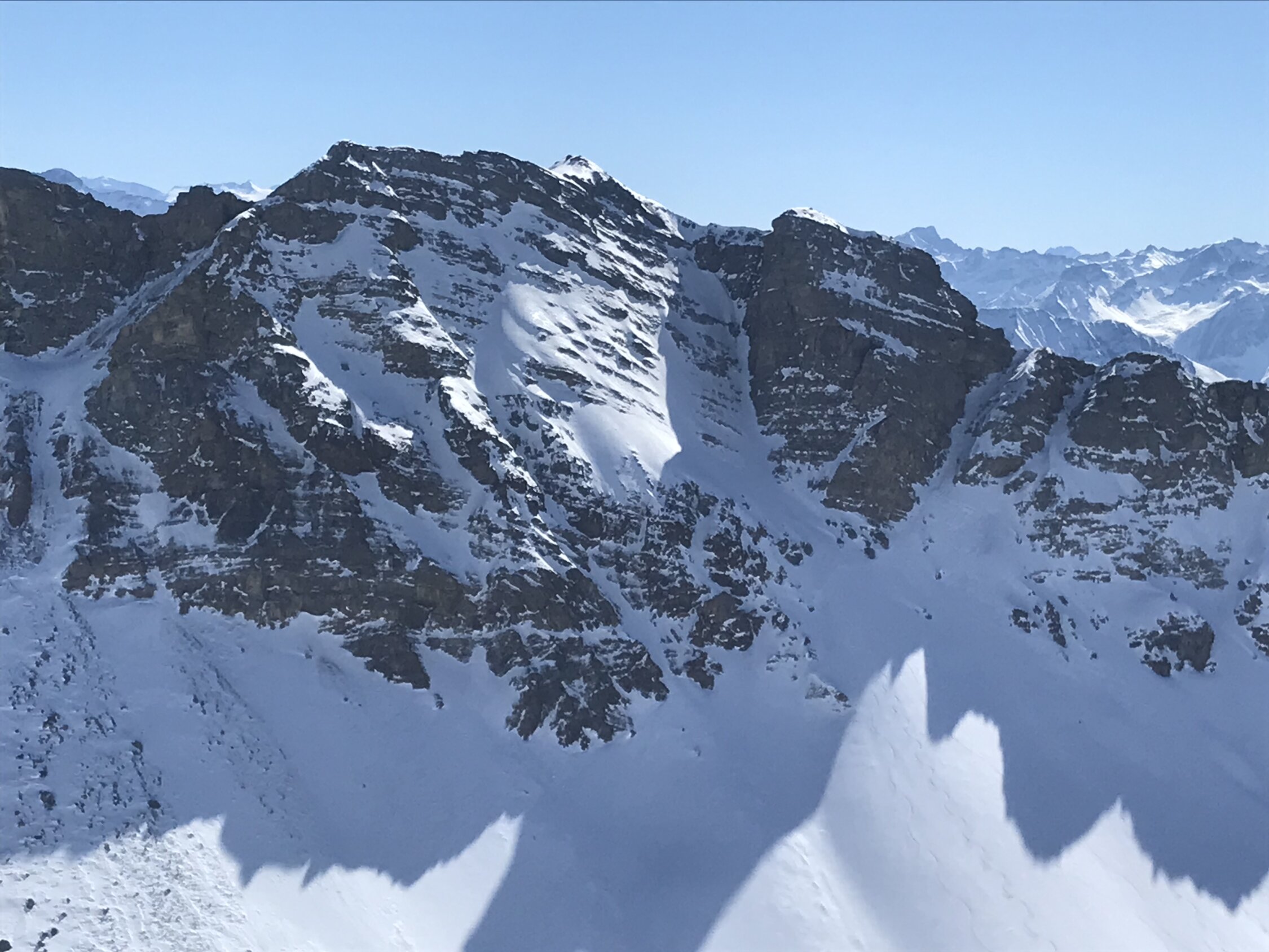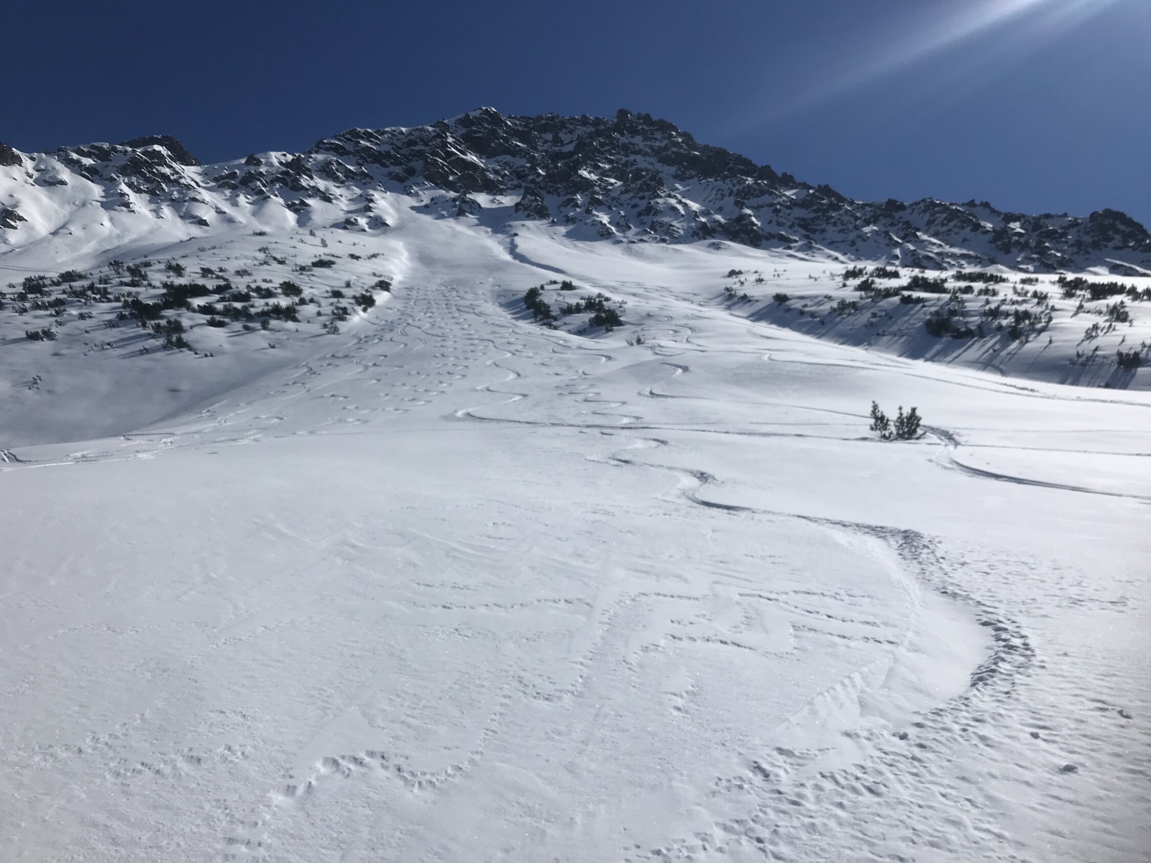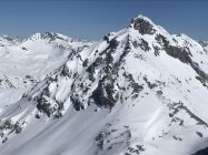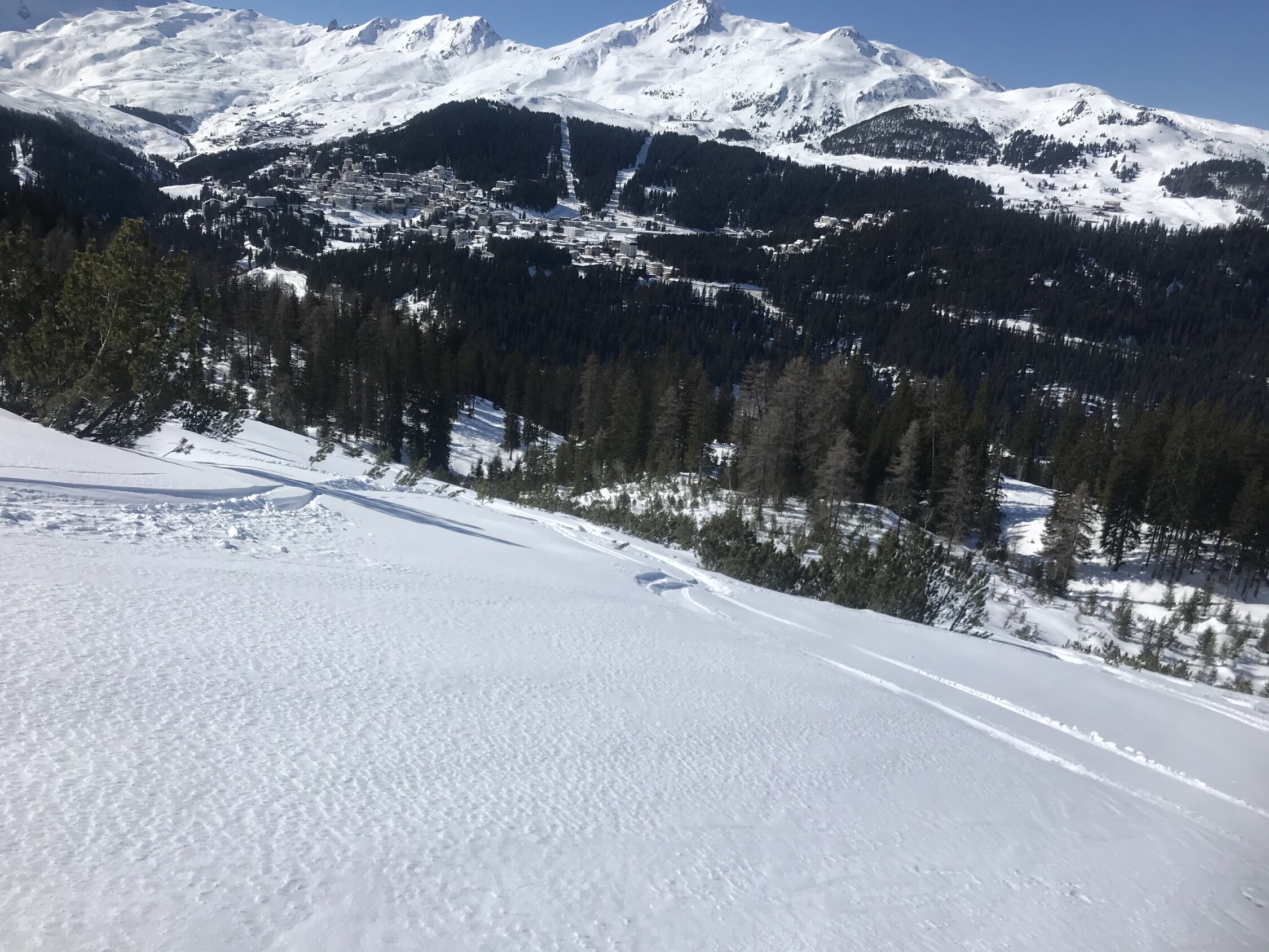 Abfahrt via Nordwestflanke: zuoberst ca. 20 hm war wenig Schnee, entweder ist da irgendwann eine Lawine abgegangen oder aufgrund der starken Winde während der letzten Schneefallperiode hat er sich dort nicht abgelagert. Wie dem auch sei, darunter super Pulver - ein Hochgenuss - bis zur Waldgrenze. Besser geht kaum!! Durch den lichten Hochwald ebenfalls schön zu fahren und hinab zum Stausee.