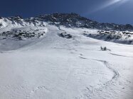 Gute Verhältnisse im Aufstieg, im anhaltend steilem Gipfelhang sind Harscheisen angenehm.
