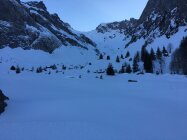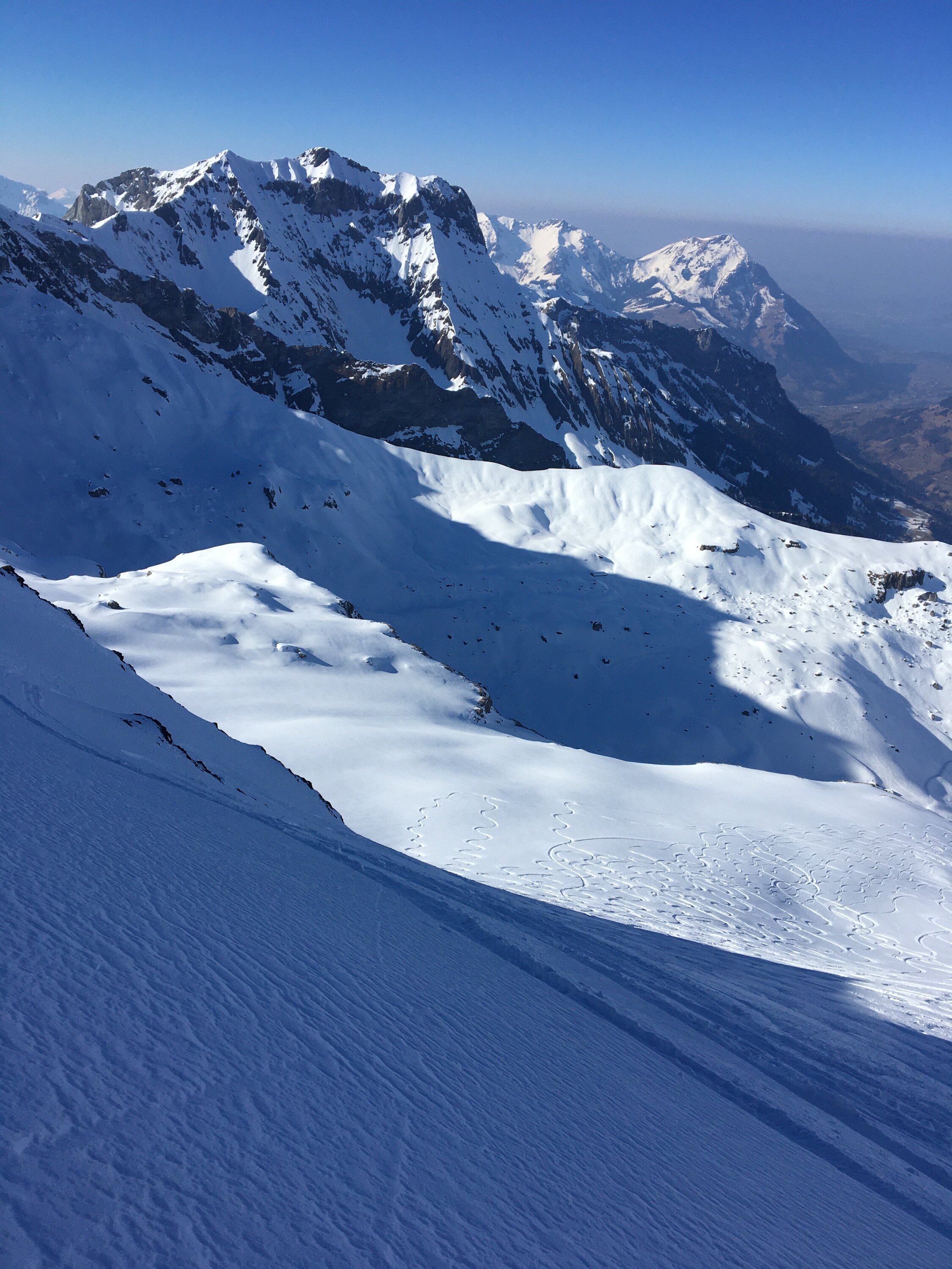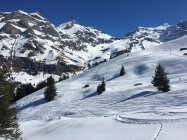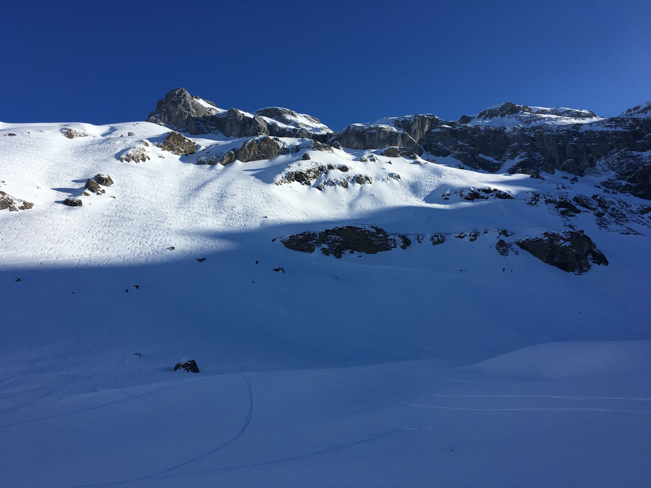 Abfahrt via Nordflanke - Bärentritt. Auch dort eigentlich schöner Pulver - aber schon ziemlich zerfahren - in Randbereichen hat es noch etwas Platz gehabt.