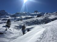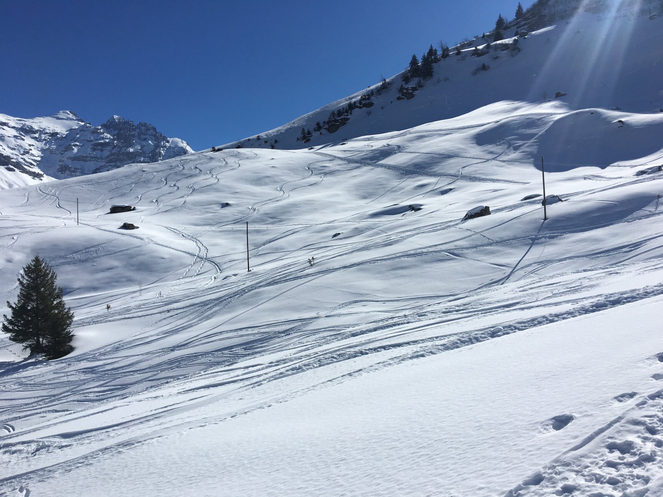 Unterhalb Bärentritt das gleiche Bild. Schöne Pulverschwünge sind z.T. in Randbereichen noch möglich.. ansonsten halt etwas verspurter Pulver.