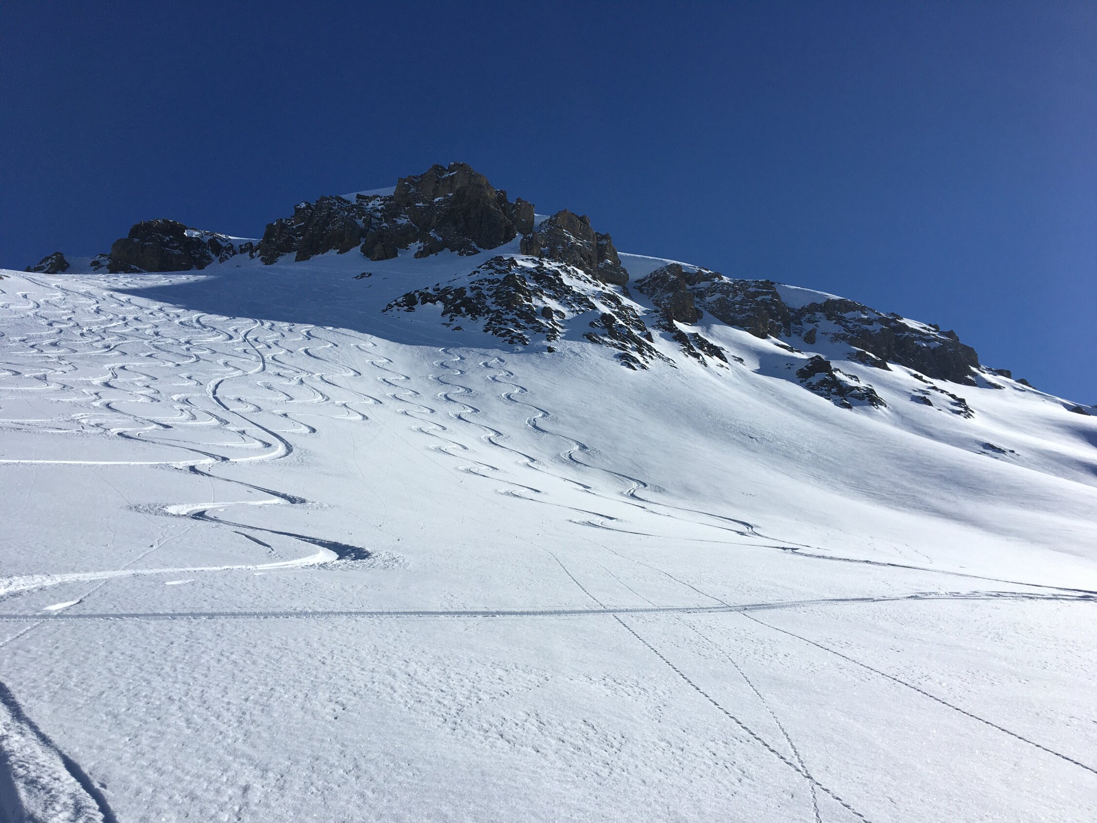 Im oberen Bereich hier noch schöner Pulver aber ab Chazenegg dann teilweise gedeckelt, alter Lawinenschnee oder zerfahren und nur noch wenige Schwünge im Pulver möglich.